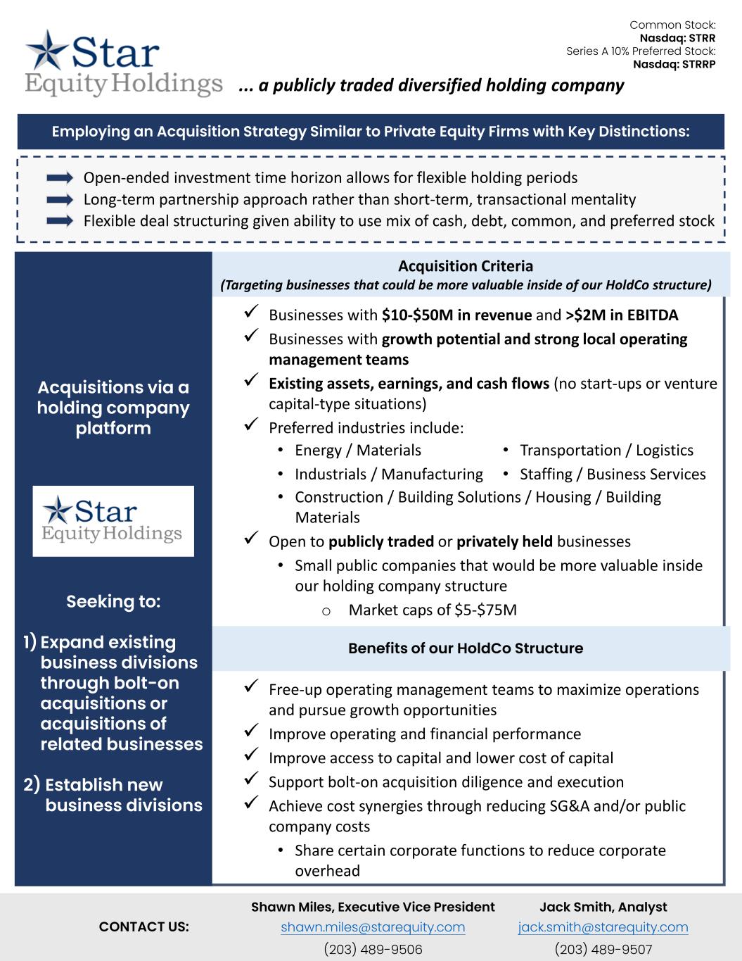 5 Capital Structure & Valuation Metrics (1) Includes restricted cash and $5.0M net receivable from brokers. (2) Pro forma as of 06/30/2025. (3) Gross book value of real estate. (4) Excluding operating leases. (5) Based on liquidation preference of $10.00 per share. (6) As of 9/12/2025. (7) Estimated book value of common equity as of YE2025 (i.e., net of preferred stock at liquidation preference) based on Bloomberg consensus estimates. (8) Excluding operating leases. (9) Excluding operating leases, investments, real estate, and STRRP. Capital Structure Select Valuation Metrics Cash (1) (2) $27.7 M Real Estate (2) (3) $10.0 M Public Investments (2) $2.0 M Private Investments (2) $10.3 M Total Debt on Operating Businesses (2) (4) $14.3 M Cash less Debt ("Net Cash") (2) $13.4 M Preferred Stock (2) (5) $26.9 M Common Shares Outstanding (2) 3.5 M Stock Price (6) $9.37 Book Value ("BV") (7) $49.3 M Market Capitalization (6) $32.8 M Preferred Stock (2) (5) $26.9 M Cash less Debt ("Net Cash") (2) ($13.4) M Enterprise Value (a) (8) $46.3 M Preferred Stock (2) (5) ($26.9) M Investments (2) ($12.3) M Real Estate (2) (3) ($10.0) M Enterprise Value (b) (9) ($2.9) M 6 Star’s M&A Opportunity and Team Actively seeking both public and private acquisition opportunities to add to our already strong organic growth; Star’s internal team is equipped to handle all aspects of the investment life cycle from idea origination to deal close similar to teams at PE firms (1) Data from Bloomberg. (2) According to Ballard Spahr LLP. (3) According to the Kreischer Miller Family Business Survey. Public Company Opportunity Set • Over 4,000 public companies with less than $30M of EBITDA in the US (1) o Costs and complexities of being public keep rising o Star is a logical aggregator of select micro-caps, where public company and redundant overhead costs can be eliminated, increasing value for shareholders Private Company Opportunity Set • Large subset of high-quality, privately owned small businesses with ownership seeking an exit • Demographic trends such as the “Silver Tsunami” of baby boomer retirements suggest an increase in business ownership transitions o An est. 12 million baby boomers own private businesses in the U.S.; approx. 4 million have annual revenue of $5 - $100M (2) o ~45% of family-owned businesses lack a succession plan (3) Since 2022, Star’s M&A team has completed the following transactions: 1. 2023 sale of Digirad Health, Inc. to PE-owned TTG Imaging Solutions, LLC for $40M 2. Acquisition of three private companies: I. Big Lake Lumber (‘23), Timber Technologies (‘24), Alliance Drilling Tools (‘25) 3. Investment in Servotronics, Inc. (NYSE: SVT), generating ~340% return after being sold to NYSE: TDG 4. Investment in Superior Drilling Tools (NYSE: SDPI), which was acquired by NASDAQ: DTI Star’s M&A Team includes: 1. STRR management (see slide 9) 2. Three financial / research analysts 3. In-house legal team 7 • Businesses with $10-$50M in revenue and >$2M in EBITDA • Businesses with growth potential and strong local operating management teams • Existing assets, earnings, and cash flows (no start-ups or venture capital-type situations) • Open to publicly traded or privately held businesses o Small public companies that would be more valuable inside our holding company structure • Either platform companies with possible future bolt-on acquisition targets or bolt-ons for existing Star operating businesses Acquisition Criteria: • Look for situations where acquisition target is more valuable inside Star • Free-up operating management teams to maximize operations and pursue growth opportunities • Improve operating and financial performance • Improve access to capital and lower cost of capital • Support bolt-on acquisition diligence and execution for operating companies • Achieve cost synergies through reducing SG&A and/or public company costs o Share certain corporate functions to reduce corporate overhead Acquisition Objectives: Existing Star Verticals: • Construction / Building Solutions / Housing / Building Materials • Staffing / Business Services • Energy Services Potential New Verticals for Star: • Transportation / Logistics • Industrials / Manufacturing • Materials • NO start-ups or VC-type situations Preferred Industries Include: Star’s M&A Strategy 8(1) Public activism efforts are not always in pursuit of acquisition. Differentiated Corporate Strategy and Structure 1 Scale quickly and profitably through organic growth 3 5 Have a long-term partnership approach rather than short-term transactional one 2 4 Have flexible holding periods thanks to an open- ended investment time horizon 6Be a logical aggregator of select microcaps that fit Star’s acquisition criteria Similar to private equity, but with key distinctions allowing Star to: Leverage a mix of cash, debt, and common & preferred stock to offer flexible deal structures to counterparties Pursue both private and public acquisition targets, sometimes through activism (1) Medium-term Goals (~5-year) 1. Outperform the Russell 2000 Index 2. Get added to the Russell 2000 Index