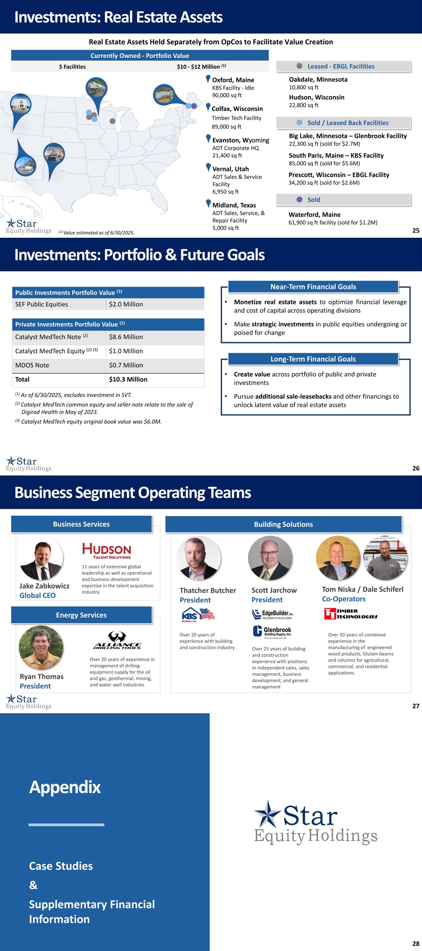 21 Interim Goal #1 Longer-Term Goal #2 $100 million $200 million $20 million $50 million Adj. Net Revenue Adj. EBITDA Hudson Talent Solutions Performance Goals: Can be achieved organically in the next few years Timeline could be accelerated significantly by partnering with a growth capital provider o At $200 million of adjusted net revenue, Hudson Talent Solutions could generate ~$50 million of adjusted EBITDA o An external growth capital investment could be a “win-win-win” for a future capital provider, the Hudson Talent Solutions management team, and Star shareholders Business Services: Future Goals 22 Alliance Drilling Tools (“ADT”) is a drilling equipment company engaged in the rental, sale, and repair of downhole tools Energy Services: Overview Sales, Service & Logistics (Casper, WY) ADT’s facilities are located in two key markets: Water Wells Mining Geothermal Oil & Gas Corporate HQ (Evanston, WY) Sales & Service (Vernal, UT) Rocky Mountain Region ~60% of 2024 Revenue Sales, Service, Repair & Rebuild (Midland, TX) Texas ~40% of 2024 Revenue ADT serves the following end-markets:• Unique business model providing mission-critical products and high-margin sales • Operates in highly specialized industry with high barriers to entry • Diversified revenue streams, client base, and geographic footprint 23 Revenue Breakdown Energy Services: Revenue Breakdown and Goals Rentals Sales Services Replacements 0% 10% 20% 30% 40% 50% 60% 70% 2023 2024 June 2025 YTD Revenue Streams (% of Total Revenue) (1) June 2025 TTM revenue breakdown. 73% 27% Oil & Gas Mining, Waterwells, and Geothermal Revenue by End-Market (1) Long-Term Financial Goals ✓ Strategic investments to meet rising demand for ADT’s services, expand its operational capacity, service more rigs, and unlock substantial revenue potential ✓ Seeking bolt-on acquisitions Near-Term Financial Goals Goal of scaling to $10M+ in Adj. EBITDA Division-wide High single-digit annual revenue growth 24 Private Investments • Star Equity Investment Holdings retains private company debt and minority equity interests • Makes strategic investments including potential acquisition targets or JV partners Investments: Overview Real Estate • Owns, manages, and finances real estate assets of operating companies • Negotiates standalone financing to optimize financial leverage and cost of capital • Executes sale-leaseback transactions on owned real estate when attractive to do so Public Investments • Star Equity Fund manages public equity portfolio • Focuses on impact investments to unlock latent value • Could use activist approach in certain situations • Makes strategic investments including potential acquisition targets or JV partners Estimated Value $10 - $12M (1) Estimated Value $10 - $15M (1) (2) Portfolio Value $2.0M (1) (1) As of 6/30/2025, and evaluated quarterly. (2) Lower end of valuation is book value as of 6/30/2025; higher end includes original (unimpaired) value of Catalyst Equity.