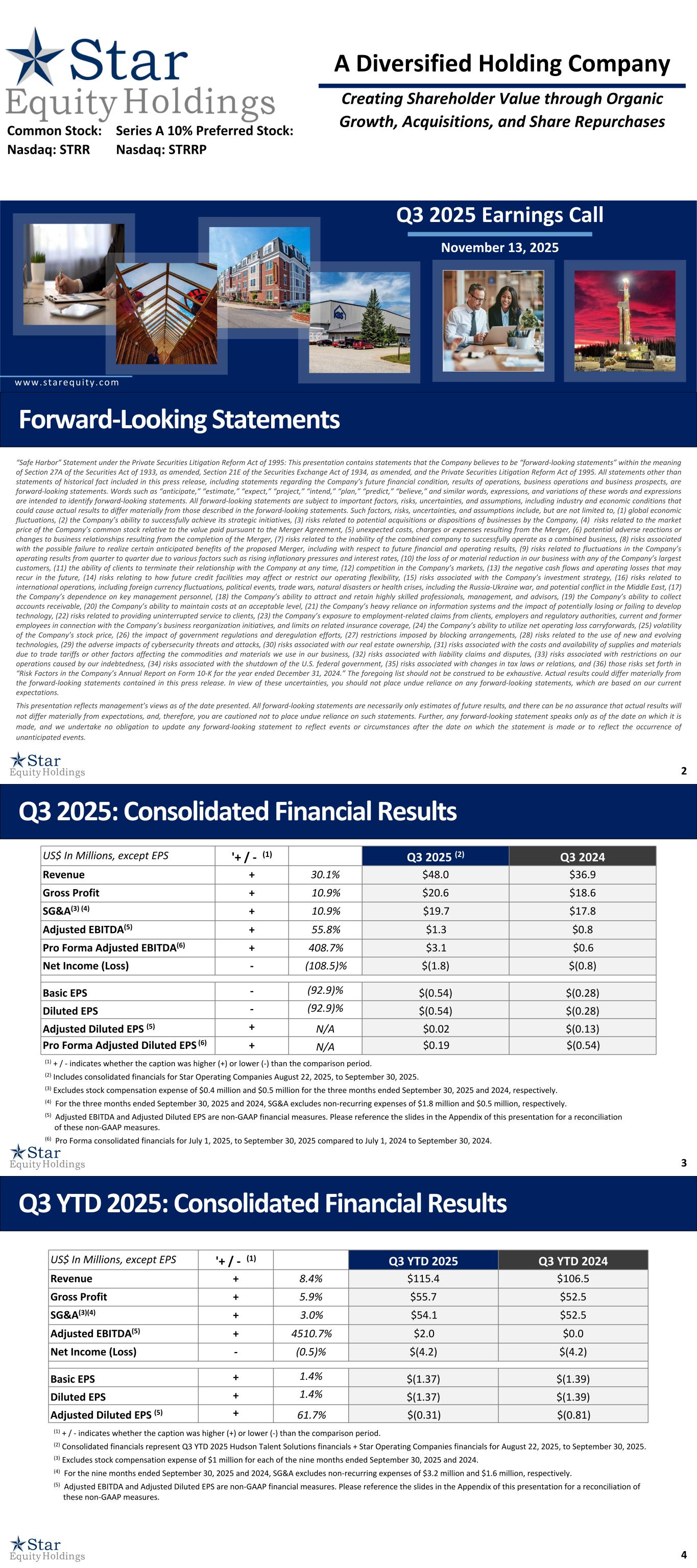 OLD GREENWICH, CT - November 13, 2025 - Star Equity Holdings, Inc. (Nasdaq: STRR and STRRP) ("Star" or the "Company") formerly, Hudson Global, Inc. (Nasdaq: HSON and HSONP), a diversified holding company, announced today financial results for the third quarter ended September 30, 2025.