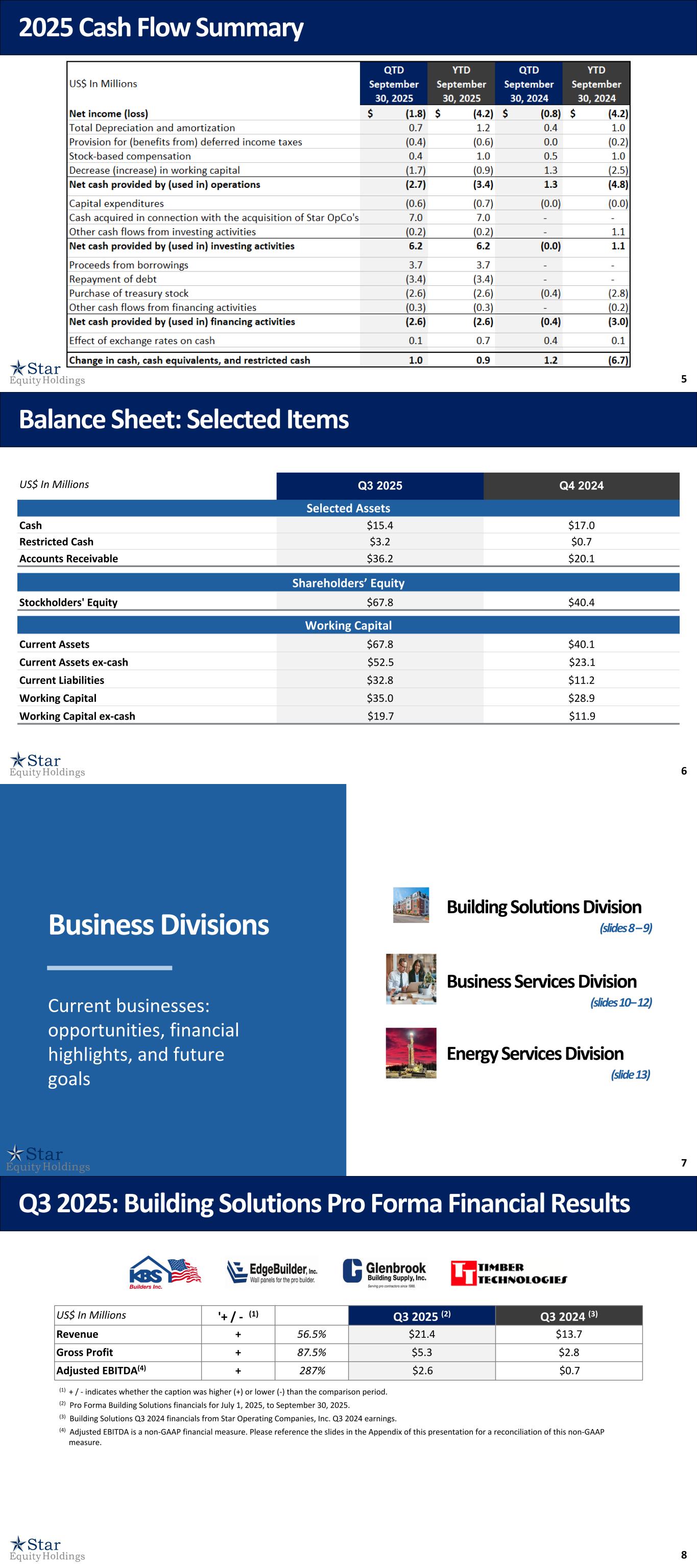 (1) Pro forma Building Solutions, Energy Services, and Investments results for the full third quarter of 2025 as opposed to August 22, 2025 through September 30, 2025. These results are compared to Building Solutions and Investments division results from Star Operating Companies, Inc. for the third quarter of 2024. No comparison is provided for Energy Services as that division did not exist at Star Operating Companies, Inc. until March 2025.