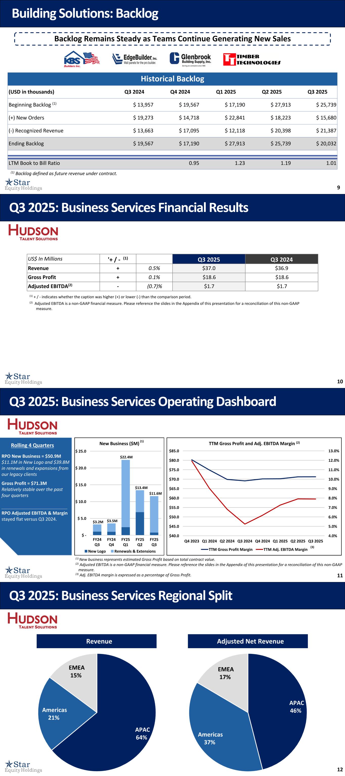 (1) Pro forma Building Solutions and Energy Services results for the full third quarter of 2025 as opposed to August 22, 2025 through September 30, 2025. These results are compared to Building Solutions division results from Star Operating Companies, Inc. for the third quarter of 2024. No comparison is provided for Energy Services as that division did not exist at Star Operating Companies, Inc. until March 2025.