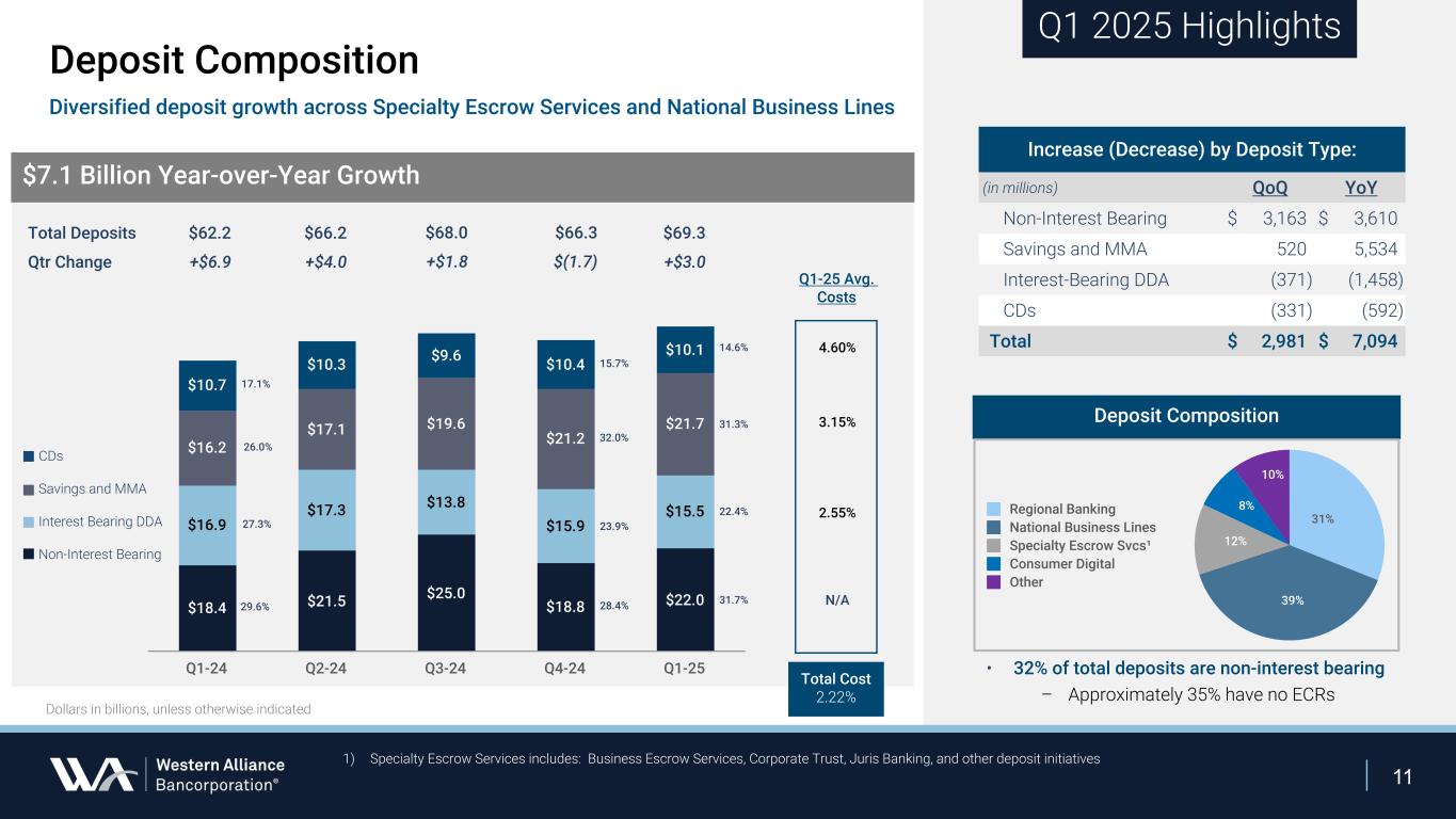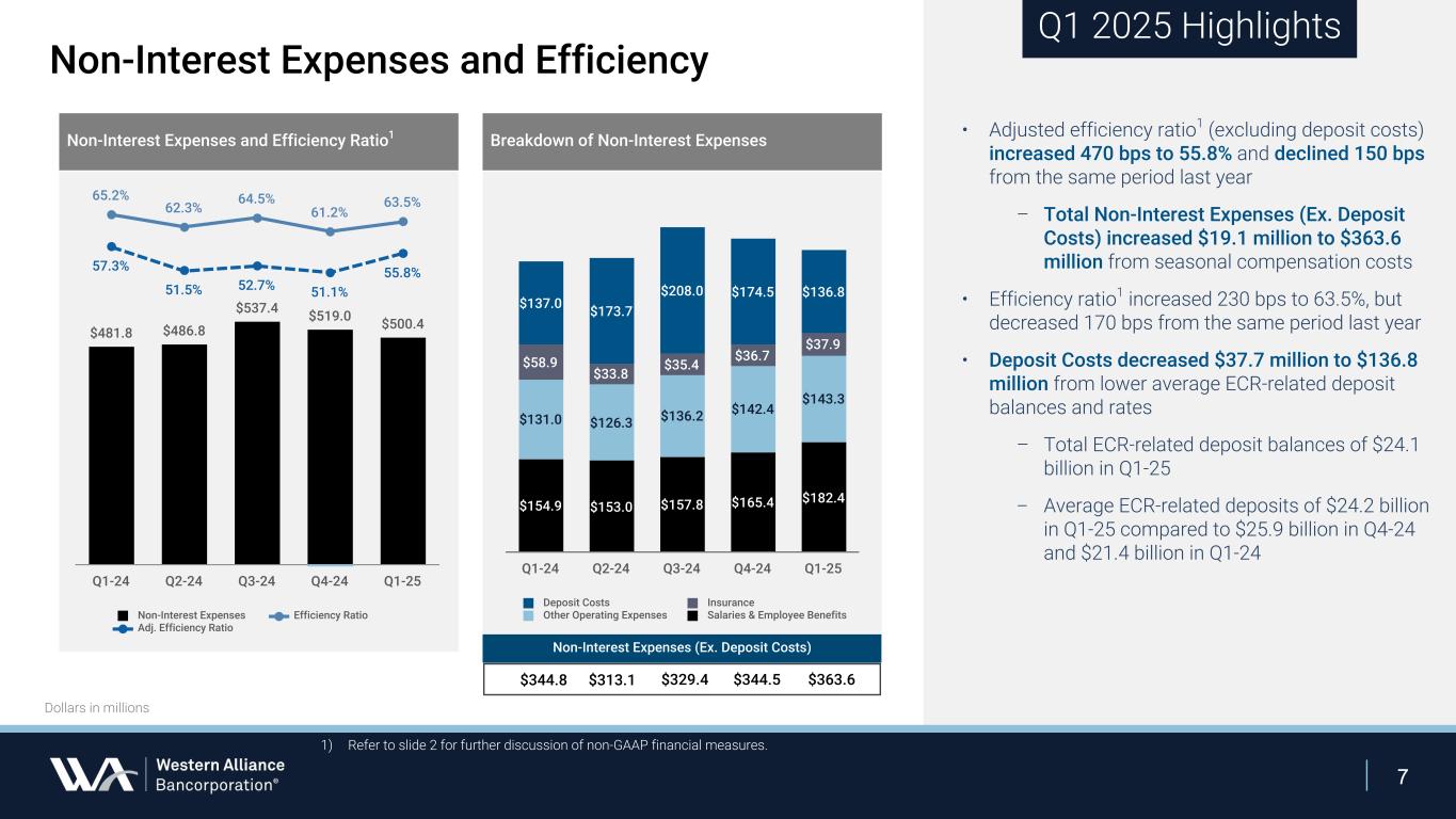 非金利費用は、2024 年第 4 四半期の 5 億 1,900 万ドルに対し、2025 年第 1 四半期は 5 億 540 万ドル、2024 年第 1 四半期は 4 億 8,180 万ドルでした。非金利費用が 2024 年第 4 四半期から 1,860 万ドル減少したのは、主に ECR 金利の低下により預金費用が 3,770 万ドル減少したことによるものですが、給与および従業員給付の 1,700 万ドルの増加により一部相殺されました。2024 年第 1 四半期からの非金利費用の 1,860 万ドルの増加は、主に給与および従業員給付が 2,750 万ドル、データ処理費用が 920 万ドル増加したことによるものです。これらの増加は、2024 年第 1 四半期に認識された FDIC 特別評価費用 1,760 万ドルに大きく関連する保険費用の 2,100 万ドルの減少により一部相殺されました。預金コスト調整後1 の効率性比率は、2024 年第 4 四半期の 51.1%に対して、2025 年第 1 四半期は 55.8%、2024 年第 1 四半期は 57.3%でした。
