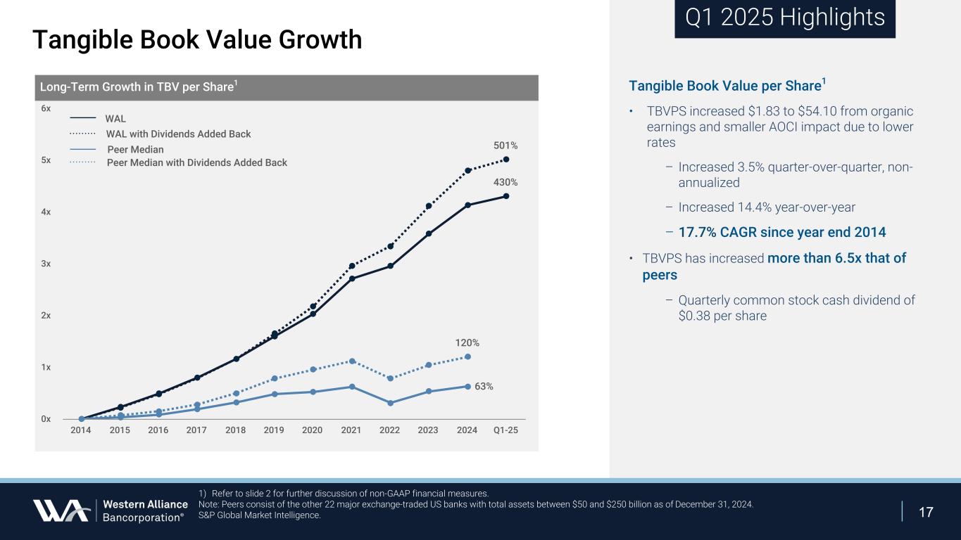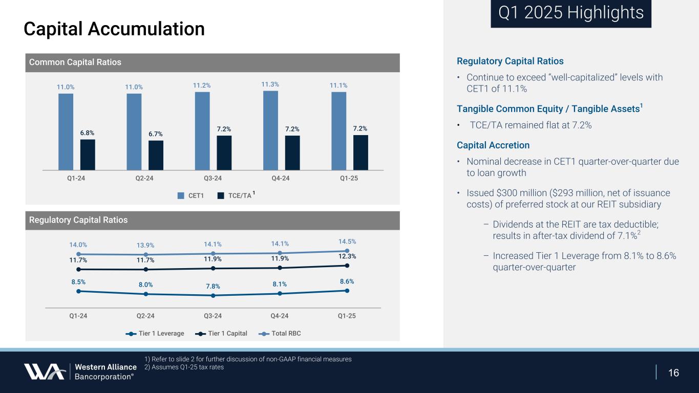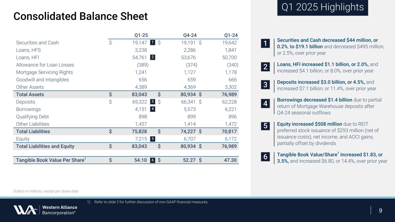 | 「ウエスタン・アライアンスは、2024 年のバランスシート再構築の完了後、貸出金と預金の継続的な増加に牽引され、第 1 四半期は堅調な業績を達成しました。「また、資本と流動性を強化することで、事業の勢いと慎重な信用リスク管理を維持することができます。当四半期の貸出残高と預金残高はそれぞれ11億ドルと30億ドルの増加基調を維持し、PPNR¹ は2億7,760万ドルとなった。資産の質は安定しており、不良資産は総資産の 0.60%に減少し、正味貸倒引当金は平均貸出金の 0.20%に減少した。全体として、2025 年度第 1 四半期の当期純利益は 1 億 9,910 万ドル、1 株当たり利益は 1.79 ド ルとなり、有形普通株式利益率1 は 13.4%となりました。1株当たり有形純資産価値1 は前年同期比14.4%増の54.10ドル、CET1比率は11.1%でした。 |