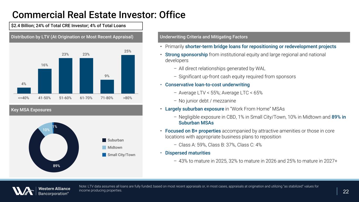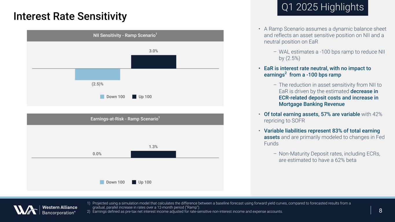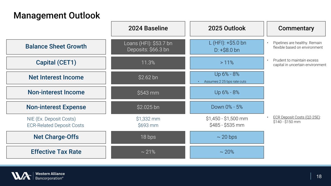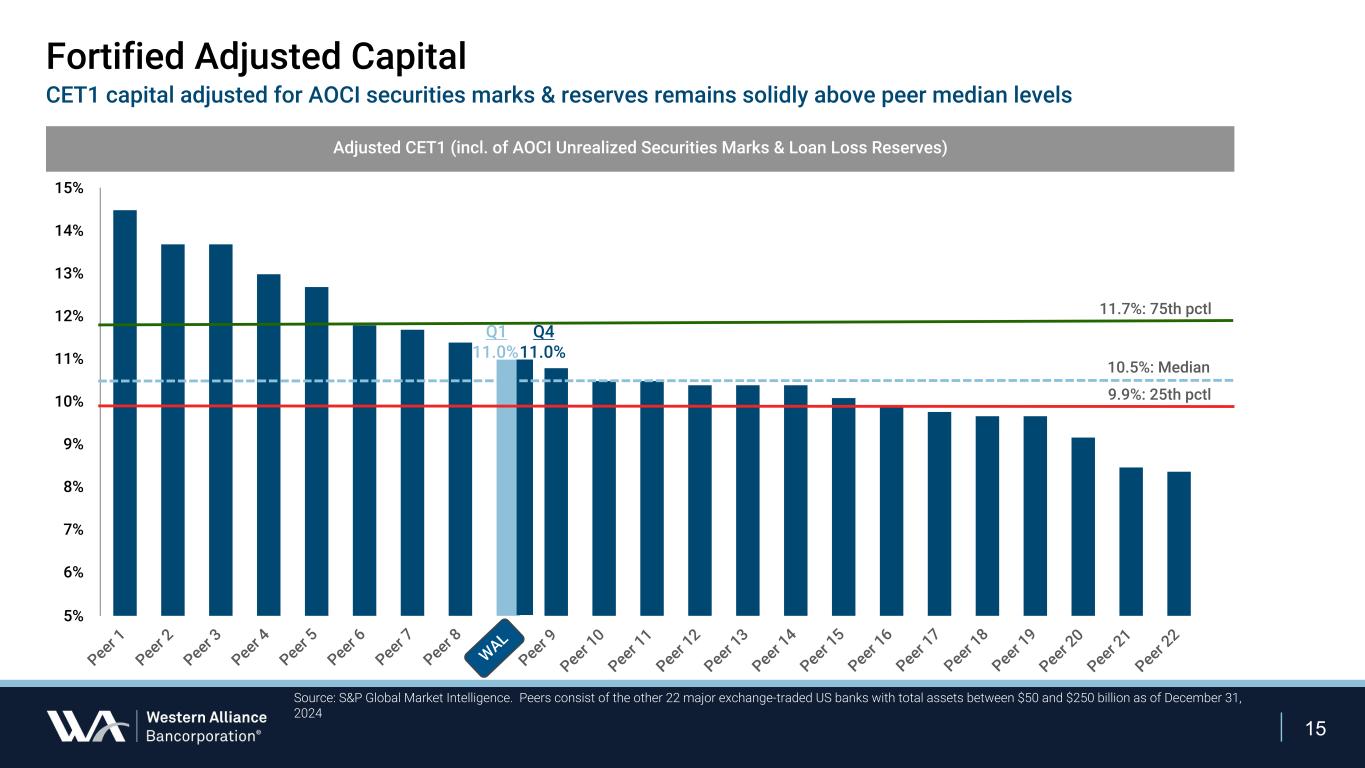 | 「ウエスタン・アライアンスは、2024 年のバランスシート再構築の完了後、貸出金と預金の継続的な増加に牽引され、第 1 四半期は堅調な業績を達成しました。「また、資本と流動性を強化することで、事業の勢いと慎重な信用リスク管理を維持することができます。当四半期の貸出残高と預金残高はそれぞれ11億ドルと30億ドルの増加基調を維持し、PPNR¹ は2億7,760万ドルとなった。資産の質は安定しており、不良資産は総資産の 0.60%に減少し、正味貸倒引当金は平均貸出金の 0.20%に減少した。全体として、2025 年度第 1 四半期の当期純利益は 1 億 9,910 万ドル、1 株当たり利益は 1.79 ド ルとなり、有形普通株式利益率1 は 13.4%となりました。1株当たり有形純資産価値1 は前年同期比14.4%増の54.10ドル、CET1比率は11.1%でした。 |