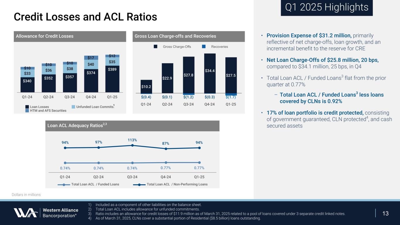 2025年第1四半期の貸倒引当金繰入額は3,120万ドルで、2024年第4四半期の6,000万ドルから2,880万ド ル減少し、2024年第1四半期の1,520万ドルから1,600万ドル増加しました。2025年第1四半期の貸倒引当金繰入額は、主に2,580万ドルの正味償却額と貸出金の増加、およびCREと建設ポ ートフォリオの質的調整の増加を反映しています。