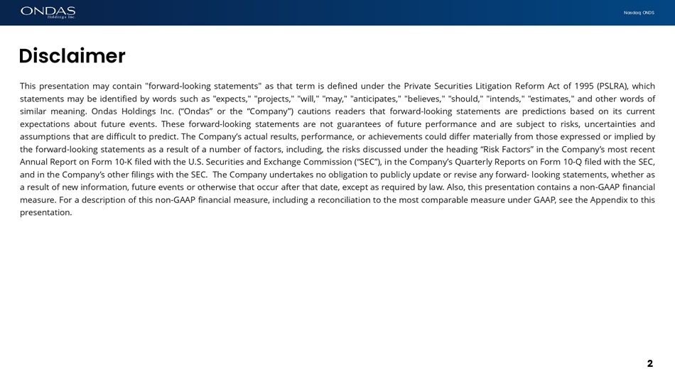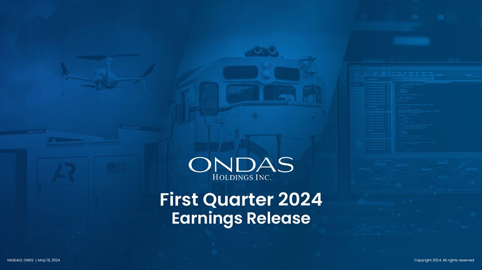 2024 年 5 月 15 日、オンダスホールディングス株式会社(以下「当社」)は、2024 年 3 月 31 日に終了した第 1 四半期の決算を発表するプレスリリースを発表した。このプレスリリースのコピーは、本フォーム 8-K カレント・レポートの別紙 99.1 として提出されています。2024 年 3 月 31 日に終了する第 1 四半期の業績に関する補足情報を含むスライド・プレゼンテーションは、本フォーム 8-K のカレント・レポートに別紙 99.2 として添付されています。