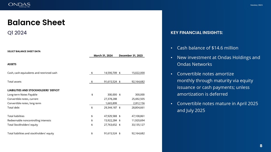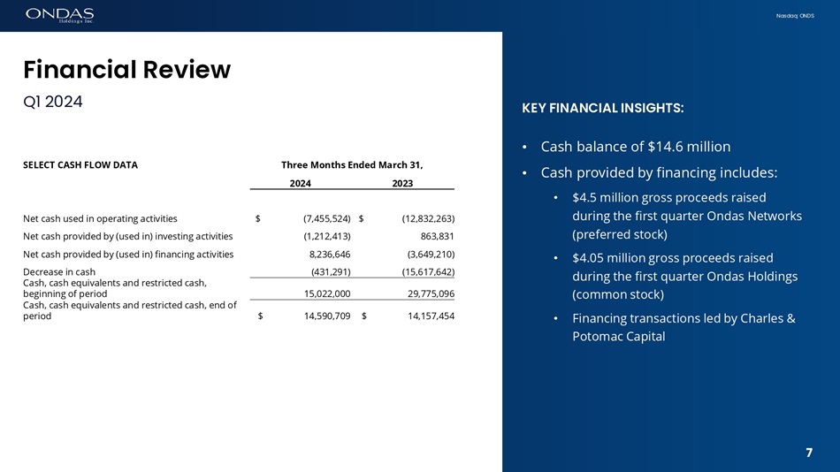 当社は2024年3月31日時点で約1,450万ドルの現金および現金同等物を保有しており、2023年12月31日時点の約1,500万ドルと比較してほぼ横ばいであった。運転資金を含む営業に使用された現金は、主にオンダスホールディングスの普通株式の売却による405万ドルの資金調達とオンダスネットワークスの優先株式の売却による450万ドルの資金調達によって相殺された。これらの資金調達による855万ドルの総収入は、オンダスホールディングスが一般的な運転資金として利用できるものである。
