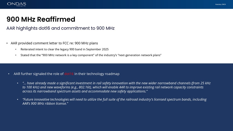 「オンダスネットワークスでは、重要な 900 MHz ネットワークのフィールド活動を進め、南西部の通勤鉄道に代わって販売パートナーからシステム全体の初期受注を獲得しました。これと並行して、システム統合活動も進め、レガシー900MHz帯の後方互換性とライブトラフィック運用をクラスI鉄道と成功裏に完了しました。第2四半期には、このシステムを新しい900MHz周波数帯に移行する計画が進行中であり、これが商業的な大量受注につながると考えています。これは、レガシー900 MHzネットワークの廃止を計画しているクラスI鉄道との重要なマイルストーンとなります。