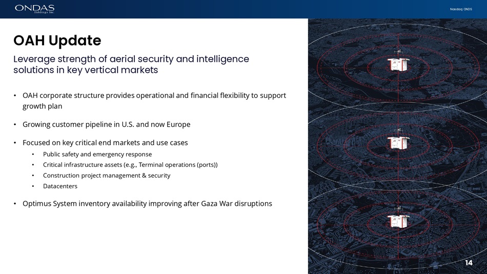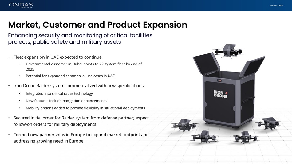 先週発表された最初の商業受注に結実したIron-Drone Raiderで創出した新たな機会に興奮しています。ストレスの多い国際的な安全保障情勢を鑑み、オンダスはオプティマスとアイアン・ドローンの両自律型プラットフォームにより、セキュリティ、データ収集・分析、新たなドローン迎撃能力で重要施設や国境を守るための重要な資産、専門知識、技術を保有していると確信しています。我々は、これらのプラットフォームを、ターゲットとする顧客、アプリケーション、販売パートナー、エコシステムパートナーとともにグローバルに拡大できるよう位置づけている。"