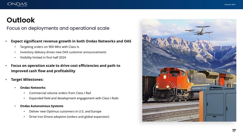 マサチューセッツ州マルボロ - 2024年5月15日 - 産業用プライベート・ワイヤレス・ネットワーク、商用ドローン、自動データ・ソリューションのリーディング・プロバイダーであるオンダス・ホールディングス・インク(Nasdaq: ONDS)(以下「オンダス」または「当社」)は、2024年3月31日に終了した第1四半期の財務および営業成績を発表した。