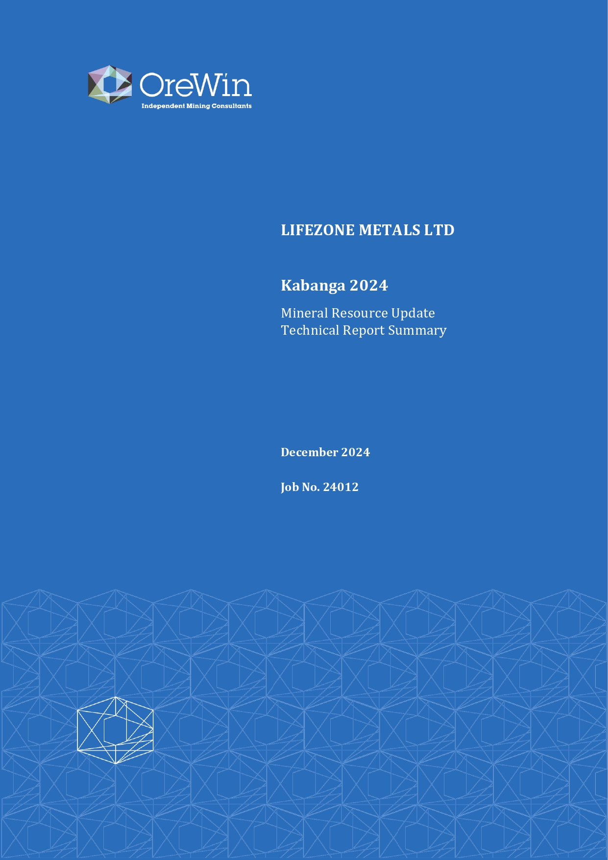 The Kabanga December 2024 Mineral Resource Update Technical Report Summary (2024MRU) with an effective date of December 4, 2024, has been prepared in accordance with the U.S. Securities and Exchange Commission (US SEC) Regulation S-K subpart 1300 rules for Property Disclosures for Mining Registrants (S-K 1300) for Lifezone Metals Ltd. on the Kabanga Nickel Project. The 2024MRU is a preliminary technical and economic study of the economic potential of the Project mineralization to support the disclosure of Mineral Resources. The Mineral Resource estimates are current as at December 4, 2024.