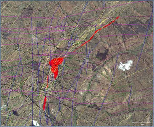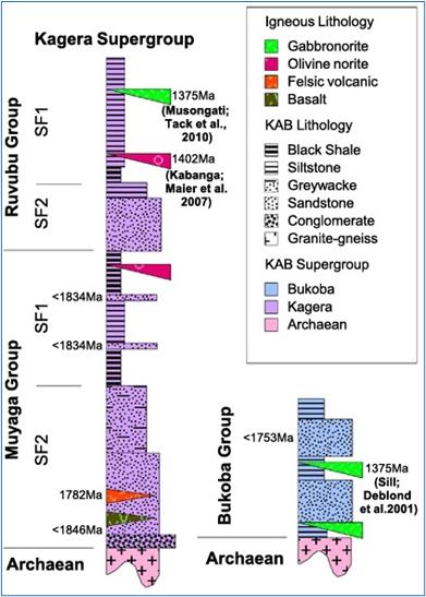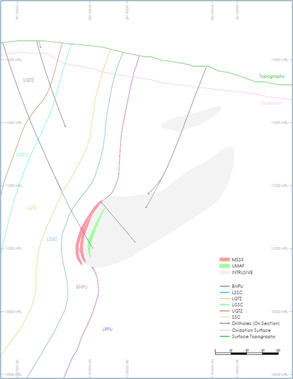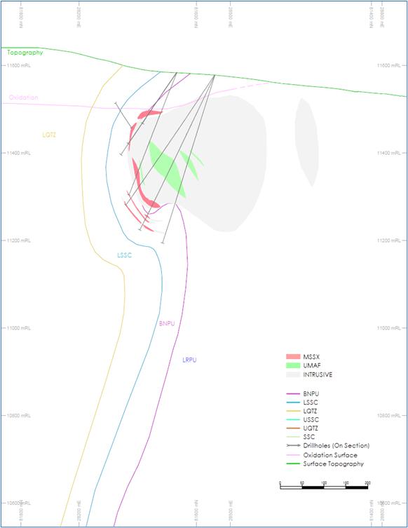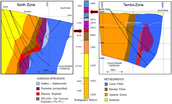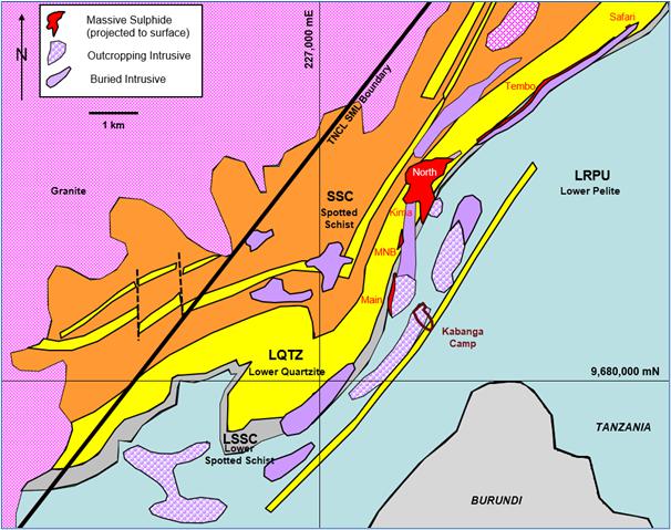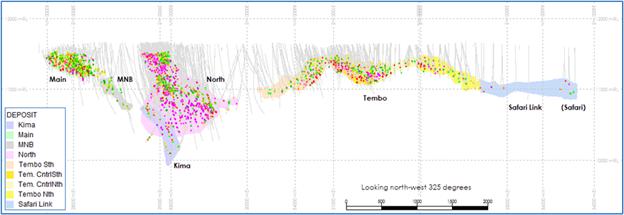 Figure 1: Schematic Projected Long-Section of the Kabanga Mineralized Zones (truncated UTM, looking north-west).