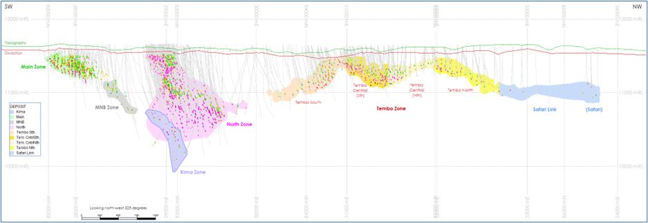 Kabanga currently comprises six identified distinct mineralized zones, namely (from south-west to north-east) the Main, MNB, Kima, North, Tembo and Safari zones, which occur over a strike length exceeding 7.5 kilometers. The five mineralized zones that contribute to the Mineral Resource Update are: Main, MNB, Kima, North and Tembo, which extend over a total strike length of 6.0 kilometers and to a depth of up to 1.7 kilometers below surface.
