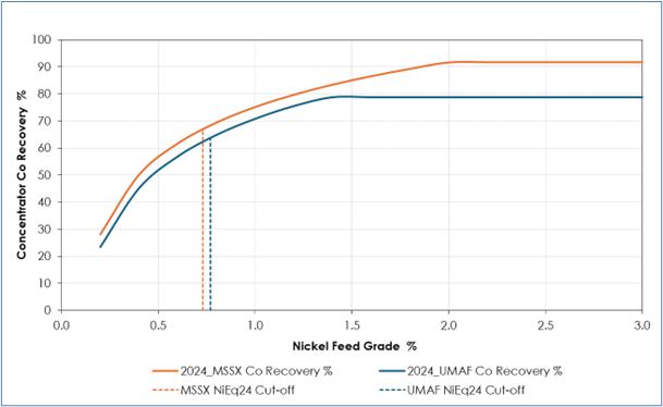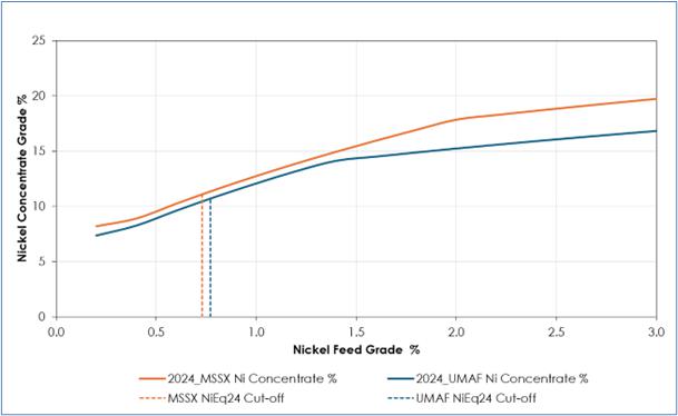 The Mineral Resource cut-off grade calculation has been revised to reflect updated assumptions and technical parameters, increasing to 0.73% NiEq24 for the massive sulfide domain and 0.77% NiEq24 for the ultramafic domain. This compares to 0.58% NiEq23 cut-off grade applied to the previous November 2023 Mineral Resource Update. The metal price assumptions used for 2024 cut-off grade determination are: $9.50/lb nickel, $4.50/lb copper and $23.00/lb cobalt.