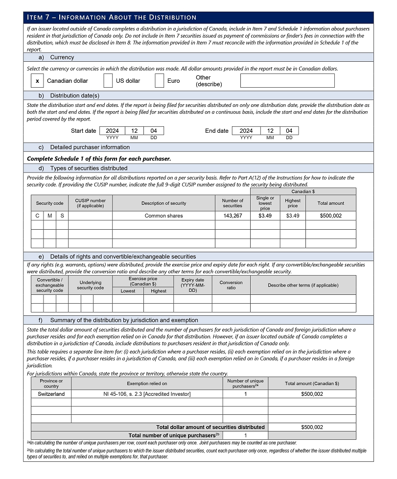 | 99.2 | Form 45-106F1 Report of Exempt Distribution |