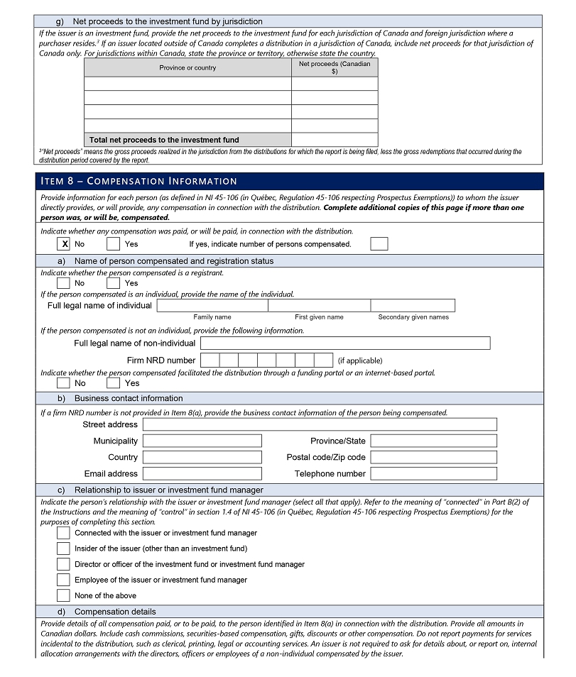 An issuer may use one report for multiple distributions occurring within 10 days of each other, provided the report is filed on or before the 10th day following the first distribution date. However, an investment fund issuer that is relying on the exemptions set out in subsection 6.2(2) of NI 45-106 (in Québec, Regulation 45-106 respecting Prospectus Exemptions) may file the report annually in accordance with that subsection.