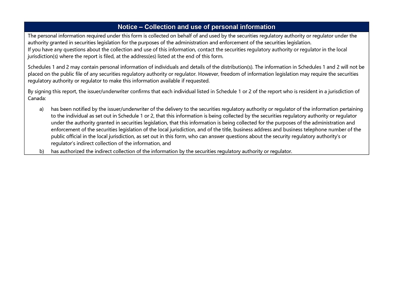 An issuer or underwriter that is required to file a report of exempt distribution and pay the applicable filing fee must pay the filing fee and file the information required by this form in the manner and using the templates specified in the System for Electronic Data Analysis and Retrieval + (SEDAR+) in accordance with National Instrument 13-103 System for Electronic Data Analysis and Retrieval + (SEDAR+) (in Québec, Regulation 13-103 respecting System for Electronic Data Analysis and Retrieval + (SEDAR +)).