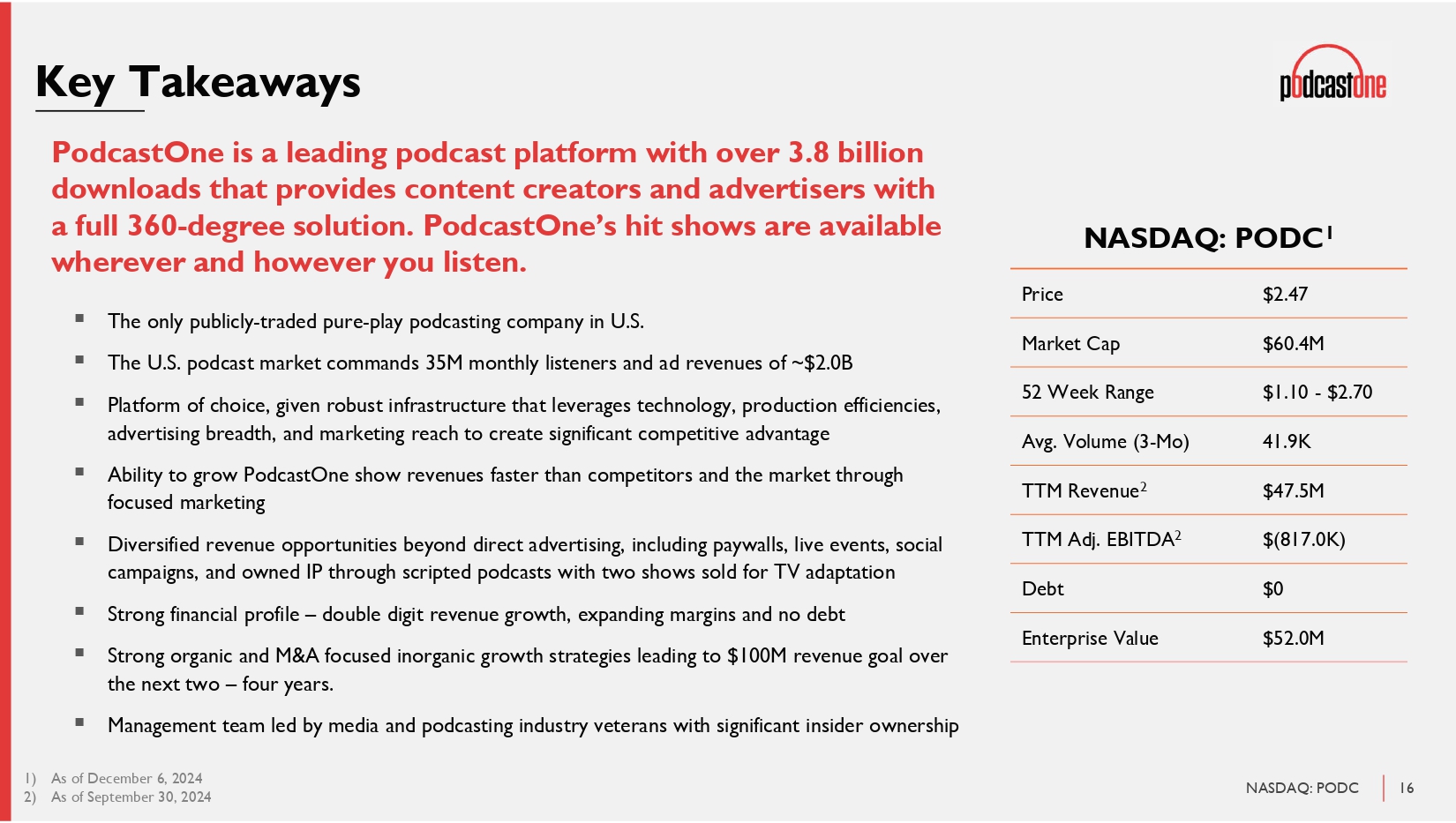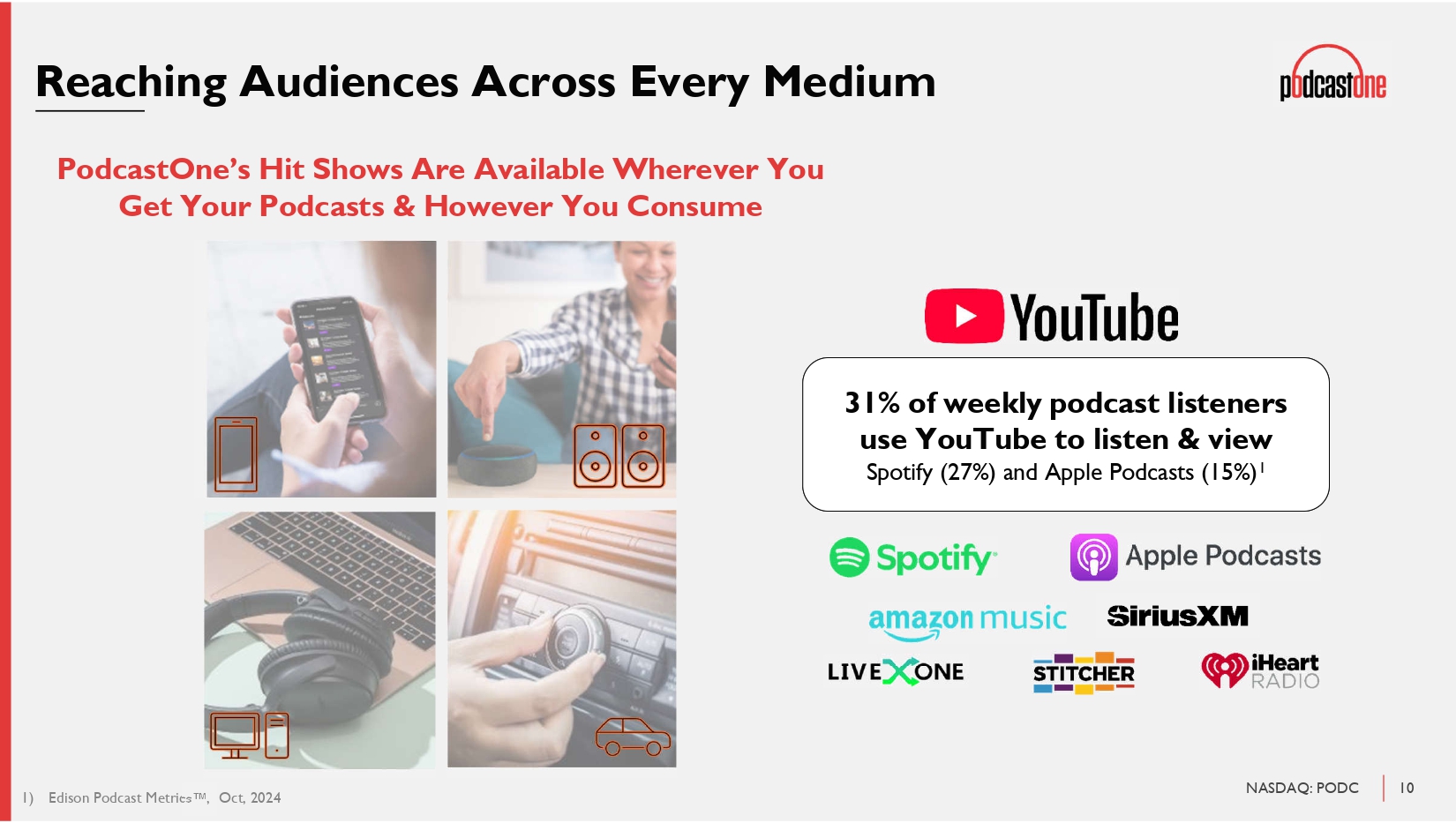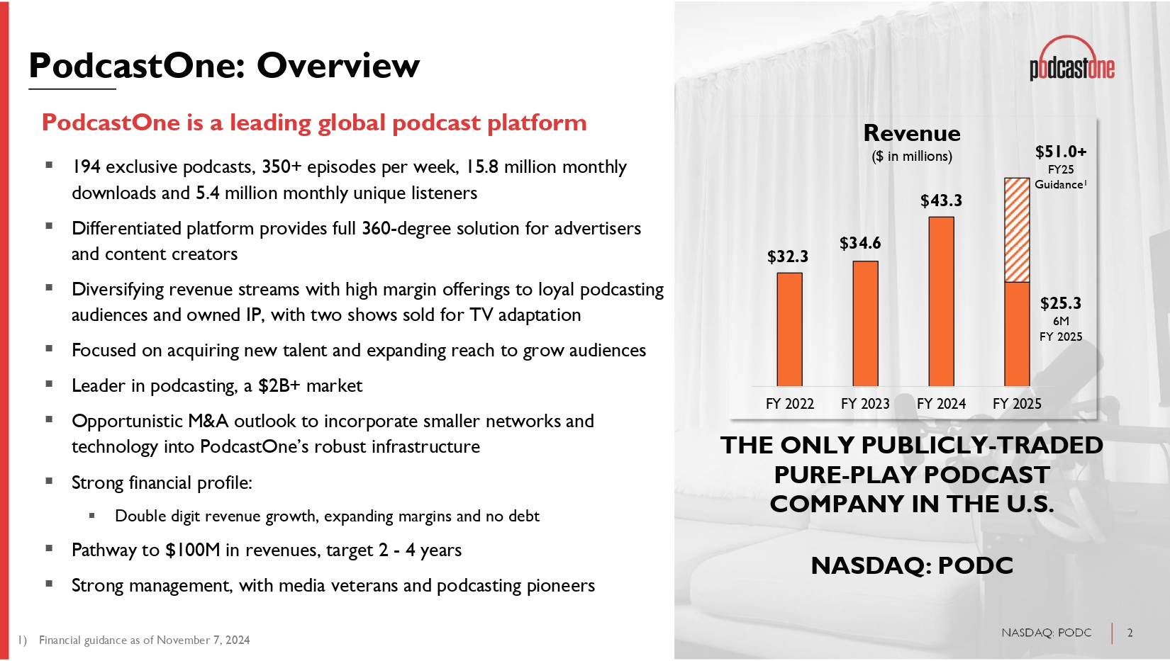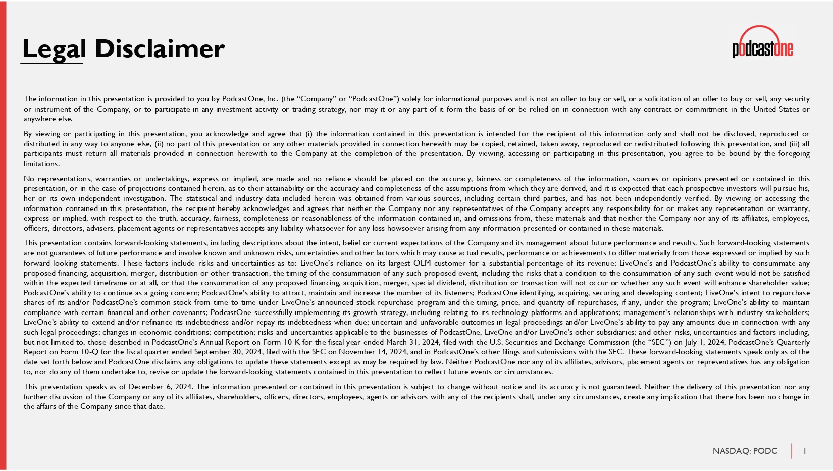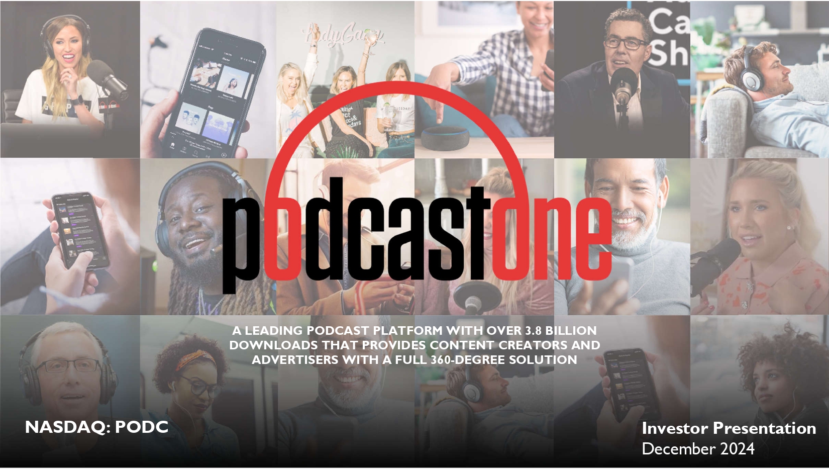 Investor Presentation December 2024 NASDAQ: PODC A LEADING PODCAST PLATFORM WITH OVER 3.8 BILLION DOWNLOADS THAT PROVIDES CONTENT CREATORS AND ADVERTISERS WITH A FULL 360 - DEGREE SOLUTION 1 NASDAQ: PODC Lega l Disclaimer The information in this presentation is provided to you by PodcastOne, Inc . (the “Company” or “PodcastOne”) solely for informational purposes and is not an offer to buy or sell, or a solicitation of an offer to buy or sell, any security or instrument of the Company, or to participate in any investment activity or trading strategy, nor may it or any part of it form the basis of or be relied on in connection with any contract or commitment in the United States or anywhere else . By viewing or participating in this presentation, you acknowledge and agree that (i) the information contained in this presentation is intended for the recipient of this information only and shall not be disclosed, reproduced or distributed in any way to anyone else, (ii) no part of this presentation or any other materials provided in connection herewith may be copied, retained, taken away, reproduced or redistributed following this presentation, and (iii) all participants must return all materials provided in connection herewith to the Company at the completion of the presentation . By viewing, accessing or participating in this presentation, you agree to be bound by the foregoing limitations . No representations, warranties or undertakings, express or implied, are made and no reliance should be placed on the accuracy, fairness or completeness of the information, sources or opinions presented or contained in this presentation, or in the case of projections contained herein, as to their attainability or the accuracy and completeness of the assumptions from which they are derived, and it is expected that each prospective investors will pursue his, her or its own independent investigation . The statistical and industry data included herein was obtained from various sources, including certain third parties, and has not been independently verified . By viewing or accessing the information contained in this presentation, the recipient hereby acknowledges and agrees that neither the Company nor any representatives of the Company accepts any responsibility for or makes any representation or warranty, express or implied, with respect to the truth, accuracy, fairness, completeness or reasonableness of the information contained in, and omissions from, these materials and that neither the Company nor any of its affiliates, employees, officers, directors, advisers, placement agents or representatives accepts any liability whatsoever for any loss howsoever arising from any information presented or contained in these materials . This presentation contains forward - looking statements, including descriptions about the intent, belief or current expectations of the Company and its management about future performance and results . Such forward - looking statements are not guarantees of future performance and involve known and unknown risks, uncertainties and other factors which may cause actual results, performance or achievements to differ materially from those expressed or implied by such forward - looking statements . These factors include risks and uncertainties as to : LiveOne’s reliance on its largest OEM customer for a substantial percentage of its revenue ; LiveOne’s and PodcastOne’s ability to consummate any proposed financing, acquisition, merger, distribution or other transaction, the timing of the consummation of any such proposed event, including the risks that a condition to the consummation of any such event would not be satisfied within the expected timeframe or at all, or that the consummation of any proposed financing, acquisition, merger, special dividend, distribution or transaction will not occur or whether any such event will enhance shareholder value ; PodcastOne’s ability to continue as a going concern ; PodcastOne’s ability to attract, maintain and increase the number of its listeners ; PodcastOne identifying, acquiring, securing and developing content ; LiveOne’s intent to repurchase shares of its and/or PodcastOne’s common stock from time to time under LiveOne’s announced stock repurchase program and the timing, price, and quantity of repurchases, if any, under the program ; LiveOne’s ability to maintain compliance with certain financial and other covenants ; PodcastOne successfully implementing its growth strategy, including relating to its technology platforms and applications ; management’s relationships with industry stakeholders ; LiveOne’s ability to extend and/or refinance its indebtedness and/or repay its indebtedness when due ; uncertain and unfavorable outcomes in legal proceedings and/or LiveOne’s ability to pay any amounts due in connection with any such legal proceedings ; changes in economic conditions ; competition ; risks and uncertainties applicable to the businesses of PodcastOne, LiveOne and/or LiveOne’s other subsidiaries ; and other risks, uncertainties and factors including, but not limited to, those described in PodcastOne’s Annual Report on Form 10 - K for the fiscal year ended March 31 , 2024 , filed with the U . S . Securities and Exchange Commission (the “SEC”) on July 1 , 2024 , PodcastOne’s Quarterly Report on Form 10 - Q for the fiscal quarter ended September 30 , 2024 , filed with the SEC on November 14 , 2024 , and in PodcastOne’s other filings and submissions with the SEC . These forward - looking statements speak only as of the date set forth below and PodcastOne disclaims any obligations to update these statements except as may be required by law . Neither PodcastOne nor any of its affiliates, advisors, placement agents or representatives has any obligation to, nor do any of them undertake to, revise or update the forward - looking statements contained in this presentation to reflect future events or circumsta