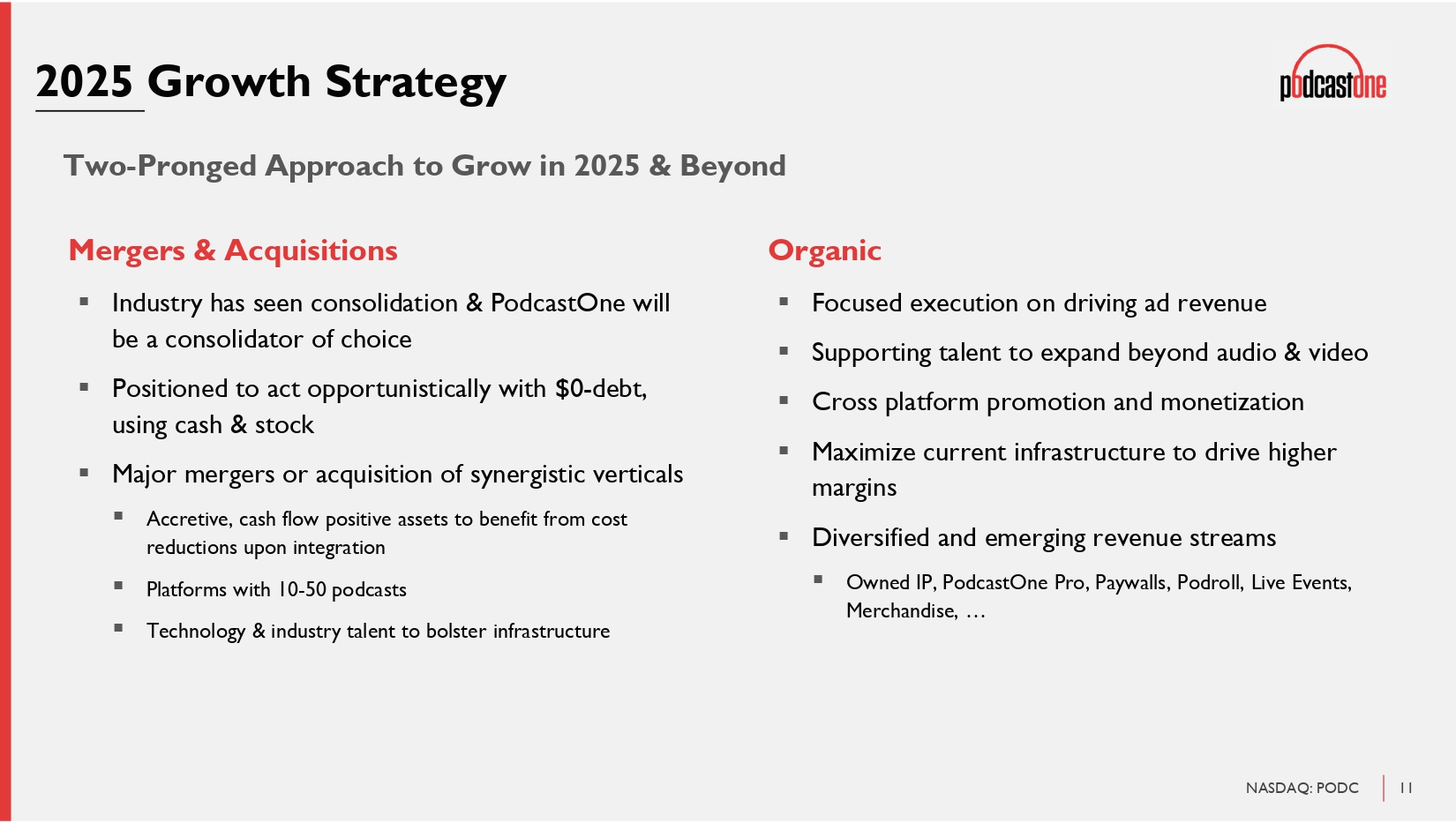These are tested shows – these aren’t big risks these companies are taking,” – J o s h L i n d g r e n , He a d o f CAA’ s Po d c a s t De p a r t m e n t “ Joe Rogan’s Renews Spotify Deal, Podcast Will No Longer Be Exclusive to the Platform $250M+ Alex Cooper Jumps From Spotify to SiriusXM $125M SiriusXM Inks ‘SmartLess’ Podcast Three - Year Deal $100M+ Kelce Brothers Sign Three - year Deal With Amazon’s Wondery for ‘New Heights’ Podcast $100M+ 2024 Podcast Pay - days Watchable podcasts are growing in popularity; 1 in 3 now say they prefer actively watching podcasts with videos.” – Cu m u l u s Me d i a a n d S i g n a l Hi l l I n s i g h t s ' Po d c a s t Do w n l o a d – F a l l 2 0 2 4 R e p o r t “ NASDAQ: PODC 6 Vision & Objectives Near - Term ▪ Be the go - to platform to grow audiences and expand reach for established and emerging content creators ▪ Invest in technology and infrastructure to produce best - in - class podcasts with high margins ▪ Grow the advertising platform with diversification of podcasts and by partnering with top brands to reach key demographics and loyal listeners, resulting in growth above industry trends Long - Term ▪ Partner, nurture and develop industry leading podcasts by offering diverse revenue growth and a return profiles that exceeds industry growth metrics and returns ▪ Execute on focused M&A strategy to grow PodcastOne through the acquisition of existing platforms, technology, and production capabilities to capitalize on future industry trends ▪ Be an acquirer of choice for smaller podcast platforms (10 - 50 podcasts), offering efficiencies in cost structure, ability to scale and access to much larger advertising platform NASDAQ: PODC 7 PodcastOne Pro ▪ Specializes in transforming podcasts into polished productions ▪ Offers fully customizable production packages for brands, professionals, or hobbyists ▪ Leverages current infrastructure, to drives higher margins & diversifies revenue streams Platform of Choice Public Relations Hosting & Distribution Editing Building a Successful Podcast Requires More Than Just Great Content; It Requires a Strategic Approach Unmatched Infrastructure ▪ Allows creators to focus on what they do best and PodcastOne to offer value - added services that efficiently drive revenues