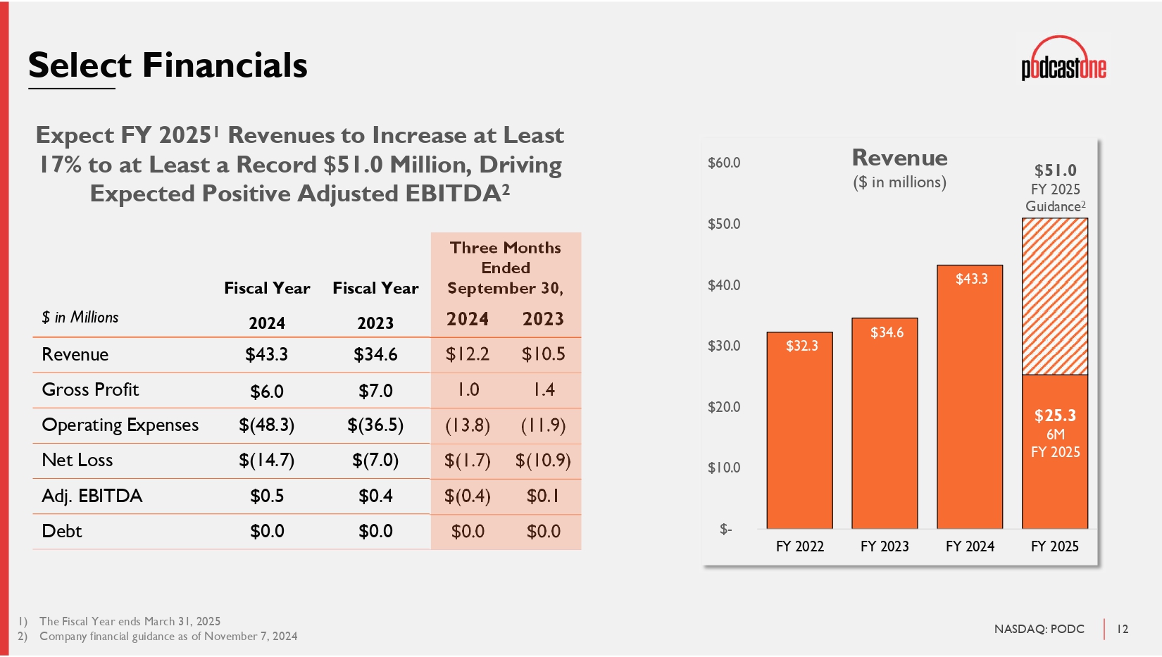10 NASDAQ: PODC Reaching Audiences Across Every Medium PodcastOne’s Hit Shows Are Available Wherever You Get Your Podcasts & However You Consume 31% of weekly podcast listeners use YouTube to listen & view Spotify (27%) and Apple Podcasts (15%) 1 s 1) Edison Podcast Metric , Oct, 2024 11 NASDAQ: PODC 2025 Growth Strategy ▪ Focused execution on driving ad revenue ▪ Supporting talent to expand beyond audio & video ▪ Cross platform promotion and monetization ▪ Maximize current infrastructure to drive higher margins ▪ Diversified and emerging revenue streams ▪ Owned IP, PodcastOne Pro, Paywalls, Podroll, Live Events, Merchandise, … ▪ Industry has seen consolidation & PodcastOne will be a consolidator of choice ▪ Positioned to act opportunistically with $0 - debt, using cash & stock ▪ Major mergers or acquisition of synergistic verticals ▪ Accretive, cash flow positive assets to benefit from cost reductions upon integration ▪ Platforms with 10 - 50 podcasts ▪ Technology & industry talent to bolster infrastructure Two - Pronged Approach to Grow in 2025 & Beyond Mergers & Acquisitions Organic 12 NASDAQ: PODC Select Financials Three Months Ended September 30, Fiscal Year Fiscal Year 2023 2024 2023 2024 $ in Millions $10.5 $12.2 $34.6 $43.3 Revenue 1.4 1.0 $7.0 $6.0 Gross Profit (11.9) (13.8) $(36.5) $(48.3) Operating Expenses $(10.9) $(1.7) $(7.0) $(14.7) Net Loss $0.1 $(0.4) $0.4 $0.5 Adj.