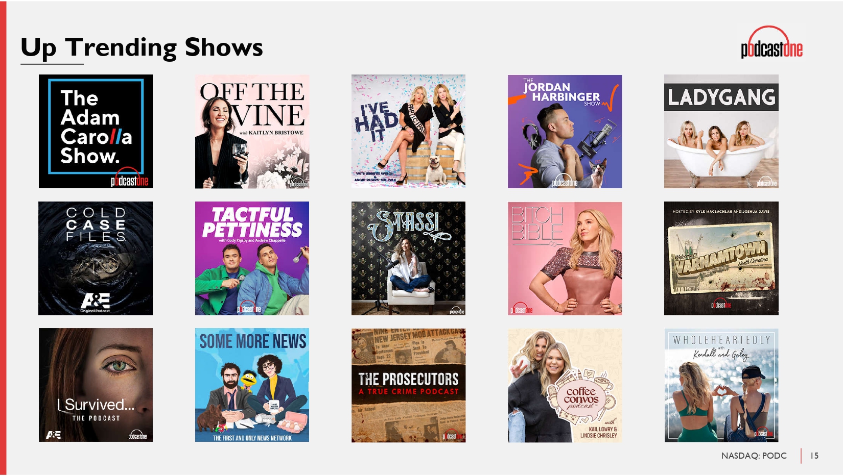Drew Show, Carolla Classics ▪ And diversifies his revenue streams ▪ Live shows & tours, PPV, merchandise, Substack NASDAQ: PODC 14 James Berk Jay Krigsman Director of LiveOne Executive VP & Asset Manager of The Kraus Companies Head of Studio, Sphere Entertainment Former Chief Operating Officer of Warner Bros Chairman & CEO of Goodman Media Partners Former CEO of Participant Media Robert Ellin Executive Chairman of PodcastOne Founder & CEO & Chairman of LiveOne Founder & Managing Dir. of Trinad Capital Mgmt. Board of Directors Carolyn Blackwood Management & Board STACIE PARRA ELI DVORKIN STEVE LEHMAN SUE MCNAMARA AARON SULLIVAN ROBERT ELLIN KIT GRAY Content & Podcast Producer Chief Content Officer Vice Chairman Chief Revenue Officer Chief Financial Officer Executive Chairman Co - Founder & President 20+ YEARS EXPERIENCE 15+ YEARS EXPERIENCE 25+ YEARS EXPERIENCE 20+ YEARS EXPERIENCE 17+ YEARS EXPERIENCE 25+ YEARS EXPERIENCE 19+ YEARS EXPERIENCE Podcast Industry Veterans High Insider Ownership Creates Alignment With Investors 14 PODC Investor Presentation Jon Merriman Head of Equities for Texas Capital Bank Ramin Arani Director of LiveOne Former Portfolio Manager at Fidelity Management Patrick Wachsberger Director of LiveOne Founder & Manager of Picture Perfect Entertainment 15 NASDAQ: PODC Up Trending Shows