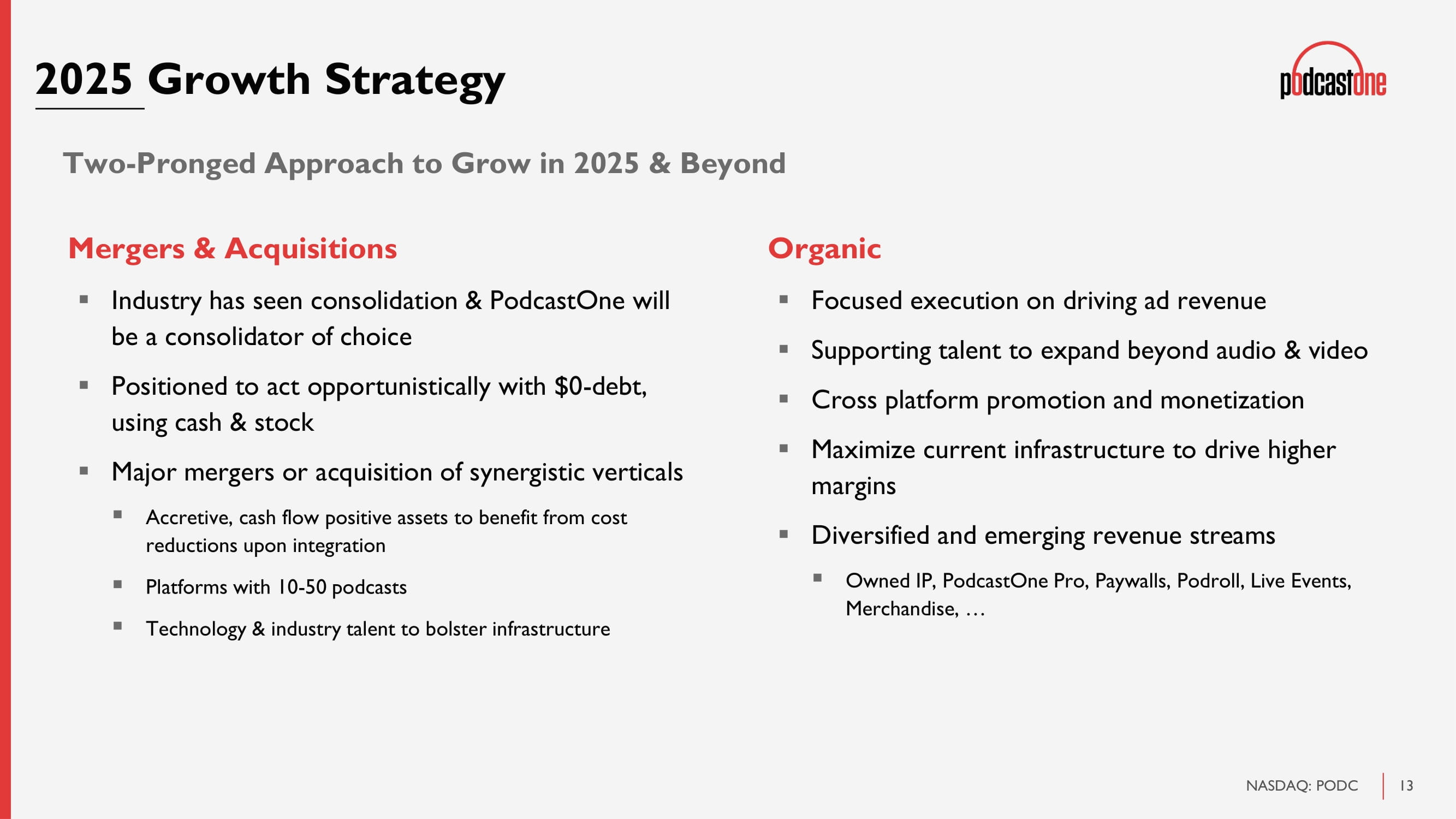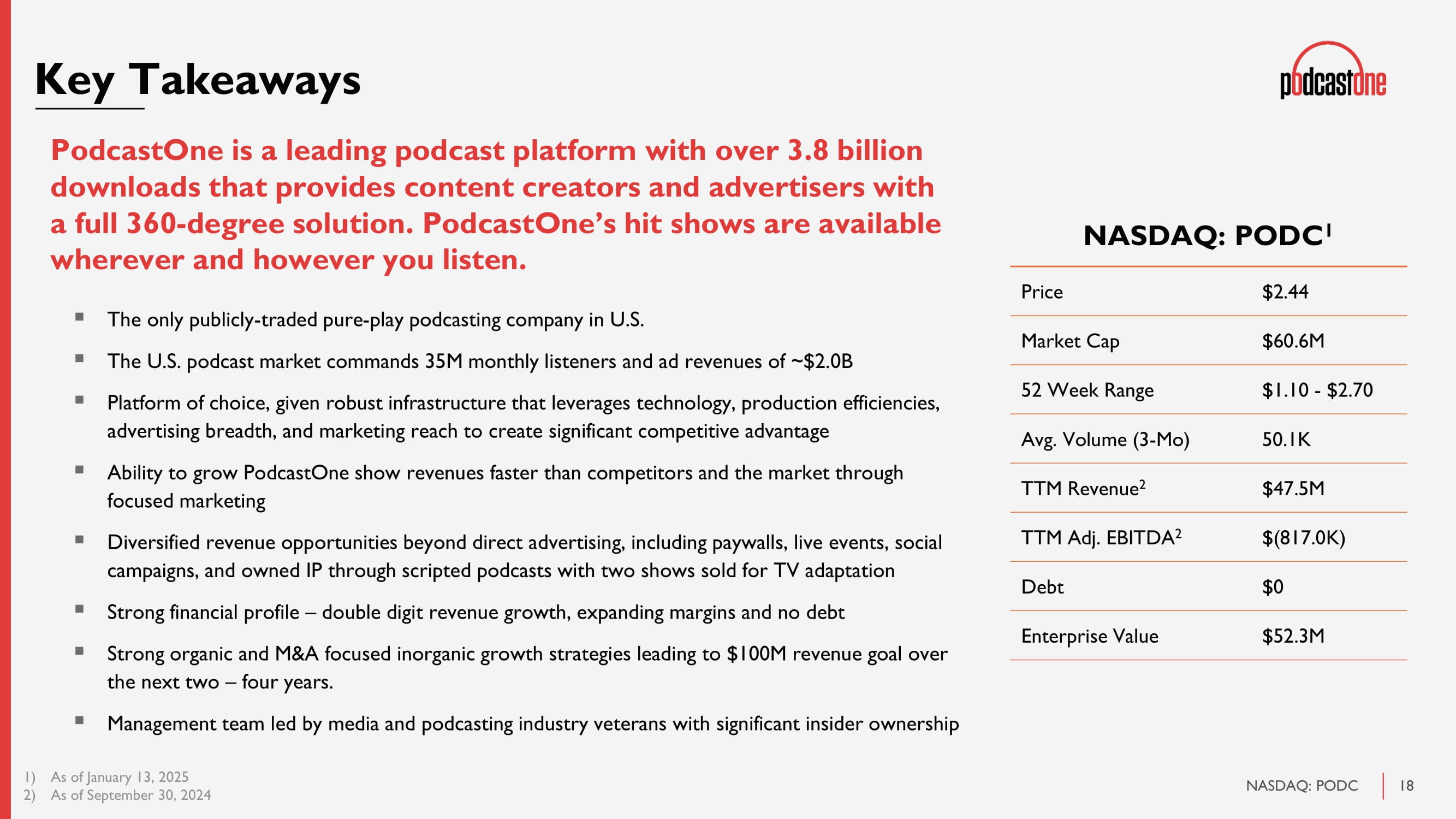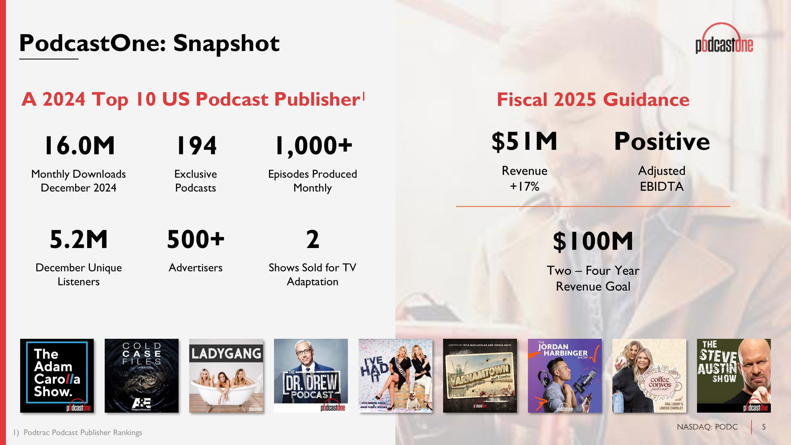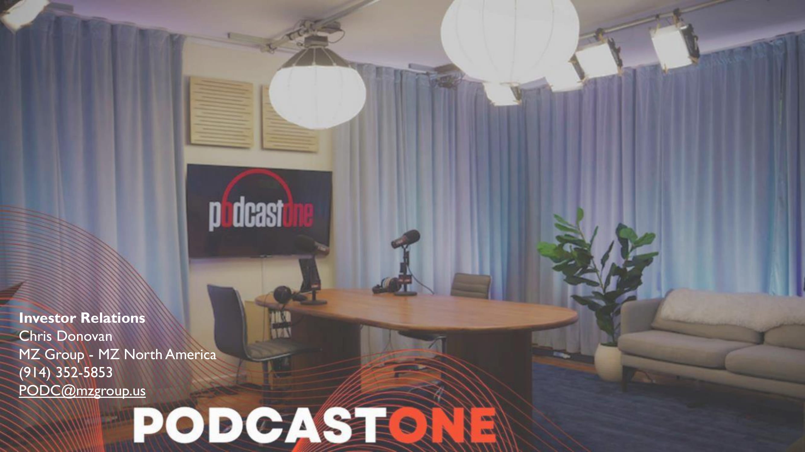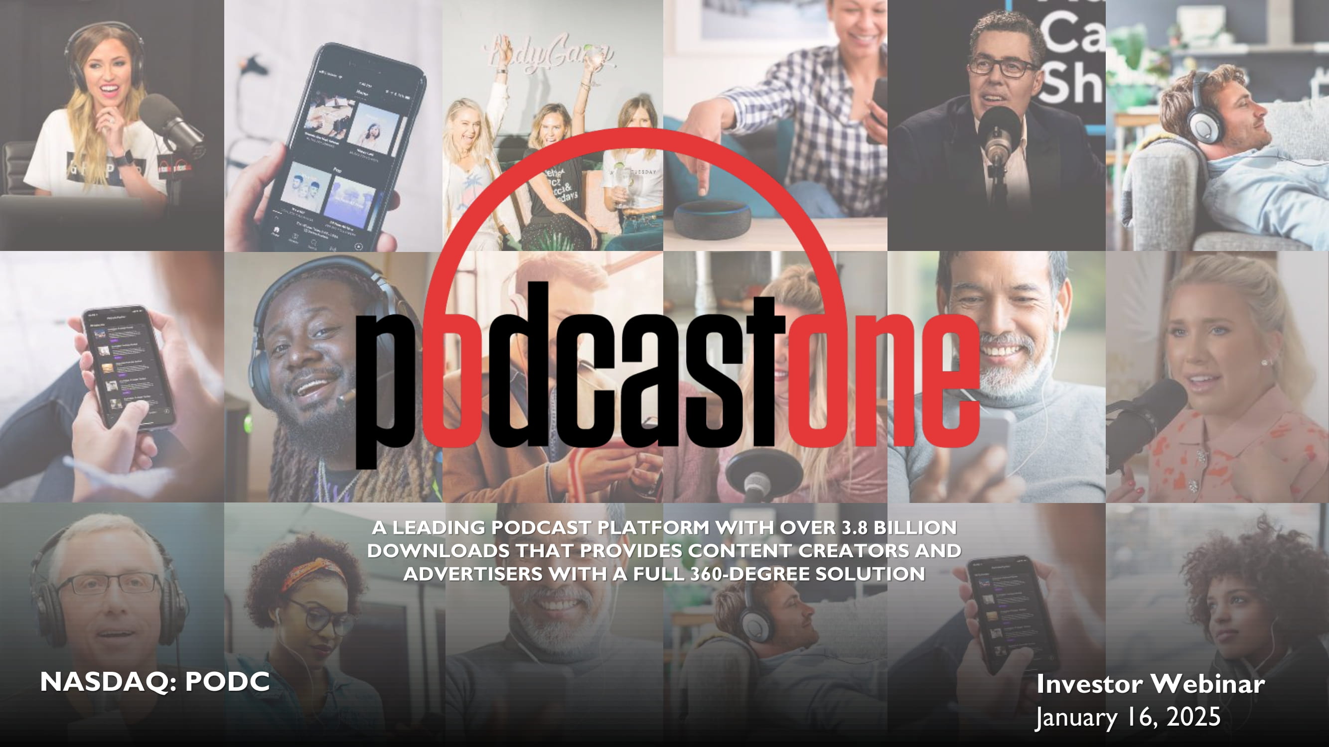 Investor Webinar January 16, 2025 NASDAQ: PODC A LEADING PODCAST PLATFORM WITH OVER 3.8 BILLION DOWNLOADS THAT PROVIDES CONTENT CREATORS AND ADVERTISERS WITH A FULL 360 - DEGREE SOLUTION 1 NASDAQ: PODC Lega l Disclaimer The information in this presentation is provided to you by PodcastOne, Inc . (the “Company” or “PodcastOne”) solely for informational purposes and is not an offer to buy or sell, or a solicitation of an offer to buy or sell, any security or instrument of the Company, or to participate in any investment activity or trading strategy, nor may it or any part of it form the basis of or be relied on in connection with any contract or commitment in the United States or anywhere else . By viewing or participating in this presentation, you acknowledge and agree that (i) the information contained in this presentation is intended for the recipient of this information only and shall not be disclosed, reproduced or distributed in any way to anyone else, (ii) no part of this presentation or any other materials provided in connection herewith may be copied, retained, taken away, reproduced or redistributed following this presentation, and (iii) all participants must return all materials provided in connection herewith to the Company at the completion of the presentation . By viewing, accessing or participating in this presentation, you agree to be bound by the foregoing limitations . No representations, warranties or undertakings, express or implied, are made and no reliance should be placed on the accuracy, fairness or completeness of the information, sources or opinions presented or contained in this presentation, or in the case of projections contained herein, as to their attainability or the accuracy and completeness of the assumptions from which they are derived, and it is expected that each prospective investors will pursue his, her or its own independent investigation . The statistical and industry data included herein was obtained from various sources, including certain third parties, and has not been independently verified . By viewing or accessing the information contained in this presentation, the recipient hereby acknowledges and agrees that neither the Company nor any representatives of the Company accepts any responsibility for or makes any representation or warranty, express or implied, with respect to the truth, accuracy, fairness, completeness or reasonableness of the information contained in, and omissions from, these materials and that neither the Company nor any of its affiliates, employees, officers, directors, advisers, placement agents or representatives accepts any liability whatsoever for any loss howsoever arising from any information presented or contained in these materials . This presentation contains forward - looking statements, including descriptions about the intent, belief or current expectations of the Company and its management about future performance and results . Such forward - looking statements are not guarantees of future performance and involve known and unknown risks, uncertainties and other factors which may cause actual results, performance or achievements to differ materially from those expressed or implied by such forward - looking statements . These factors include risks and uncertainties as to : LiveOne’s reliance on its largest OEM customer for a substantial percentage of its revenue ; LiveOne’s and PodcastOne’s ability to consummate any proposed financing, acquisition, merger, distribution or other transaction, the timing of the consummation of any such proposed event, including the risks that a condition to the consummation of any such event would not be satisfied within the expected timeframe or at all, or that the consummation of any proposed financing, acquisition, merger, special dividend, distribution or transaction will not occur or whether any such event will enhance shareholder value ; PodcastOne’s ability to continue as a going concern ; PodcastOne’s ability to attract, maintain and increase the number of its listeners ; PodcastOne identifying, acquiring, securing and developing content ; LiveOne’s intent to repurchase shares of its and/or PodcastOne’s common stock from time to time under LiveOne’s announced stock repurchase program and the timing, price, and quantity of repurchases, if any, under the program ; LiveOne’s ability to maintain compliance with certain financial and other covenants ; PodcastOne successfully implementing its growth strategy, including relating to its technology platforms and applications ; management’s relationships with industry stakeholders ; LiveOne’s ability to extend and/or refinance its indebtedness and/or repay its indebtedness when due ; uncertain and unfavorable outcomes in legal proceedings and/or LiveOne’s ability to pay any amounts due in connection with any such legal proceedings ; changes in economic conditions ; competition ; risks and uncertainties applicable to the businesses of PodcastOne, LiveOne and/or LiveOne’s other subsidiaries ; and other risks, uncertainties and factors including, but not limited to, those described in PodcastOne’s Annual Report on Form 10 - K for the fiscal year ended March 31 , 2024 , filed with the U . S . Securities and Exchange Commission (the “SEC”) on July 1 , 2024 , PodcastOne’s Quarterly Report on Form 10 - Q for the fiscal quarter ended September 30 , 2024 , filed with the SEC on November 14 , 2024 , and in PodcastOne’s other filings and submissions with the SEC . These forward - looking statements speak only as of the date set forth below and PodcastOne disclaims any obligations to update these statements except as may be required by law . Neither PodcastOne nor any of its affiliates, advisors, placement agents or representatives has any obligation to, nor do any of them undertake to, revise or update the forward - looking statements contained in this presentation to reflect future events or circumstanc