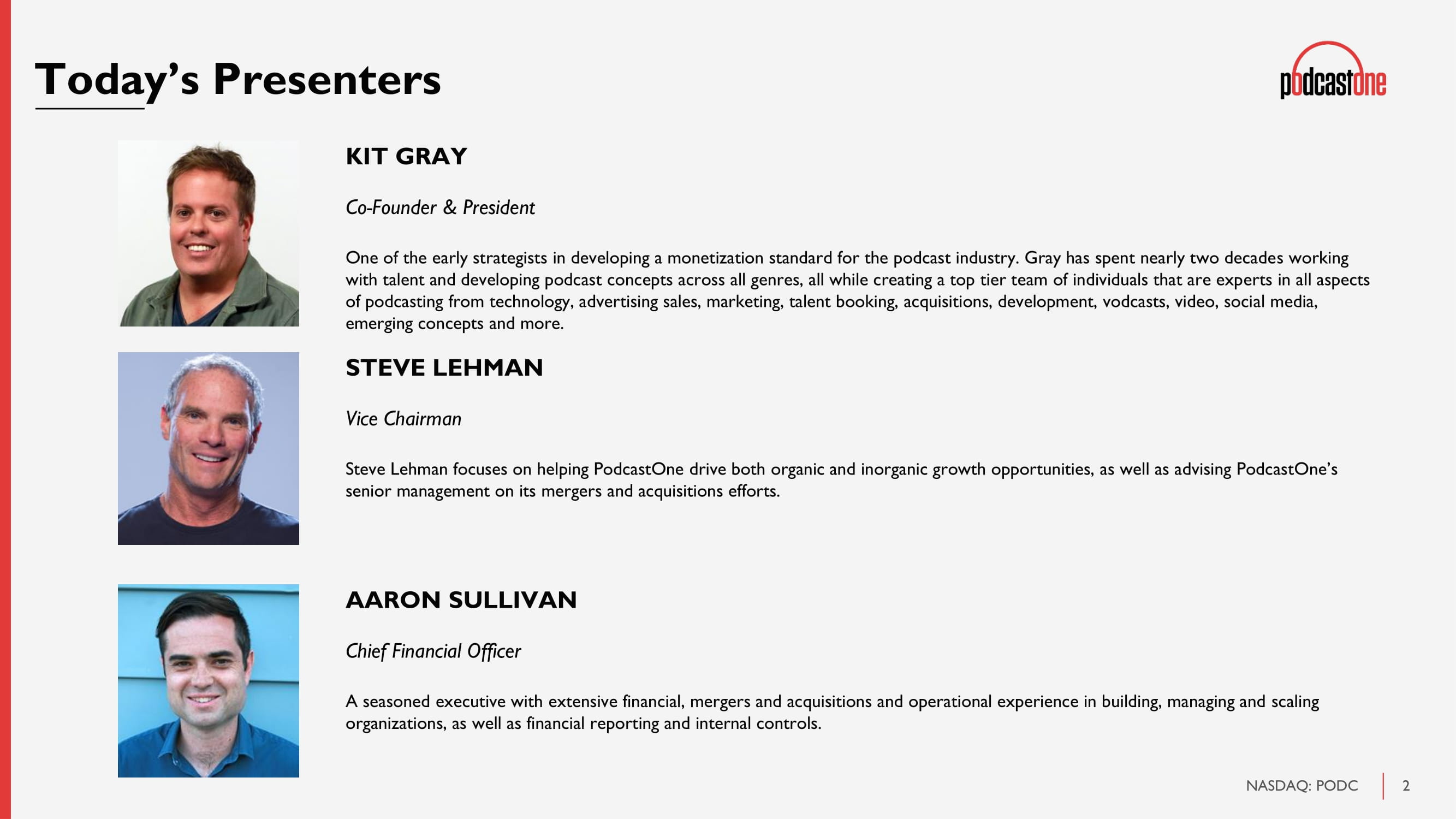 2 NASDAQ: PODC Today’s Presenters AARON SULLIVAN Chief Financial Officer A seasoned executive with extensive financial, mergers and acquisitions and operational experience in building, managing and scaling organizations, as well as financial reporting and internal controls. KIT GRAY Co - Founder & President One of the early strategists in developing a monetization standard for the podcast industry. Gray has spent nearly two decades working with talent and developing podcast concepts across all genres, all while creating a top tier team of individuals that are experts in all aspects of podcasting from technology, advertising sales, marketing, talent booking, acquisitions, development, vodcasts, video, social media, emerging concepts and more. STEVE LEHMAN Vice Chairman Steve Lehman focuses on helping PodcastOne drive both organic and inorganic growth opportunities, as well as advising PodcastOne’s senior management on its mergers and acquisitions efforts.