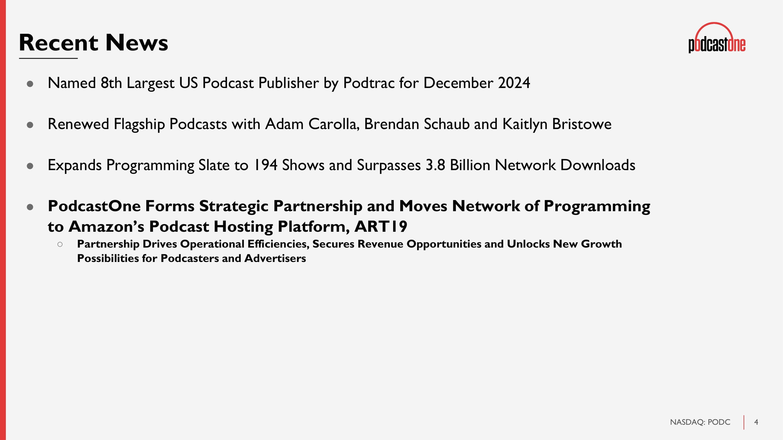 3 NASDAQ: PODC PodcastOne: Overview ▪ 194 exclusive podcasts, 350+ episodes per week, 16.0 million monthly downloads and 5.2 million monthly unique listeners ▪ Differentiated platform provides full 360 - degree solution for advertisers and content creators ▪ Diversifying revenue streams with high margin offerings to loyal podcasting audiences and owned IP, with two shows sold for TV adaptation ▪ Focused on acquiring new talent and expanding reach to grow audiences ▪ Leader in podcasting, a $2B+ market ▪ Opportunistic M&A outlook to incorporate smaller networks and technology into PodcastOne’s robust infrastructure ▪ Strong financial profile: ▪ Double digit revenue growth, expanding margins and no debt ▪ Pathway to $100M in revenues, target 2 - 4 years ▪ Strong management, with media veterans and podcasting pioneers NASDAQ: PODC FY 2022 FY 2023 FY 2024 FY 2025 THE ONLY PUBLICLY - TRADED PURE - PLAY PODCAST COMPANY IN THE U.S.