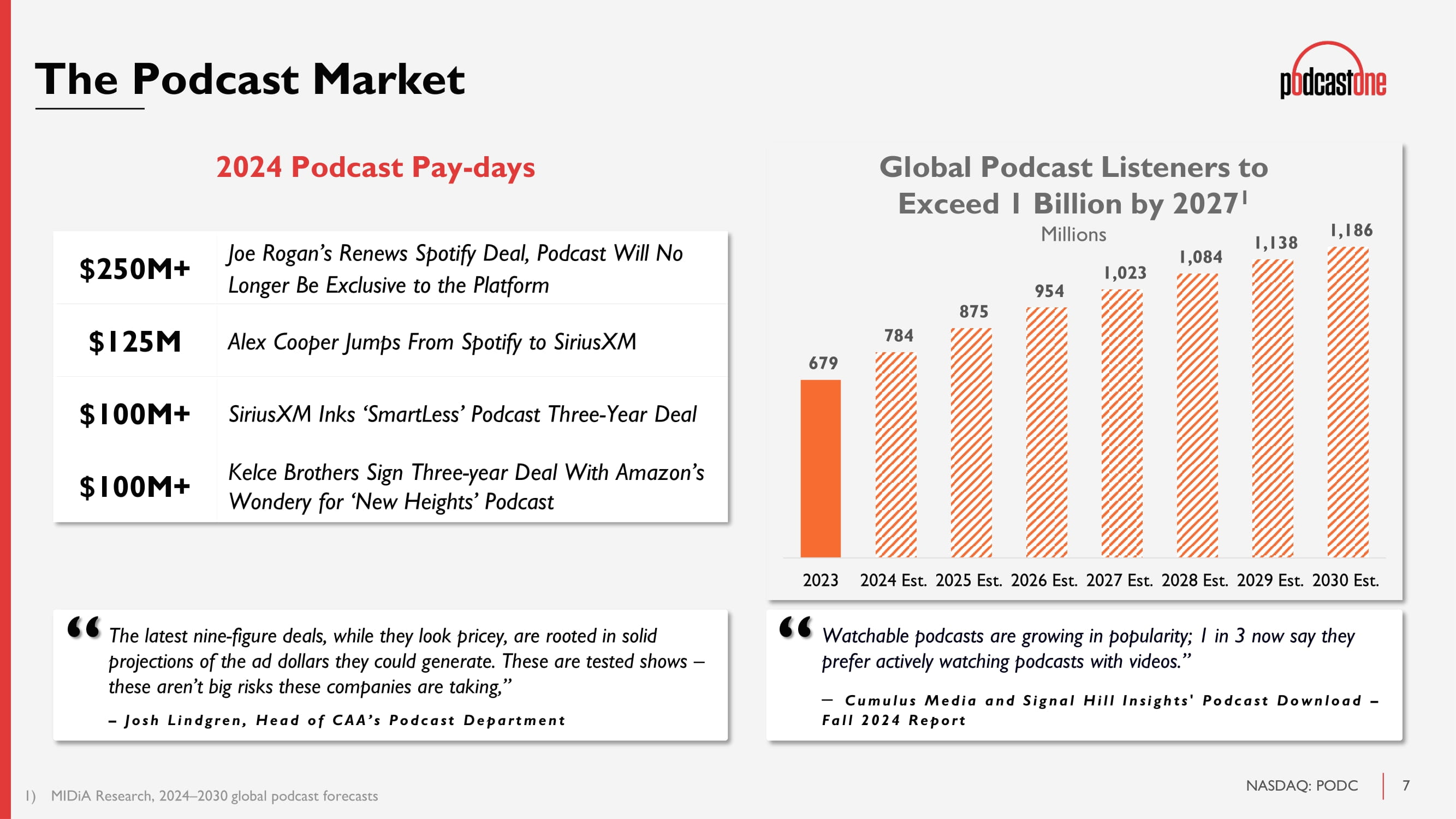 6 NASDAQ: PODC 1,449 842 1,825 1,925 2,165 2,379 2,562 2020 2021 2022 2023 2024 Est. 2025 Est. 2026 Est. 1) The Infinite Dial 2024 2) MRI - Simmons 2023 April Podcast Study 3) PwC | IAB FY 2023 Podcast Ad Revenue Study 4) Podcastindex.org U.S. Podcast Market Ad Revenues 3 $ Millions Podcast Listeners are a Loyal, Engaged And Highly Sought After Demographic Monthly U.S. listeners 1 135M Avg. podcast episodes listened to per week 1 8.3 Say “I feel close to the hosts of the podcasts I listen to” 2 75% Of listeners are college educated 2 48% Median age, with heavy users trending younger 2 39 Median household income 2 $101K Total U.S. podcast market Ad Revenue in 2024 climbing to ~$2.6B by 2026 3 $2B+ Total Podcasts 4 4.3M+ The Podcast Market Improvements in measurement and the evolution in programmatic buying, along with revenues tied to video and live events are contributing to the positive outlook.” – Pw C | IA B F Y 2 0 2 3 Po d c a s t A d R ev en u e S tu d y “ 7 NASDAQ: PODC 679 784 875 954 1,023 1,084 1,138 1,186 2023 2024 Est.