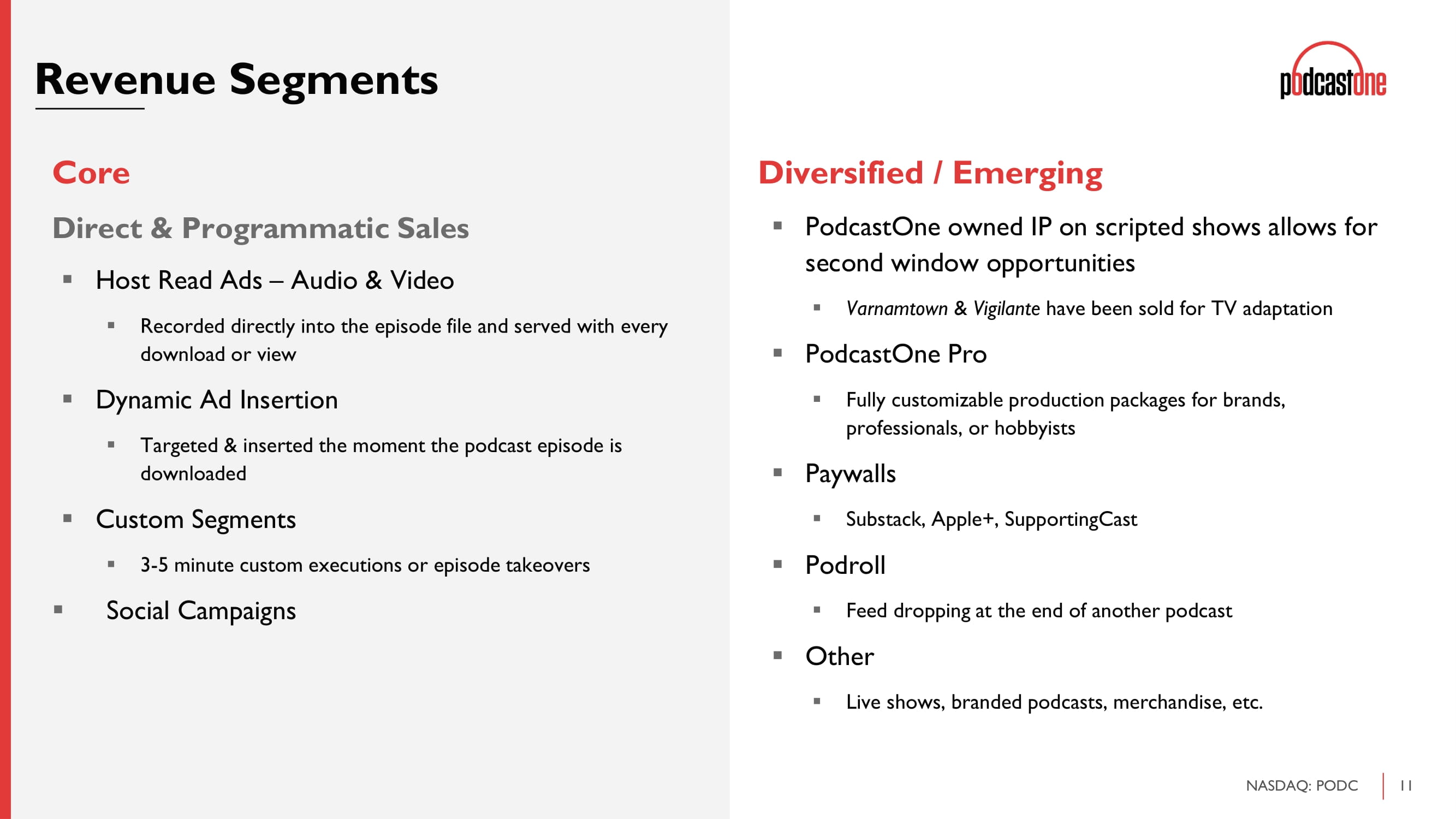 10 NASDAQ: PODC Our Blue - Chip National Advertisers Deep Relationships Across Our Network of 500+ Advertisers & Brands PodcastOne has Exclusive Rights to All Advertising Inventory 11 NASDAQ: PODC Revenue Segments Core Direct & Programmatic Sales ▪ Host Read Ads – Audio & Video ▪ Recorded directly into the episode file and served with every download or view ▪ Dynamic Ad Insertion ▪ Targeted & inserted the moment the podcast episode is downloaded ▪ Custom Segments ▪ 3 - 5 minute custom executions or episode takeovers ▪ Social Campaigns Diversified / Emerging ▪ PodcastOne owned IP on scripted shows allows for second window opportunities ▪ Varnamtown & Vigilante have been sold for TV adaptation ▪ PodcastOne Pro ▪ Fully customizable production packages for brands, professionals, or hobbyists ▪ Paywalls ▪ Substack, Apple+, SupportingCast ▪ Podroll ▪ Feed dropping at the end of another podcast ▪ Other ▪ Live shows, branded podcasts, merchandise, etc.