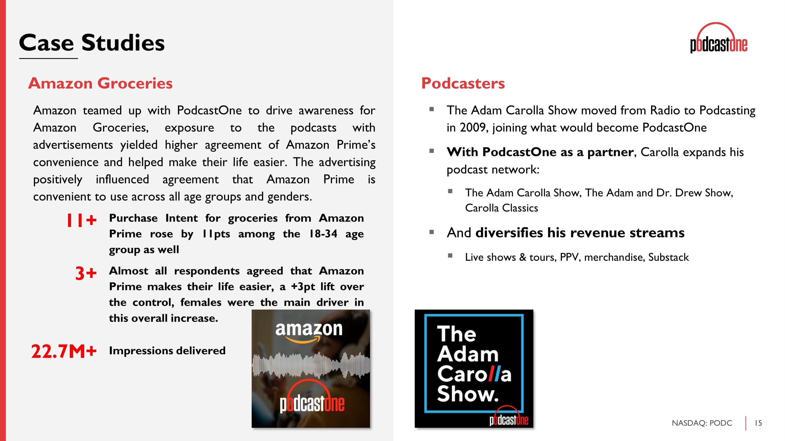 EBITDA $0.0 $0.0 $0.0 $0.0 Debt $32.3 $34.6 $43.3 $ - $10.0 $20.0 $30.0 $40.0 $50.0 $60.0 FY 2022 FY 2023 FY 2024 FY 2025 $51.0 FY 2025 Guidance 2 $25.3 6M FY 2025 Expect FY 2025 1 Revenues to Increase at Least 17% to at Least a Record $51.0 Million, Driving Expected Positive Adjusted EBITDA 2 Revenue ($ in millions) 1) The Fiscal Year ends March 31, 2025 2) Company financial guidance as of November 7, 2024 15 NASDAQ: PODC Case Studies Amazon Groceries Amazon teamed up with PodcastOne to drive awareness for Amazon Groceries, exposure to the podcasts with advertisements yielded higher agreement of Amazon Prime’s convenience and helped make their life easier . The advertising positively influenced agreement that Amazon Prime is convenient to use across all age groups and genders. 11+ Purchase Intent for groceries from Amazon Prime rose by 11 pts among the 18 - 34 age group as well Almost all respondents agreed that Amazon Prime makes their life easier, a + 3 pt lift over the control, females were the main driver in this overall increase . 3+ Impressions delivered 22.7M+ Podcasters ▪ The Adam Carolla Show moved from Radio to Podcasting in 2009, joining what would become PodcastOne ▪ With PodcastOne as a partner , Carolla expands his podcast network: ▪ The Adam Carolla Show, The Adam and Dr.