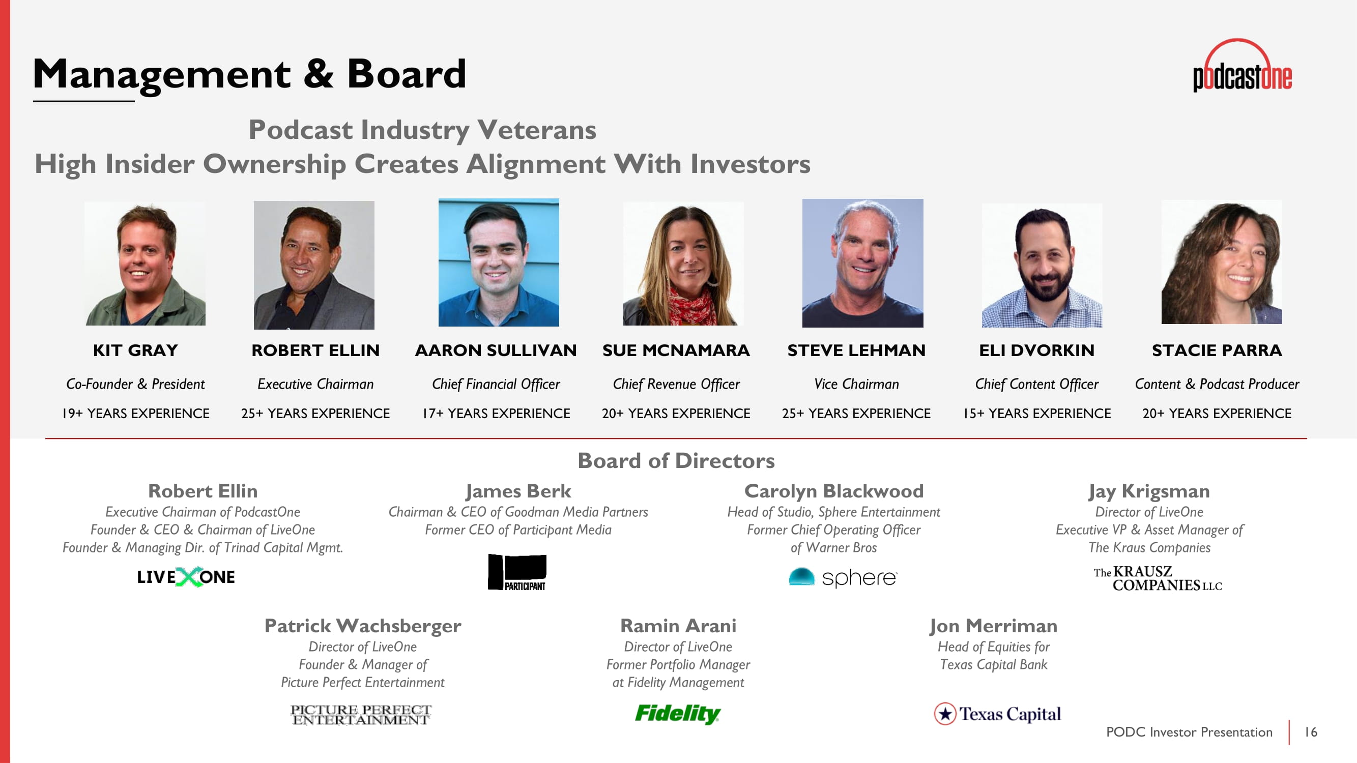 Drew Show, Carolla Classics ▪ And diversifies his revenue streams ▪ Live shows & tours, PPV, merchandise, Substack NASDAQ: PODC 16 Jay Krigsman Carolyn Blackwood James Berk Robert Ellin Director of LiveOne Executive VP & Asset Manager of The Kraus Companies Head of Studio, Sphere Entertainment Former Chief Operating Officer of Warner Bros Chairman & CEO of Goodman Media Partners Former CEO of Participant Media Executive Chairman of PodcastOne Founder & CEO & Chairman of LiveOne Founder & Managing Dir. of Trinad Capital Mgmt. Board of Directors Management & Board STACIE PARRA ELI DVORKIN STEVE LEHMAN SUE MCNAMARA AARON SULLIVAN ROBERT ELLIN KIT GRAY Content & Podcast Producer Chief Content Officer Vice Chairman Chief Revenue Officer Chief Financial Officer Executive Chairman Co - Founder & President 20+ YEARS EXPERIENCE 15+ YEARS EXPERIENCE 25+ YEARS EXPERIENCE 20+ YEARS EXPERIENCE 17+ YEARS EXPERIENCE 25+ YEARS EXPERIENCE 19+ YEARS EXPERIENCE Podcast Industry Veterans High Insider Ownership Creates Alignment With Investors 16 PODC Investor Presentation Jon Merriman Ramin Arani Patrick Wachsberger Head of Equities for Texas Capital Bank Director of LiveOne Former Portfolio Manager at Fidelity Management Director of LiveOne Founder & Manager of Picture Perfect Entertainment 17 NASDAQ: PODC Up Trending Shows
