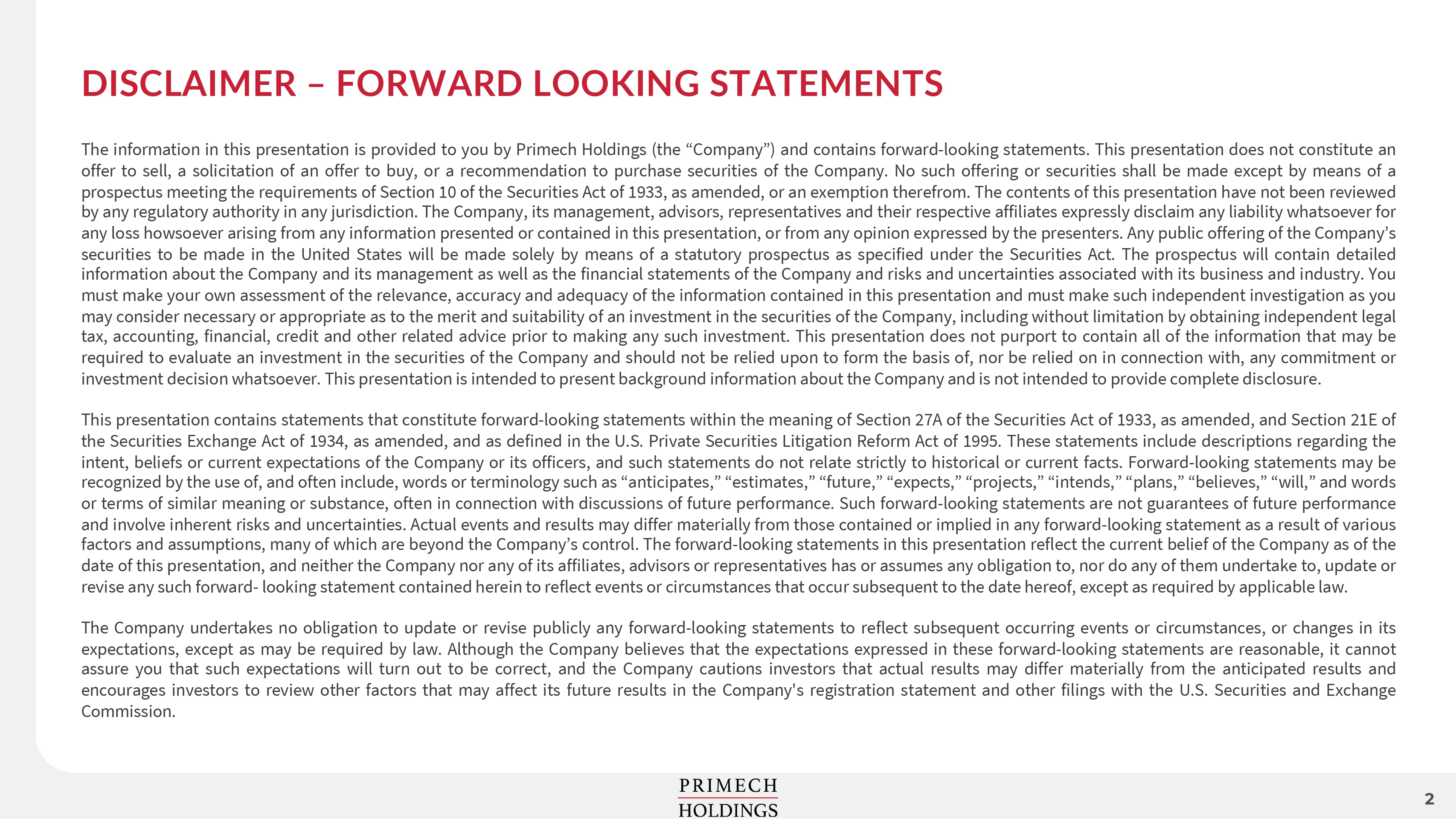 The information in this presentation is provided to you by Primech Holdings (the “Company”) and contains forward - looking statements . This presentation does not constitute an offer to sell, a solicitation of an offer to buy, or a recommendation to purchase securities of the Company . No such offering or securities shall be made except by means of a prospectus meeting the requirements of Section 10 of the Securities Act of 1933 , as amended, or an exemption therefrom . The contents of this presentation have not been reviewed by any regulatory authority in any jurisdiction . The Company, its management, advisors, representatives and their respective affiliates expressly disclaim any liability whatsoever for any loss howsoever arising from any information presented or contained in this presentation, or from any opinion expressed by the presenters . Any public offering of the Company’s securities to be made in the United States will be made solely by means of a statutory prospectus as specified under the Securities Act . The prospectus will contain detailed information about the Company and its management as well as the financial statements of the Company and risks and uncertainties associated with its business and industry . You must make your own assessment of the relevance, accuracy and adequacy of the information contained in this presentation and must make such independent investigation as you may consider necessary or appropriate as to the merit and suitability of an investment in the securities of the Company, including without limitation by obtaining independent legal tax, accounting, financial, credit and other related advice prior to making any such investment . This presentation does not purport to contain all of the information that may be required to evaluate an investment in the securities of the Company and should not be relied upon to form the basis of, nor be relied on in connection with, any commitment or investment decision whatsoever . This presentation is intended to present background information about the Company and is not intended to provide complete disclosure . This presentation contains statements that constitute forward - looking statements within the meaning of Section 27 A of the Securities Act of 1933 , as amended, and Section 21 E of the Securities Exchange Act of 1934 , as amended, and as defined i n the U . S . Private Securities Litigation Reform Act of 1995 . These statements include descriptions regarding the intent, beliefs or current expectations of the Company or its officers, and such statements d o not relate strictly t o historical or current facts . Forward - looking statements may be recognized by the use of, and often include, words or terminology such as “anticipates,” “estimates,” “future,” “expects,” “projects,” “intends,” “plans,” “believes,” “will,” and words or terms of similar meaning or substance, often i n connection with discussions of future performance . Such forward - looking statements are not guarantees of future performance and involve inherent risks and uncertainties . Actual events and results may differ materially from those contained or implied i n any forward - looking statement as a result of various factors and assumptions, many of which are beyond the Company’s control . The forward - looking statements i n this presentation reflect the current belief of the Company as of the date of this presentation, and neither the Company nor any of its affiliates, advisors or representatives has or assumes any obligation to, nor d o any of them undertake to, update or revise any such forward - looking statement contained herein t o reflect events or circumstances that occur subsequent t o the date hereof, except as required by applicable law . The Company undertakes no obligation to update or revise publicly any forward - looking statements to reflect subsequent occurring events or circumstances, or changes in its expectations, except as may be required by law . Although the Company believes that the expectations expressed in these forward - looking statements are reasonable, it cannot assure you that such expectations will turn out to be correct, and the Company cautions investors that actual results may differ materially from the anticipated results and encourages investors to review other factors that may affect its future results in the Company's registration statement and other filings with the U . S . Securities and Exchange Commission . 2 DISCLAIMER – FORWARD LOOKING STATEMENTS Company Highlights We’re achieving sustainable growth in our traditional business while expanding our future potential using AI & robotics Established facilities mgmt.