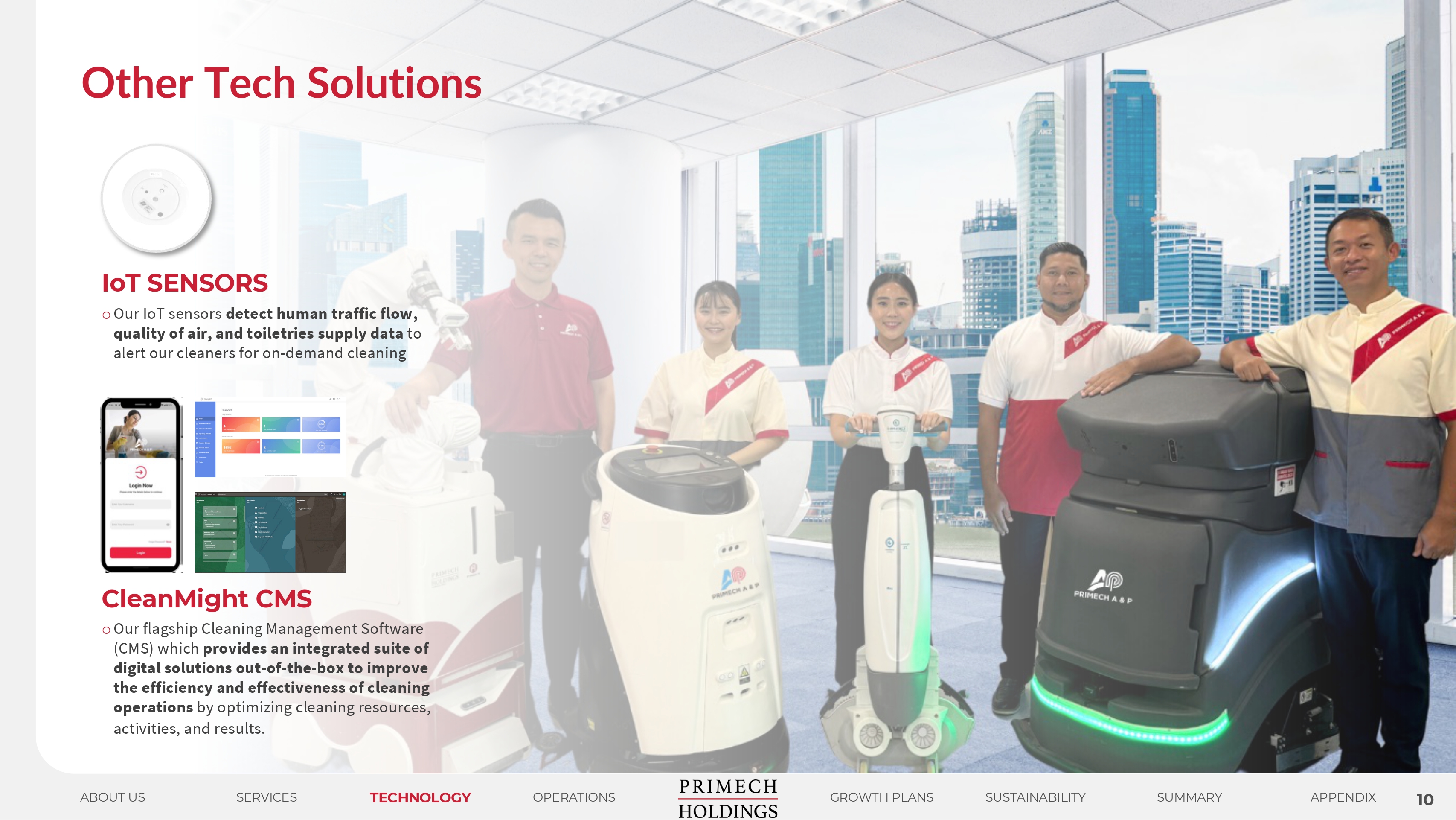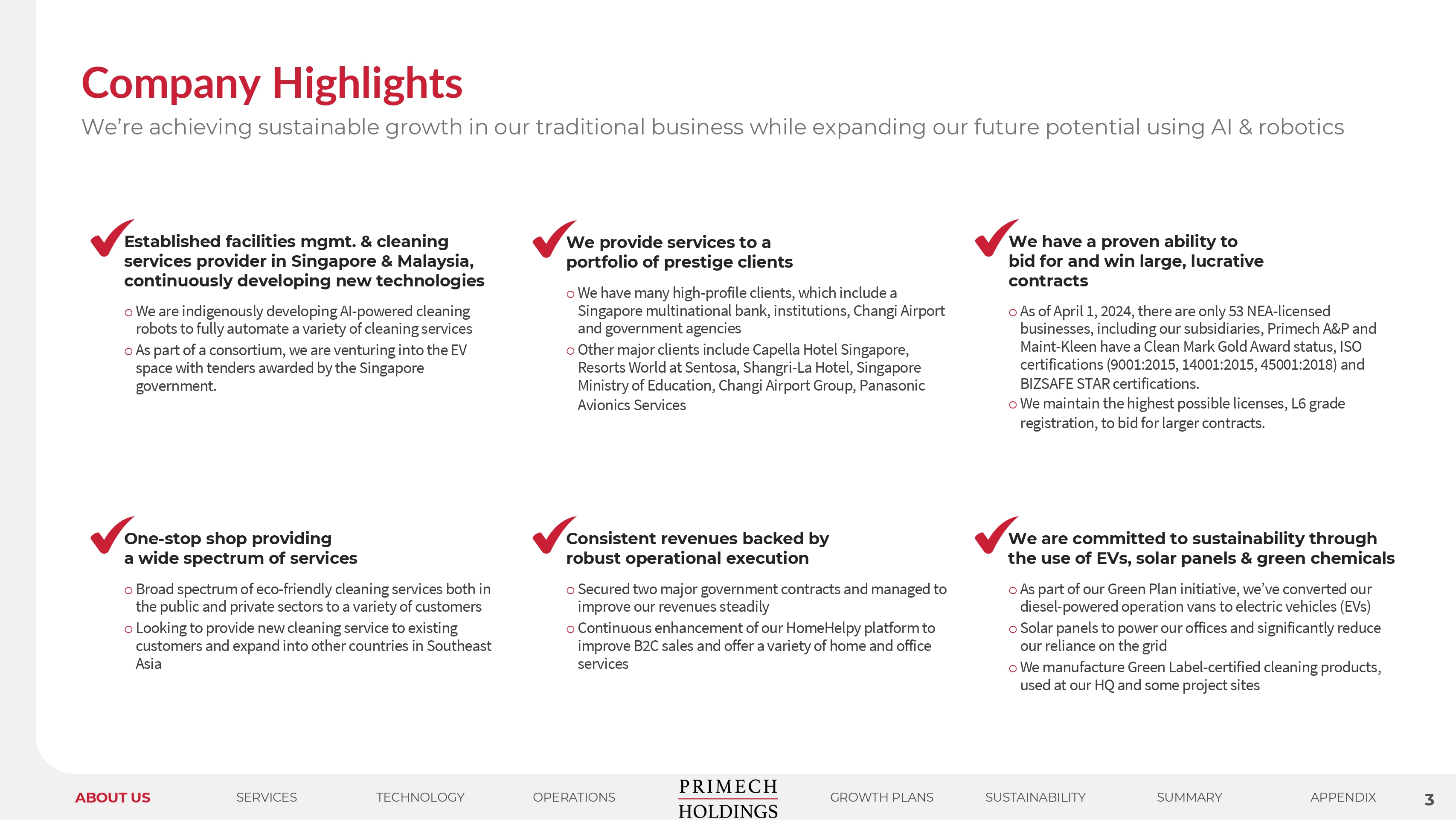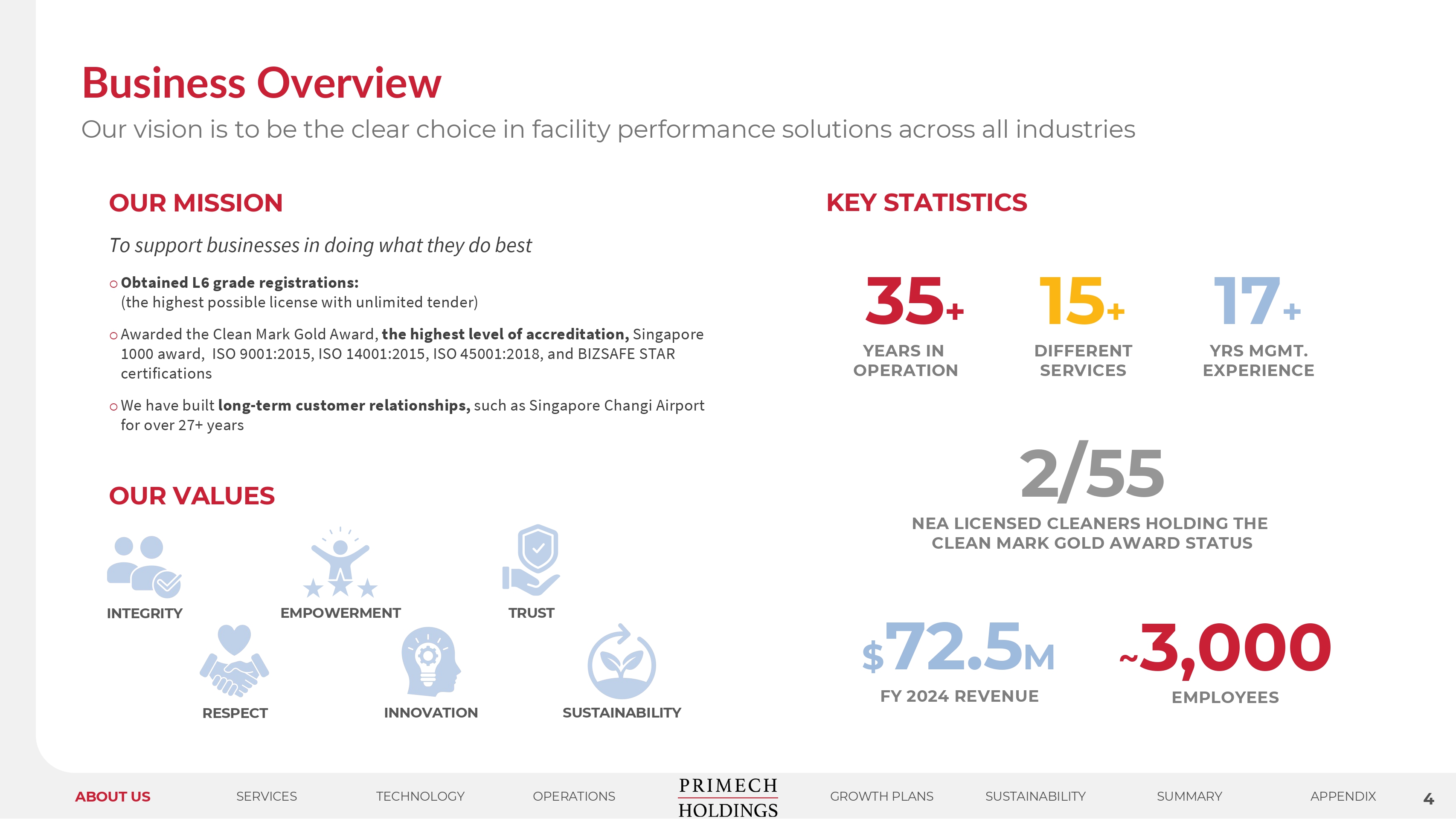 & cleaning services provider in Singapore & Malaysia, continuously developing new technologies o We are indigenously developing AI - powered cleaning robots to fully automate a variety of cleaning services o As part of a consortium, we are venturing into the EV space with tenders awarded by the Singapore government. One - stop shop providing a wide spectrum of services o Broad spectrum of eco - friendly cleaning services both in the public and private sectors to a variety of customers o Looking to provide new cleaning service to existing customers and expand into other countries in Southeast Asia We have a proven ability to bid for and win large, lucrative contracts o As of April 1, 2024, there are only 53 NEA - licensed businesses, including our subsidiaries, Primech A&P and Maint - Kleen have a Clean Mark Gold Award status, ISO certifications (9001:2015, 14001:2015, 45001:2018) and BIZSAFE STAR certifications. o We maintain the highest possible licenses, L6 grade registration, to bid for larger contracts. We provide services to a portfolio of prestige clients o We have many high - profile clients, which include a Singapore multinational bank, institutions, Changi Airport and government agencies o Other major clients include Capella Hotel Singapore, Resorts World at Sentosa, Shangri - La Hotel, Singapore Ministry of Education, Changi Airport Group, Panasonic Avionics Services Consistent revenues backed by robust operational execution o Secured two major government contracts and managed to improve our revenues steadily o Continuous enhancement of our HomeHelpy platform to improve B 2 C sales and offer a variety of home and office services We are committed to sustainability through the use of EVs, solar panels & green chemicals o As part of our Green Plan initiative, we’ve converted our diesel - powered operation vans to electric vehicles (EVs) o Solar panels to power our offices and significantly reduce our reliance on the grid o We manufacture Green Label - certified cleaning products, used at our HQ and some project sites ABOUT US SERVICES TECHNOLOGY OPERATIONS GROWTH PLANS SUSTAINABILITY SUMMARY APPENDIX 3 Business Overview Our vision is to be the clear choice in facility performance solutions across all industries OUR MISSION To support businesses in doing what they do best o Obtained L6 grade registrations: (the highest possible license with unlimited tender) o Awarded the Clean Mark Gold Award, the highest level of accreditation, Singapore 1000 award, ISO 9001:2015, ISO 14001:2015, ISO 45001:2018, and BIZSAFE STAR certifications o We have built long - term customer relationships, such as Singapore Changi Airport for over 27+ years OUR VALUES INTEGRITY ABOUT US SERVICES TECHNOLOGY OPERATIONS GROWTH PLANS SUSTAINABILITY SUMMARY APPENDIX 4 EMPOWERMENT TRUST RESPECT INNOVATION SUSTAINABILITY KEY STATISTICS YEARS IN OPERATION DIFFERENT SERVICES 35 + 15 + 17 + YRS MGMT.