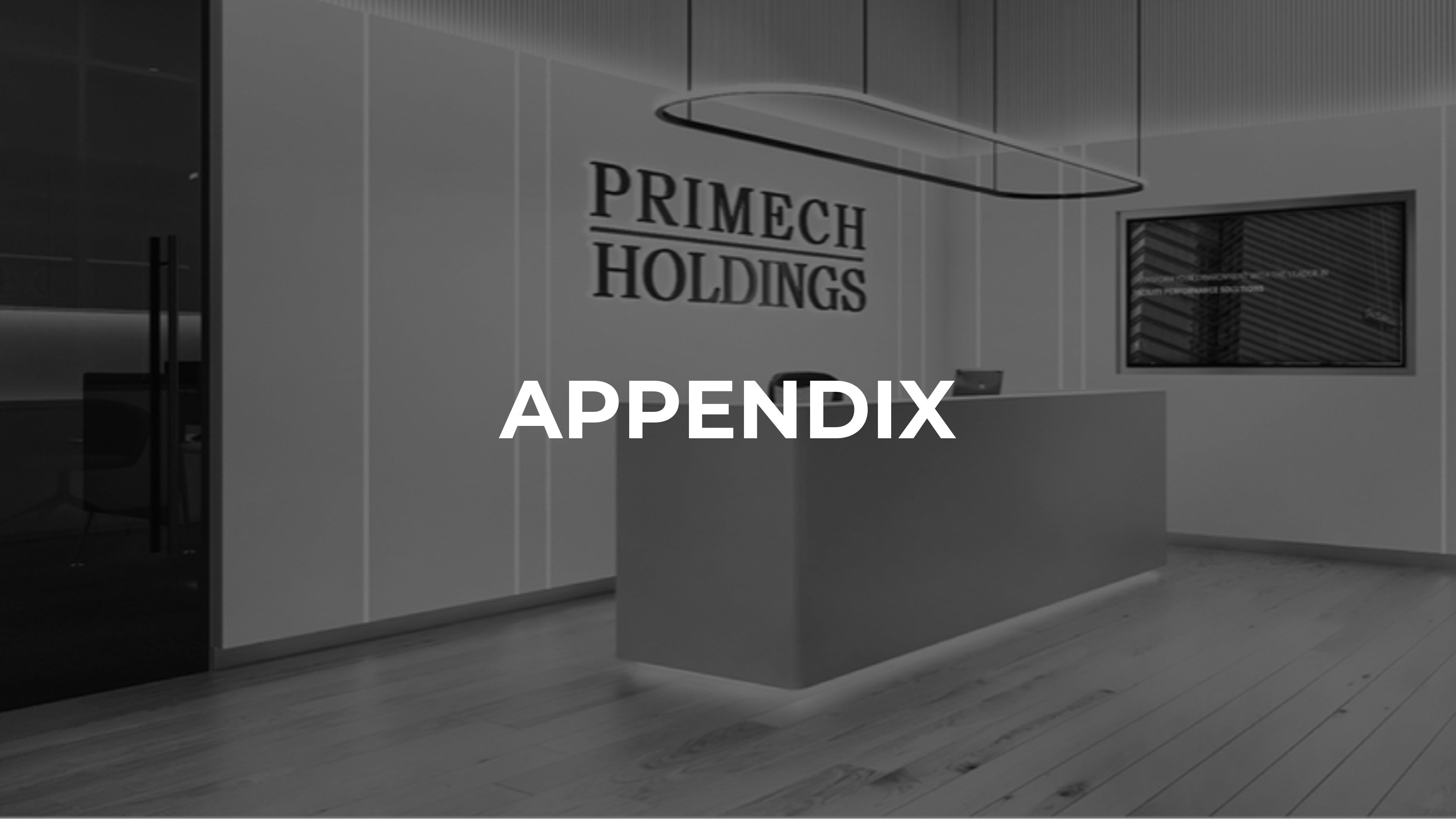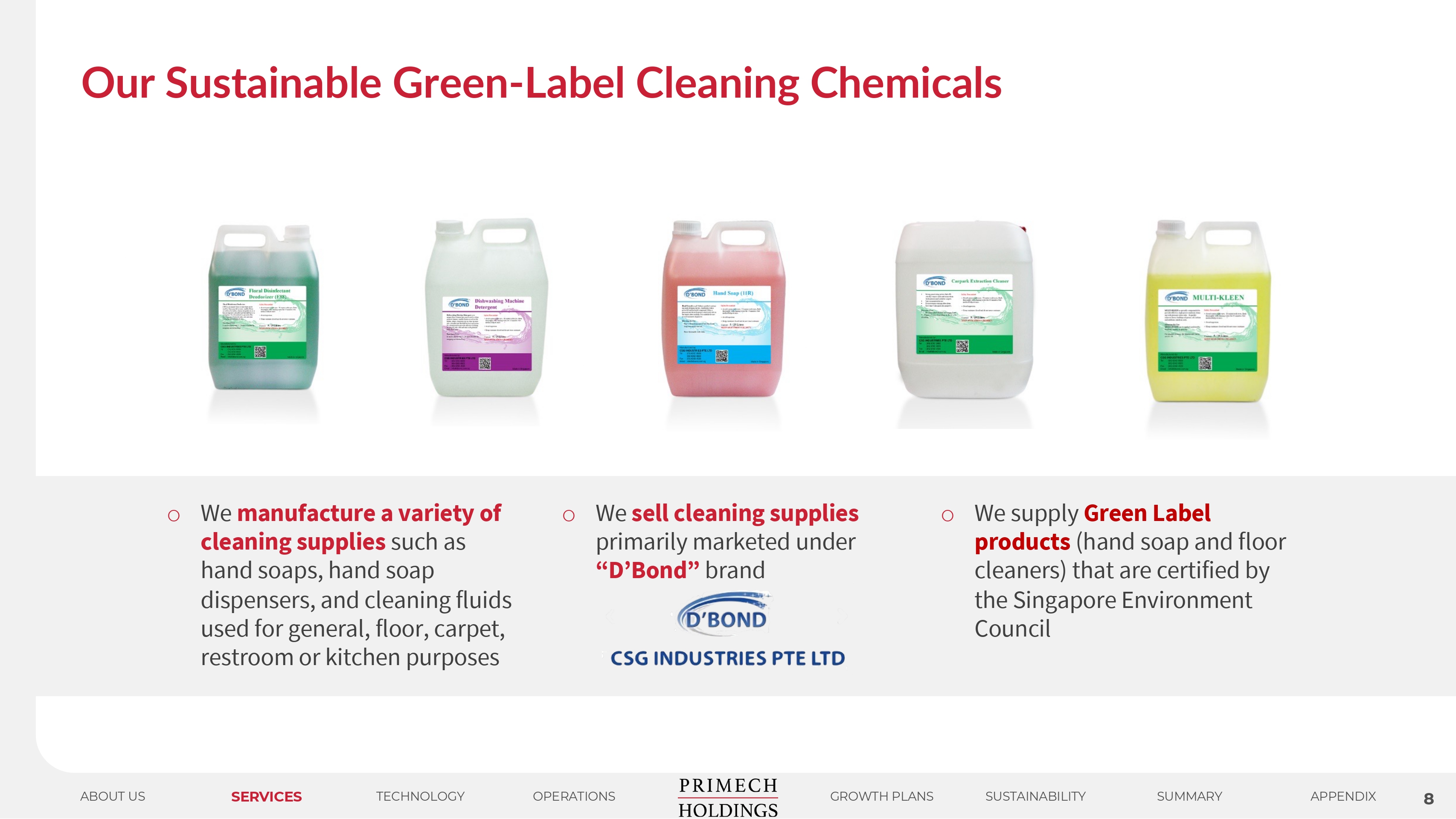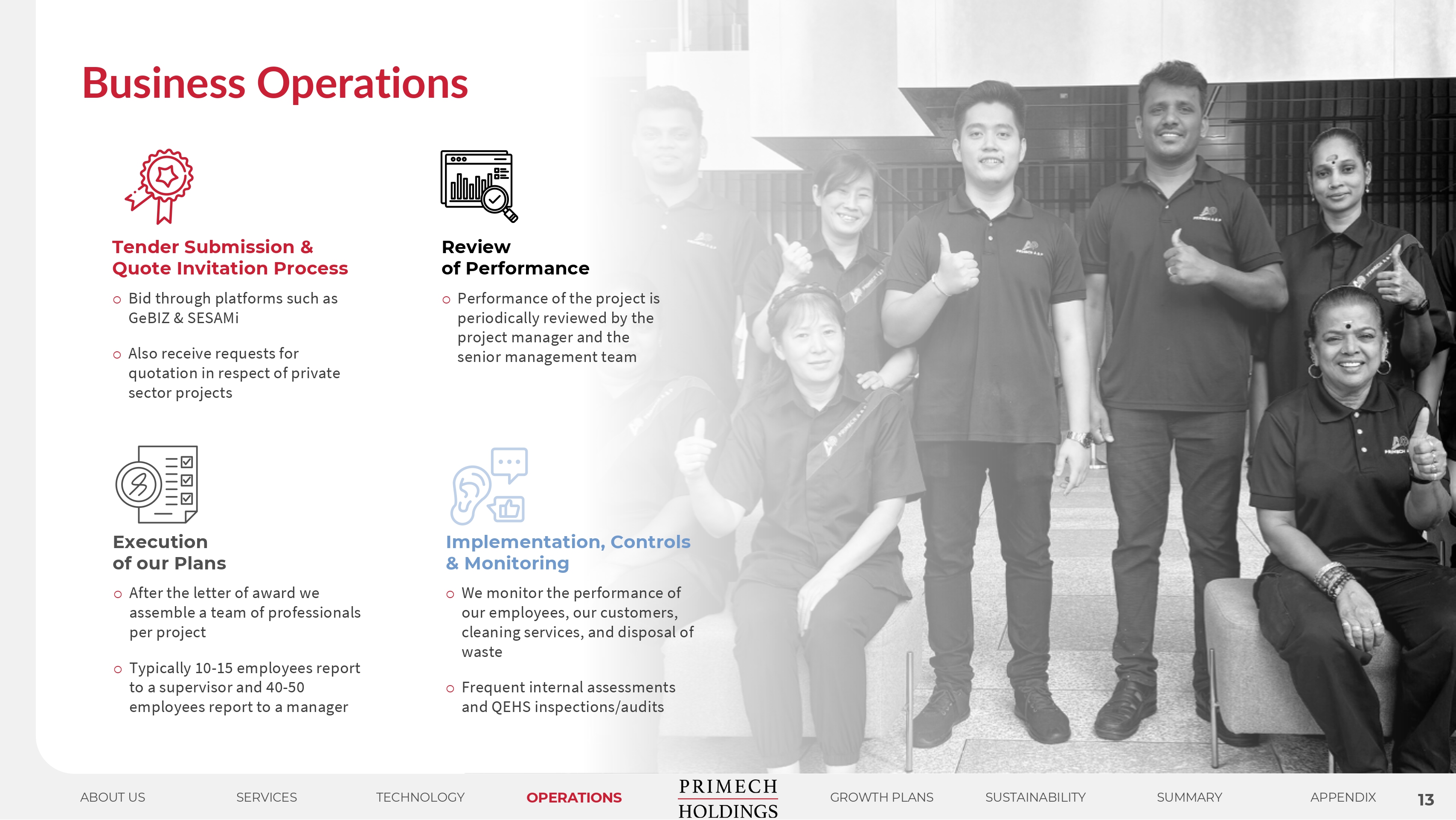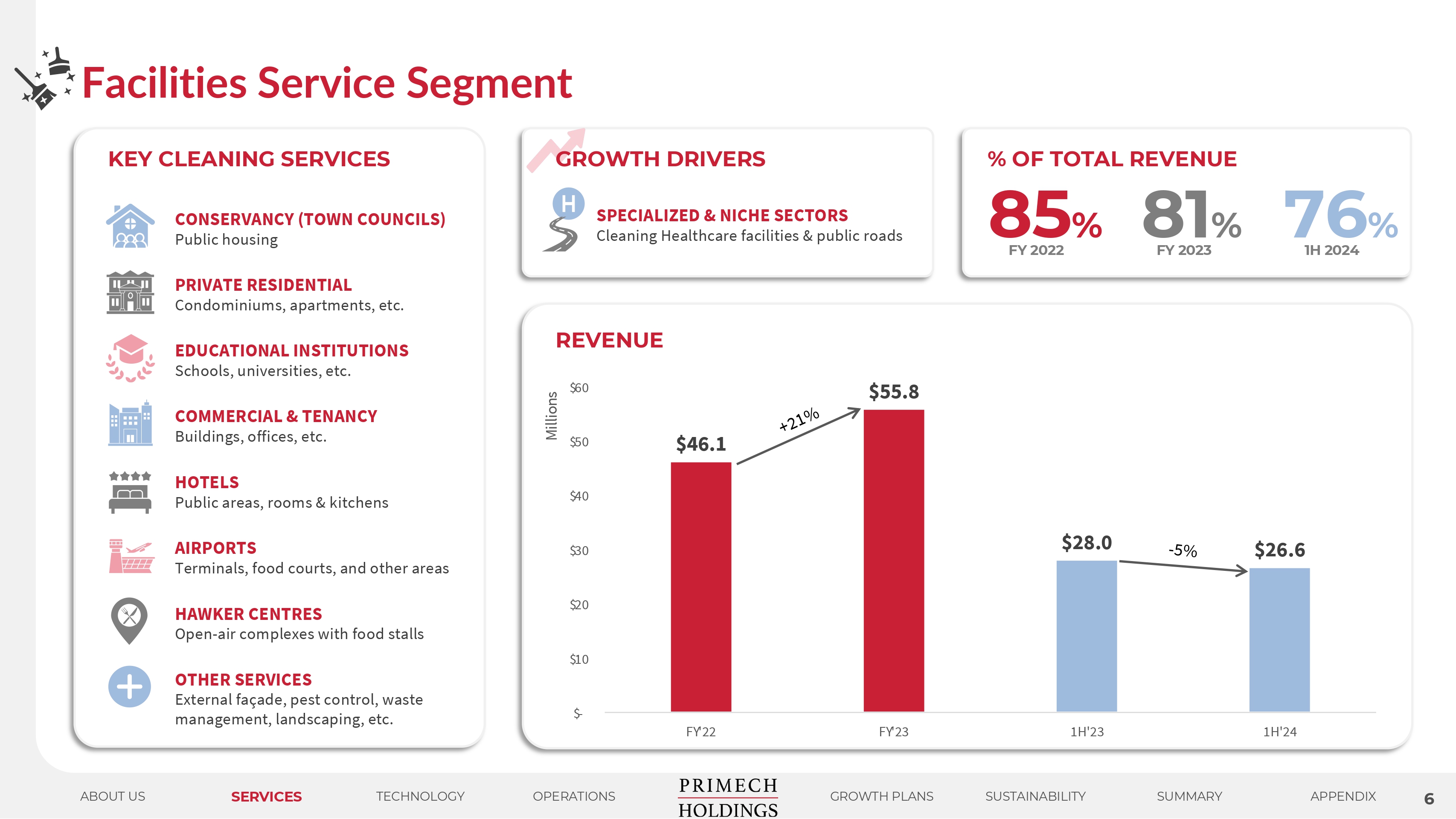 & cleaning services provider in Singapore & Malaysia, continuously developing new technologies o We are indigenously developing AI - powered cleaning robots to fully automate a variety of cleaning services o As part of a consortium, we are venturing into the EV space with tenders awarded by the Singapore government. One - stop shop providing a wide spectrum of services o Broad spectrum of eco - friendly cleaning services both in the public and private sectors to a variety of customers o Looking to provide new cleaning service to existing customers and expand into other countries in Southeast Asia We have a proven ability to bid for and win large, lucrative contracts o As of April 1, 2024, there are only 53 NEA - licensed businesses, including our subsidiaries, Primech A&P and Maint - Kleen have a Clean Mark Gold Award status, ISO certifications (9001:2015, 14001:2015, 45001:2018) and BIZSAFE STAR certifications. o We maintain the highest possible licenses, L6 grade registration, to bid for larger contracts. We provide services to a portfolio of prestige clients o We have many high - profile clients, which include a Singapore multinational bank, institutions, Changi Airport and government agencies o Other major clients include Capella Hotel Singapore, Resorts World at Sentosa, Shangri - La Hotel, Singapore Ministry of Education, Changi Airport Group, Panasonic Avionics Services Consistent revenues backed by robust operational execution o Secured two major government contracts and managed to improve our revenues steadily o Continuous enhancement of our HomeHelpy platform to improve B 2 C sales and offer a variety of home and office services We are committed to sustainability through the use of EVs, solar panels & green chemicals o As part of our Green Plan initiative, we’ve converted our diesel - powered operation vans to electric vehicles (EVs) o Solar panels to power our offices and significantly reduce our reliance on the grid o We manufacture Green Label - certified cleaning products, used at our HQ and some project sites ABOUT US SERVICES TECHNOLOGY OPERATIONS GROWTH PLANS SUSTAINABILITY SUMMARY APPENDIX 3 Business Overview Our vision is to be the clear choice in facility performance solutions across all industries OUR MISSION To support businesses in doing what they do best o Obtained L6 grade registrations: (the highest possible license with unlimited tender) o Awarded the Clean Mark Gold Award, the highest level of accreditation, Singapore 1000 award, ISO 9001:2015, ISO 14001:2015, ISO 45001:2018, and BIZSAFE STAR certifications o We have built long - term customer relationships, such as Singapore Changi Airport for over 27+ years OUR VALUES INTEGRITY ABOUT US SERVICES TECHNOLOGY OPERATIONS GROWTH PLANS SUSTAINABILITY SUMMARY APPENDIX 4 EMPOWERMENT TRUST RESPECT INNOVATION SUSTAINABILITY KEY STATISTICS YEARS IN OPERATION DIFFERENT SERVICES 35 + 15 + 17 + YRS MGMT.
