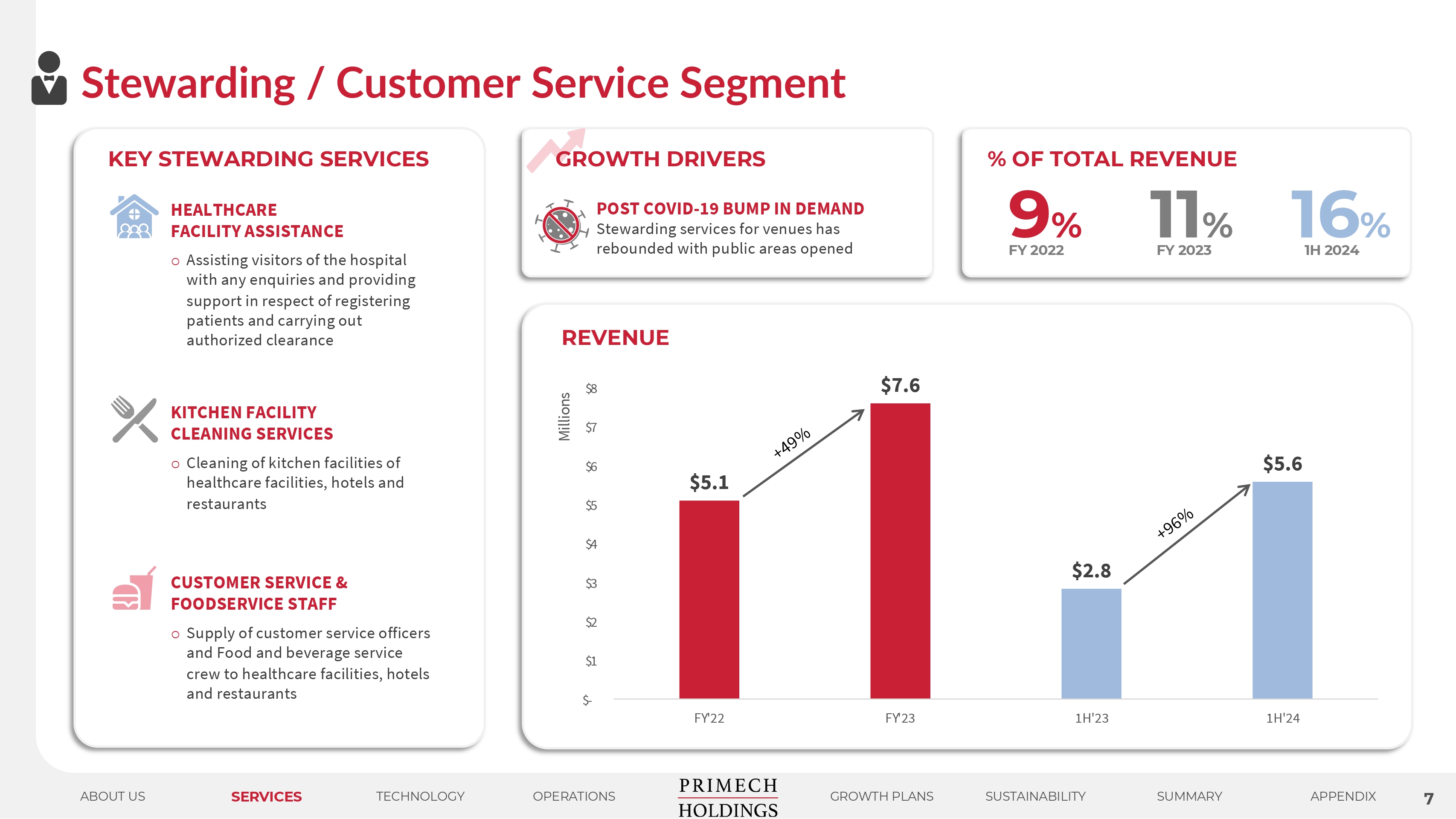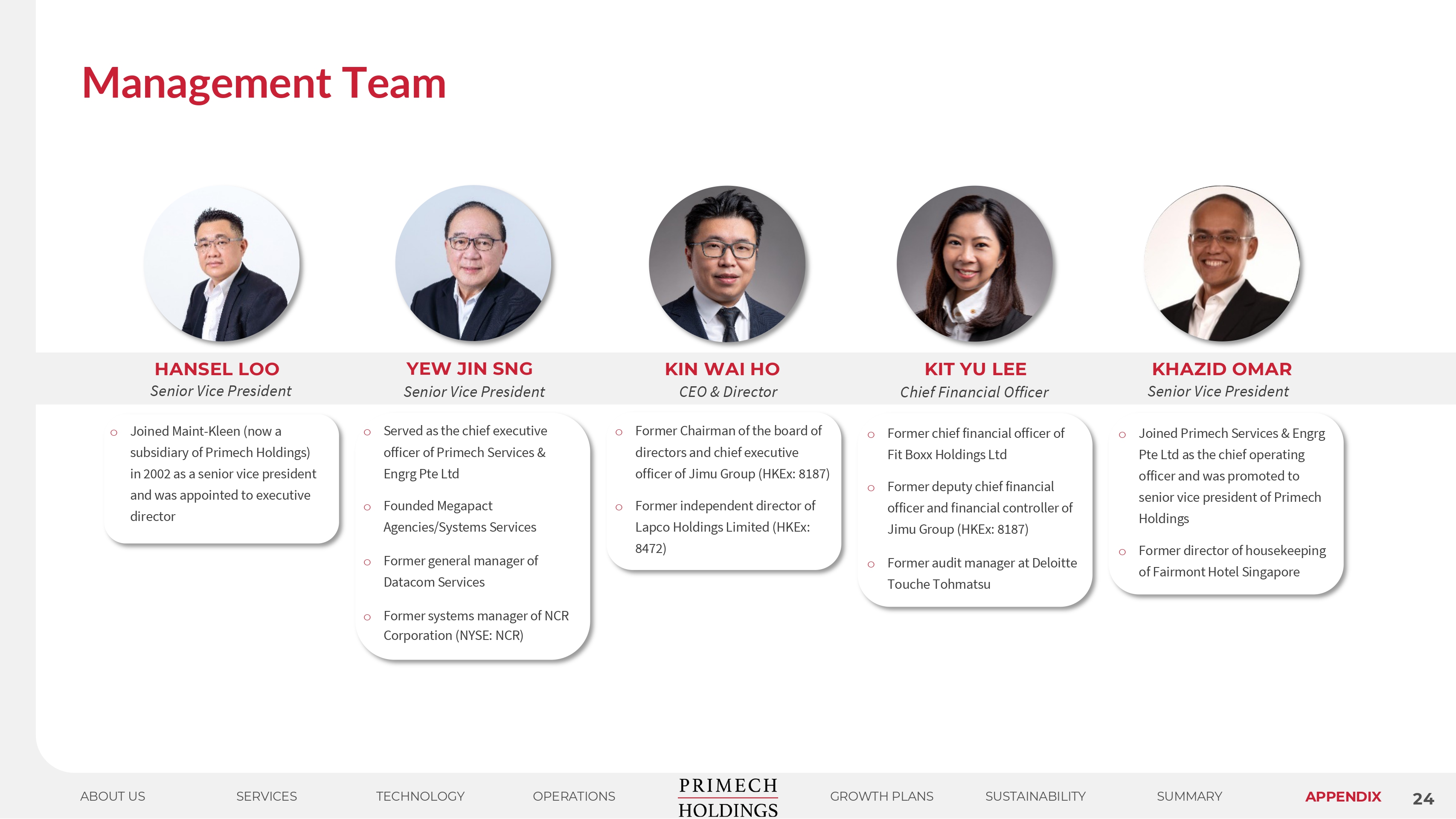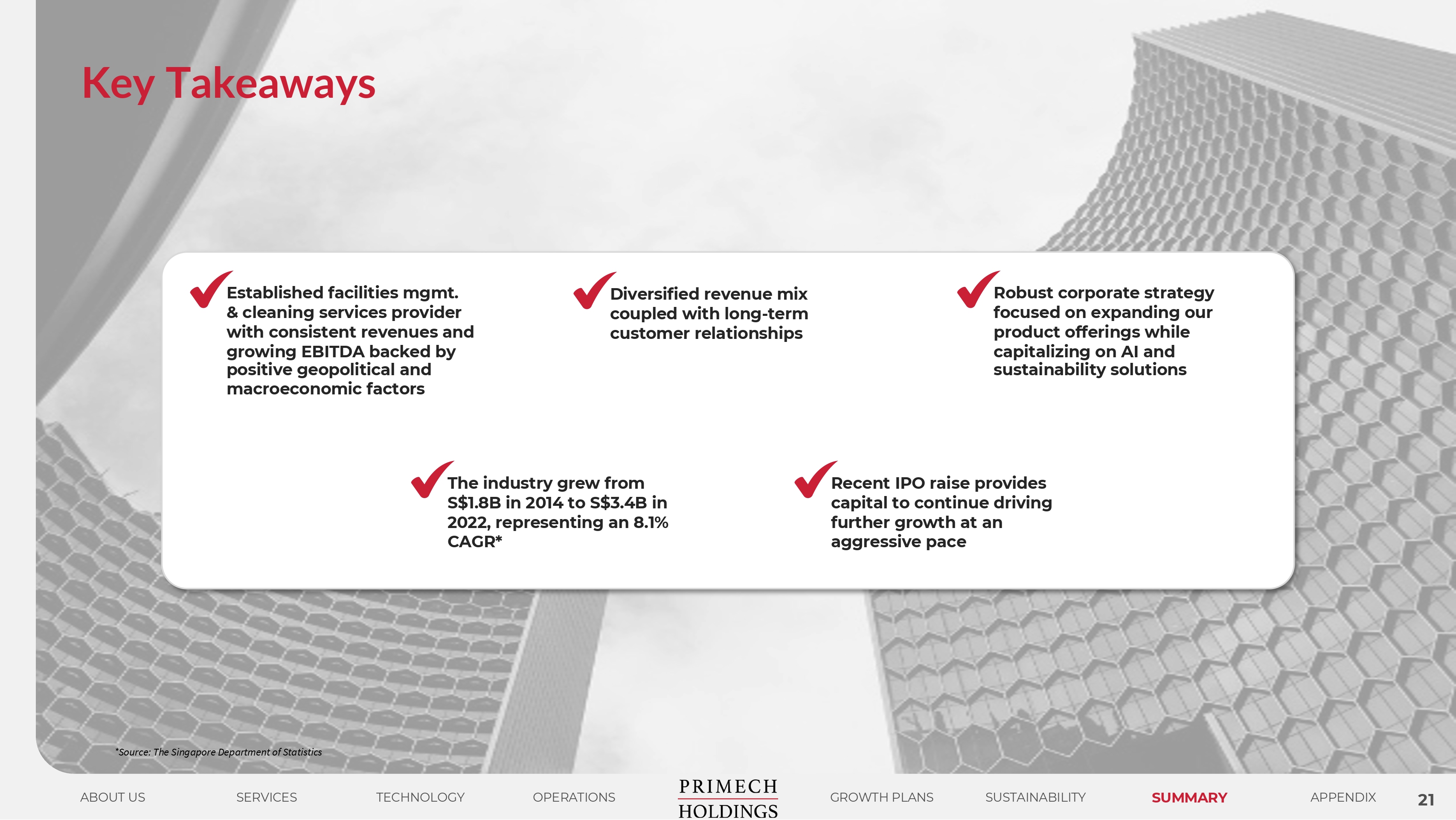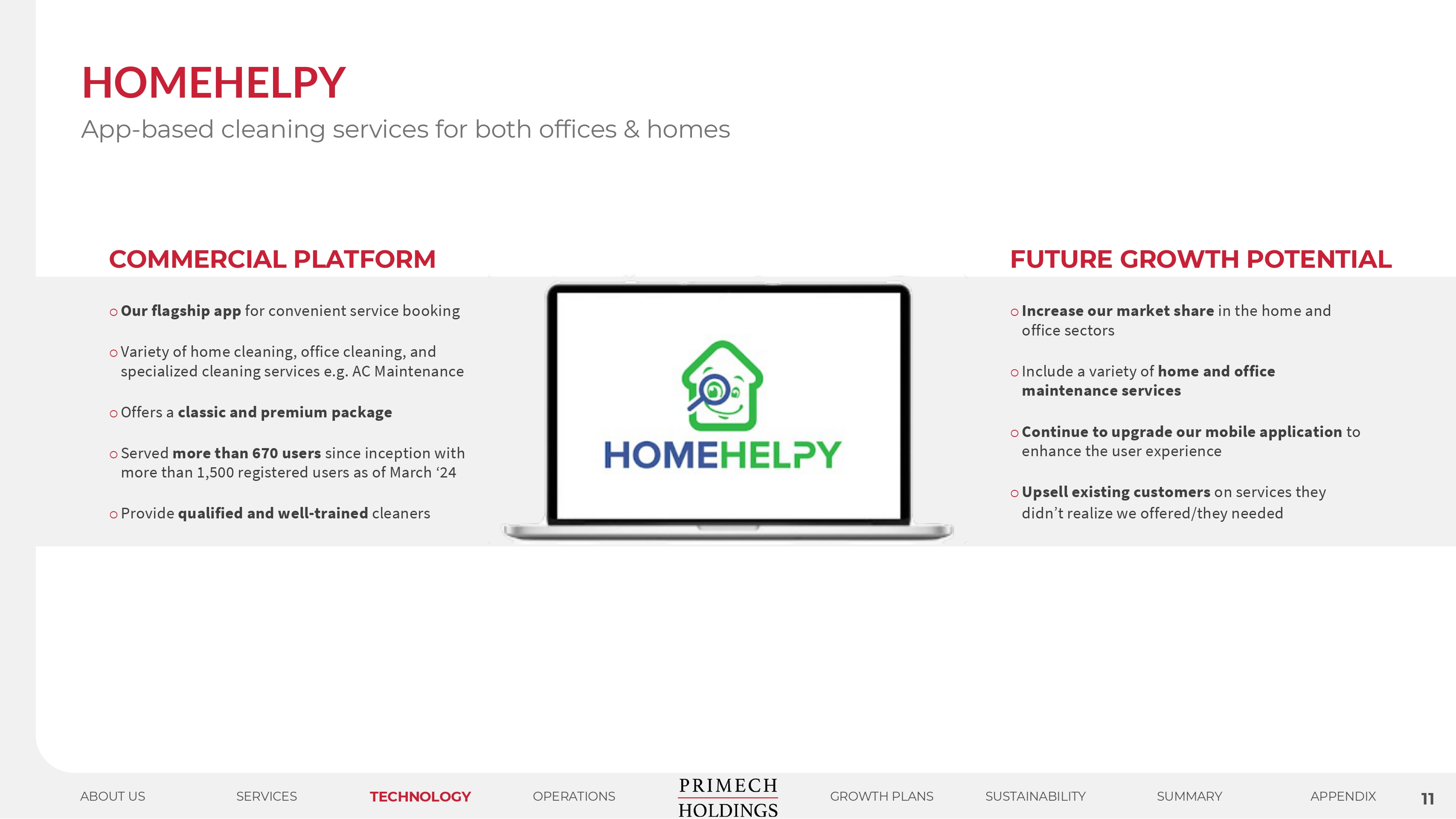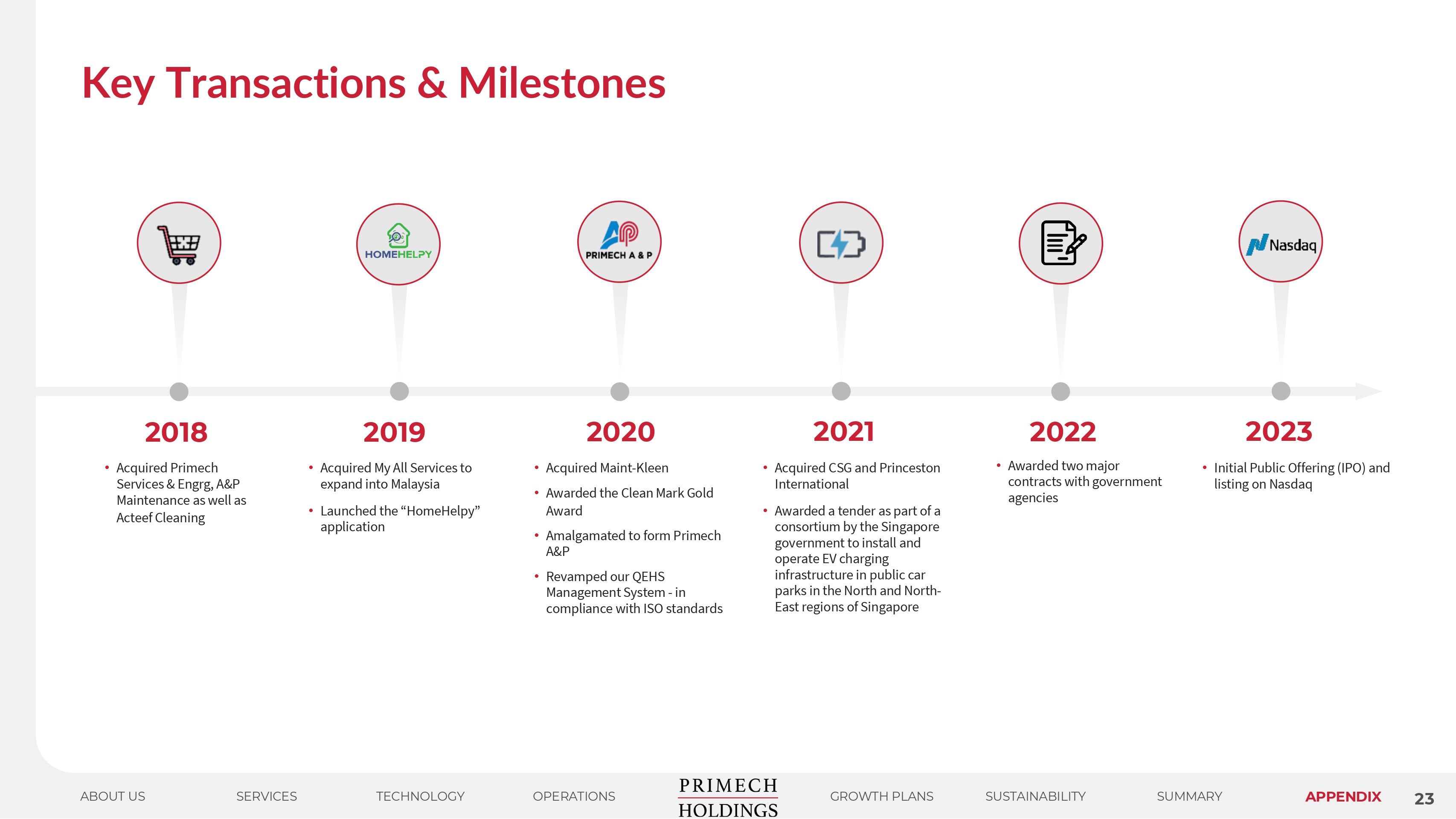 & cleaning services provider with consistent revenues and growing EBITDA backed by positive geopolitical and macroeconomic factors The industry grew from S$1.8B in 2014 to S$3.4B in 2022, representing an 8.1% CAGR* Robust corporate strategy focused on expanding our product offerings while capitalizing on AI and sustainability solutions Diversified revenue mix coupled with long - term customer relationships Recent IPO raise provides capital to continue driving further growth at an aggressive pace SUMMARY ABOUT US SERVICES TECHNOLOGY OPERATIONS GROWTH PLANS SUSTAINABILITY APPENDIX 21 *Source: The Singapore Department of Statistics Key Transactions & Milestones 2019 • Acquired My All Services to expand into Malaysia • Launched the “HomeHelpy” application 2018 • Acquired Primech Services & Engrg, A&P Maintenance as well as Acteef Cleaning 2021 • Acquired CSG and Princeston International • Awarded a tender as part of a consortium by the Singapore government to install and operate EV charging infrastructure in public car parks in the North and North - East regions of Singapore 2020 • Acquired Maint - Kleen • Awarded the Clean Mark Gold Award • Amalgamated to form Primech A&P • Revamped our QEHS Management System - in compliance with ISO standards 2022 • Awarded two major contracts with government agencies 2023 • Initial Public Offering (IPO) and listing on Nasdaq APPENDIX ABOUT US SERVICES TECHNOLOGY OPERATIONS GROWTH PLANS SUSTAINABILITY SUMMARY 23