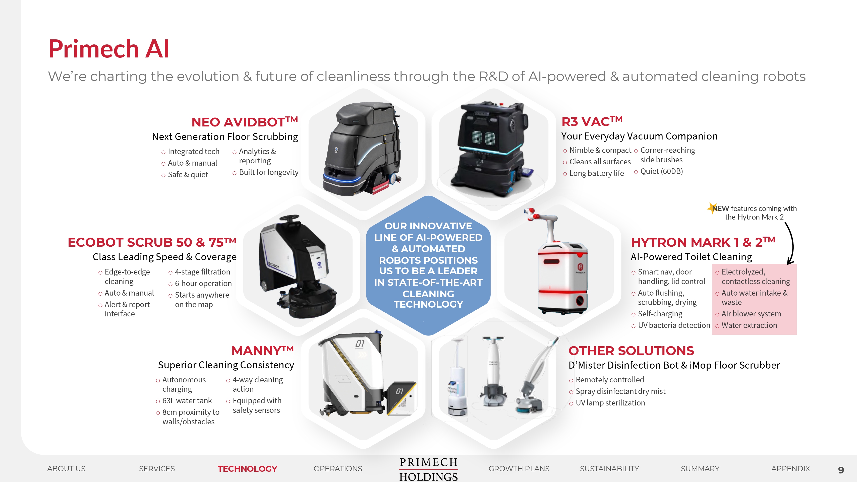 Primech AI We’re charting the evolution & future of cleanliness through the R&D of AI - powered & automated cleaning robots OUR INNOVATIVE LINE OF AI - POWERED & AUTOMATED ROBOTS POSITIONS US TO BE A LEADER IN STATE - OF - THE - ART CLEANING TECHNOLOGY ECOBOT SCRUB 50 & 75 Class Leading Speed & Coverage HYTRON MARK 1 & 2 TM AI - Powered Toilet Cleaning o Auto & manual o Safe & quiet NEO AVIDBOT TM Next Generation Floor Scrubbing o Integrated tech o Analytics & reporting o Built for longevity o Edge - to - edge cleaning o Auto & manual o Alert & report interface o 4 - stage filtration o 6 - hour operation o Starts anywhere on the map o 8cm proximity to walls/obstacles MANNY Superior Cleaning Consistency o Autonomous o 4 - way cleaning charging action o 63L water tank o Equipped with safety sensors o Cleans all surfaces o Long battery life R3 VAC TM Your Everyday Vacuum Companion o Nimble & compact o Corner - reaching side brushes o Quiet (60DB) o Smart nav, door handling, lid control o Auto flushing, scrubbing, drying o Self - charging o UV bacteria detection o Electrolyzed, contactless cleaning o Auto water intake & waste o Air blower system o Water extraction NEW features coming with the Hytron Mark 2 SUMMARY ABOUT US SERVICES TECHNOLOGY OPERATIONS GROWTH PLANS SUSTAINABILITY APPENDIX 9 OTHER SOLUTIONS D’Mister Disinfection Bot & iMop Floor Scrubber o Remotely controlled o Spray disinfectant dry mist o UV lamp sterilization Other Tech Solutions IoT SENSORS o Our IoT sensors detect human traffic flow, quality of air, and toiletries supply data to alert our cleaners for on - demand cleaning CleanMight CMS o Our flagship Cleaning Management Software (CMS) which provides an integrated suite of digital solutions out - of - the - box to improve the efficiency and effectiveness of cleaning operations by optimizing cleaning resources, activities, and results.