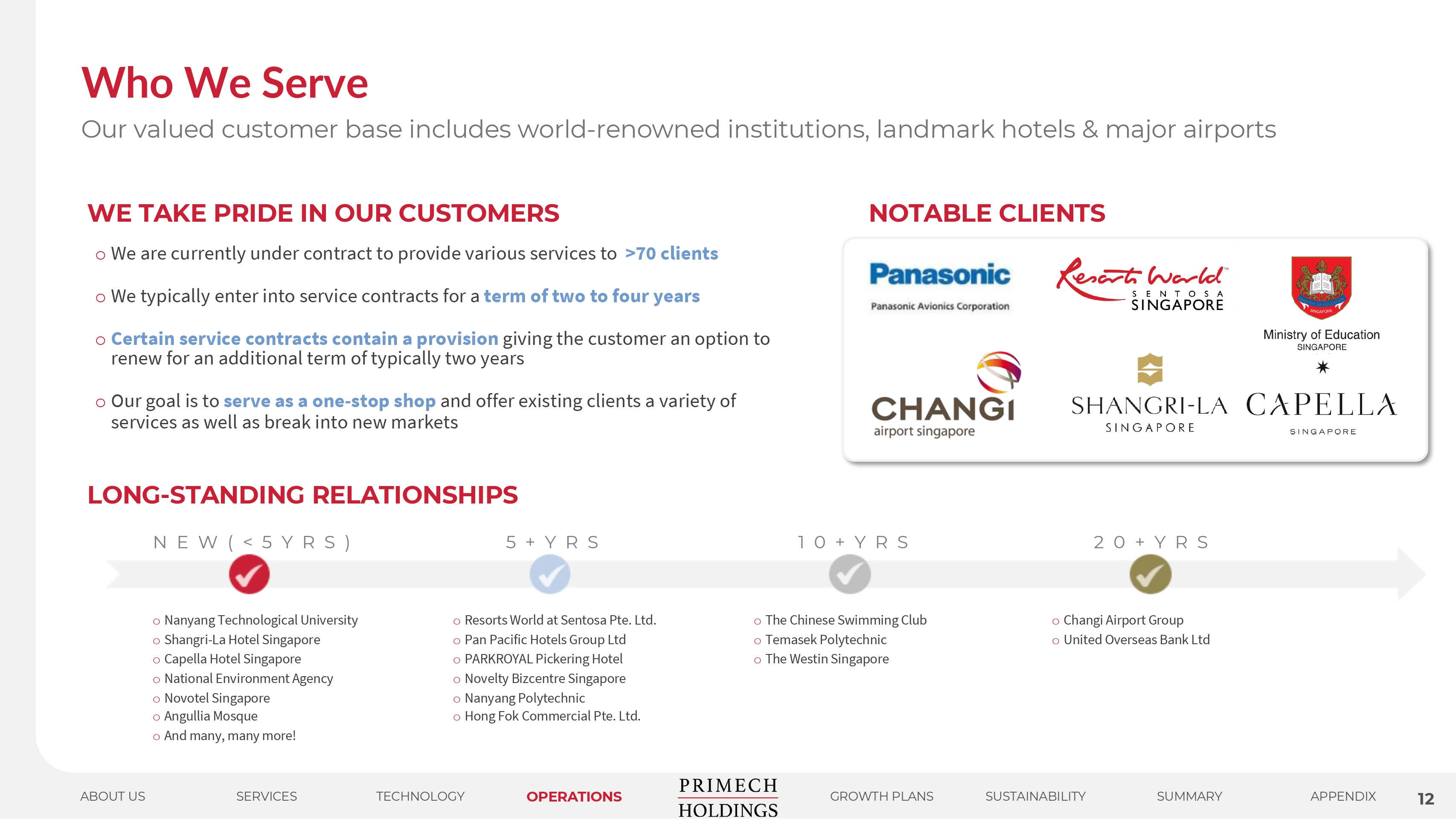 AC Maintenance o Offers a classic and premium package o Served more than 670 users since inception with more than 1,500 registered users as of March ‘24 o Provide qualified and well - trained cleaners FUTURE GROWTH POTENTIAL o Increase our market share in the home and office sectors o Include a variety of home and office maintenance services o Continue to upgrade our mobile application to enhance the user experience o Upsell existing customers on services they didn’t realize we offered/they needed Who We Serve Our valued customer base includes world - renowned institutions, landmark hotels & major airports NOTABLE CLIENTS WE TAKE PRIDE IN OUR CUSTOMERS o We are currently under contract to provide various services to >70 clients o We typically enter into service contracts for a term of two to four years o Certain service contracts contain a provision giving the customer an option to renew for an additional term of typically two years o Our goal is to serve as a one - stop shop and offer existing clients a variety of services as well as break into new markets LONG - STANDING RELATIONSHIPS N E W ( < 5 Y R S ) 5 + Y R S SUMMARY ABOUT US SERVICES TECHNOLOGY OPERATIONS GROWTH PLANS SUSTAINABILITY APPENDIX 12 1 0 + Y R S 2 0 + Y R S o Nanyang Technological University o Shangri - La Hotel Singapore o Capella Hotel Singapore o National Environment Agency o Novotel Singapore o Angullia Mosque o And many, many more! o Resorts World at Sentosa Pte. Ltd. o Pan Pacific Hotels Group Ltd o PARKROYAL Pickering Hotel o Novelty Bizcentre Singapore o Nanyang Polytechnic o Hong Fok Commercial Pte. Ltd.