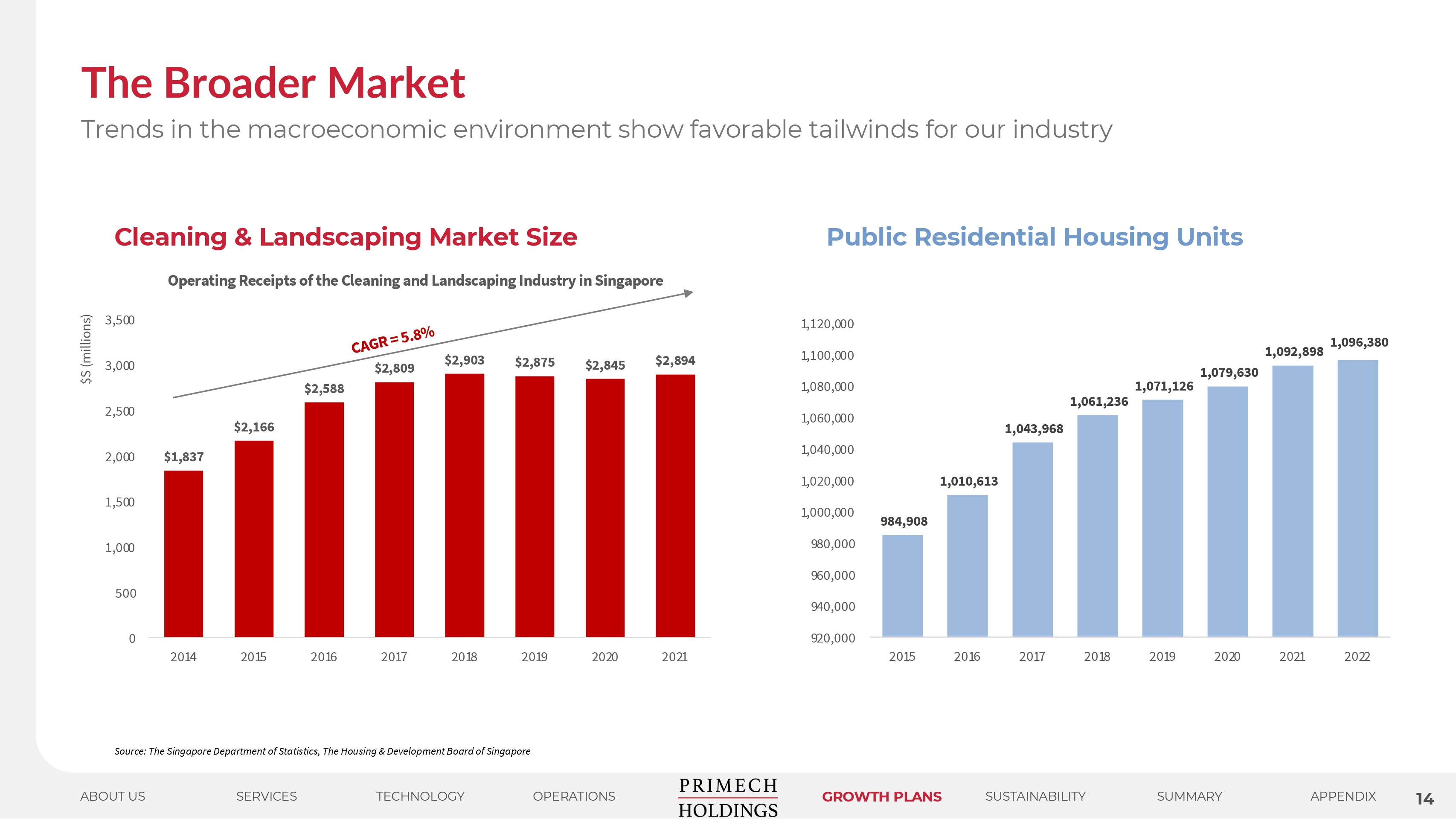 o The Chinese Swimming Club o Temasek Polytechnic o The Westin Singapore o Changi Airport Group o United Overseas Bank Ltd Business Operations SUMMARY ABOUT US SERVICES TECHNOLOGY OPERATIONS GROWTH PLANS SUSTAINABILITY APPENDIX 13 Tender Submission & Quote Invitation Process o Bid through platforms such as GeBIZ & SESAMi o Also receive requests for quotation in respect of private sector projects Review of Performance o Performance of the project is periodically reviewed by the project manager and the senior management team Execution of our Plans o After the letter of award we assemble a team of professionals per project o Typically 10 - 15 employees report to a supervisor and 40 - 50 employees report to a manager Implementation, Controls & Monitoring o We monitor the performance of our employees, our customers, cleaning services, and disposal of waste o Frequent internal assessments and QEHS inspections/audits The Broader Market Trends in the macroeconomic environment show favorable tailwinds for our industry $1,837 $2,166 $2,588 $2,809 $2,903 $2,875 $2,845 $2,894 0 500 1,000 1,500 2,000 2,500 3,000 3,500 2014 2015 2016 2017 2018 2019 2020 2021 $S (millions) Operating Receipts of the Cleaning and Landscaping Industry in Singapore 984,908 SUMMARY ABOUT US SERVICES TECHNOLOGY OPERATIONS GROWTH PLANS SUSTAINABILITY APPENDIX 14 1,010,613 1,043,968 1,061,236 1,071,126 1,079,630 1,092,898 1,096,380 1,120,000 1,100,000 1,080,000 1,060,000 1,040,000 1,020,000 1,000,000 980,000 960,000 940,000 920,000 2015 2016 2017 2018 2019 2020 2021 2022 Source: The Singapore Department of Statistics, The Housing & Development Board of Singapore Public Residential Housing Units Cleaning & Landscaping Market Size