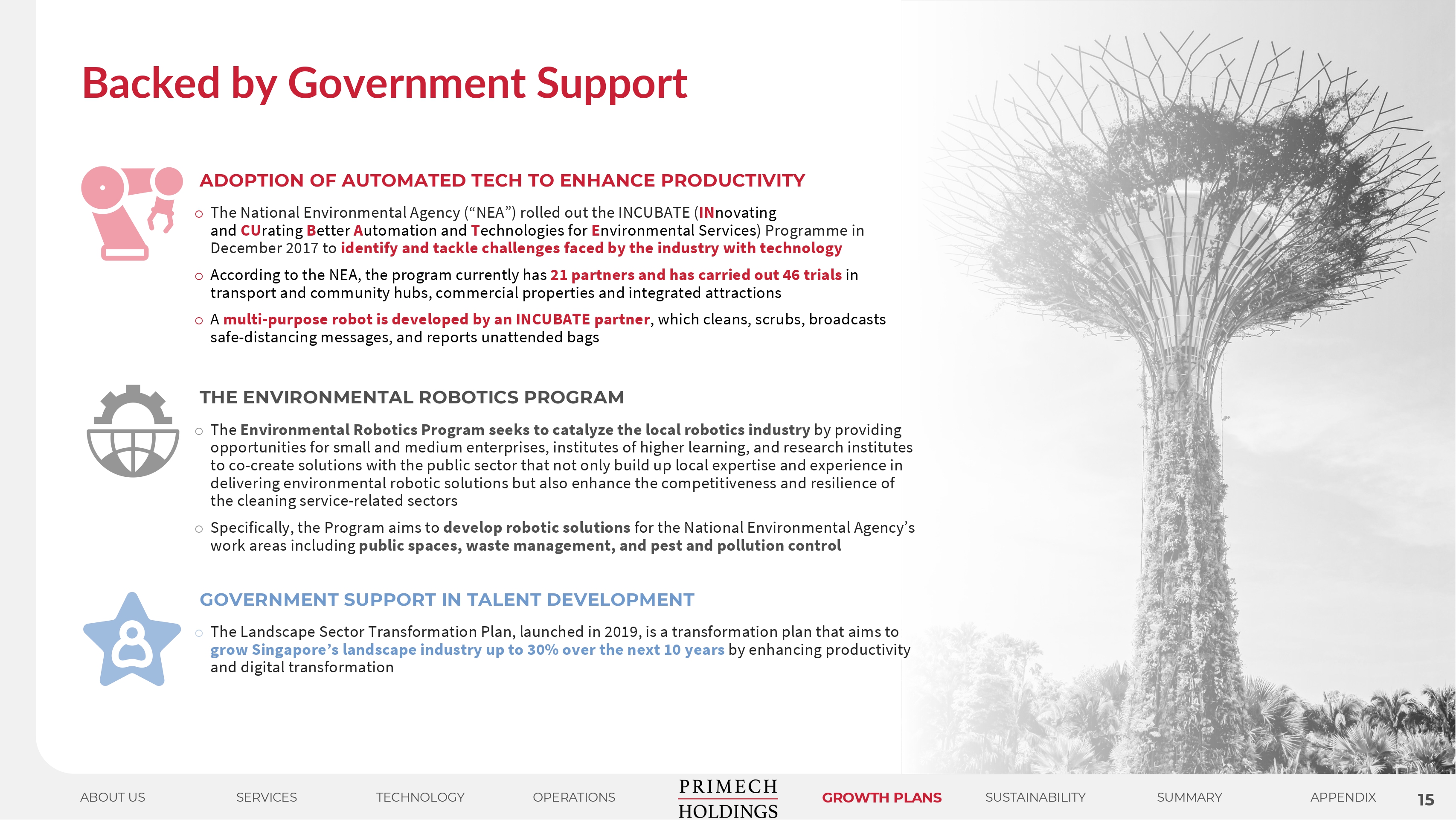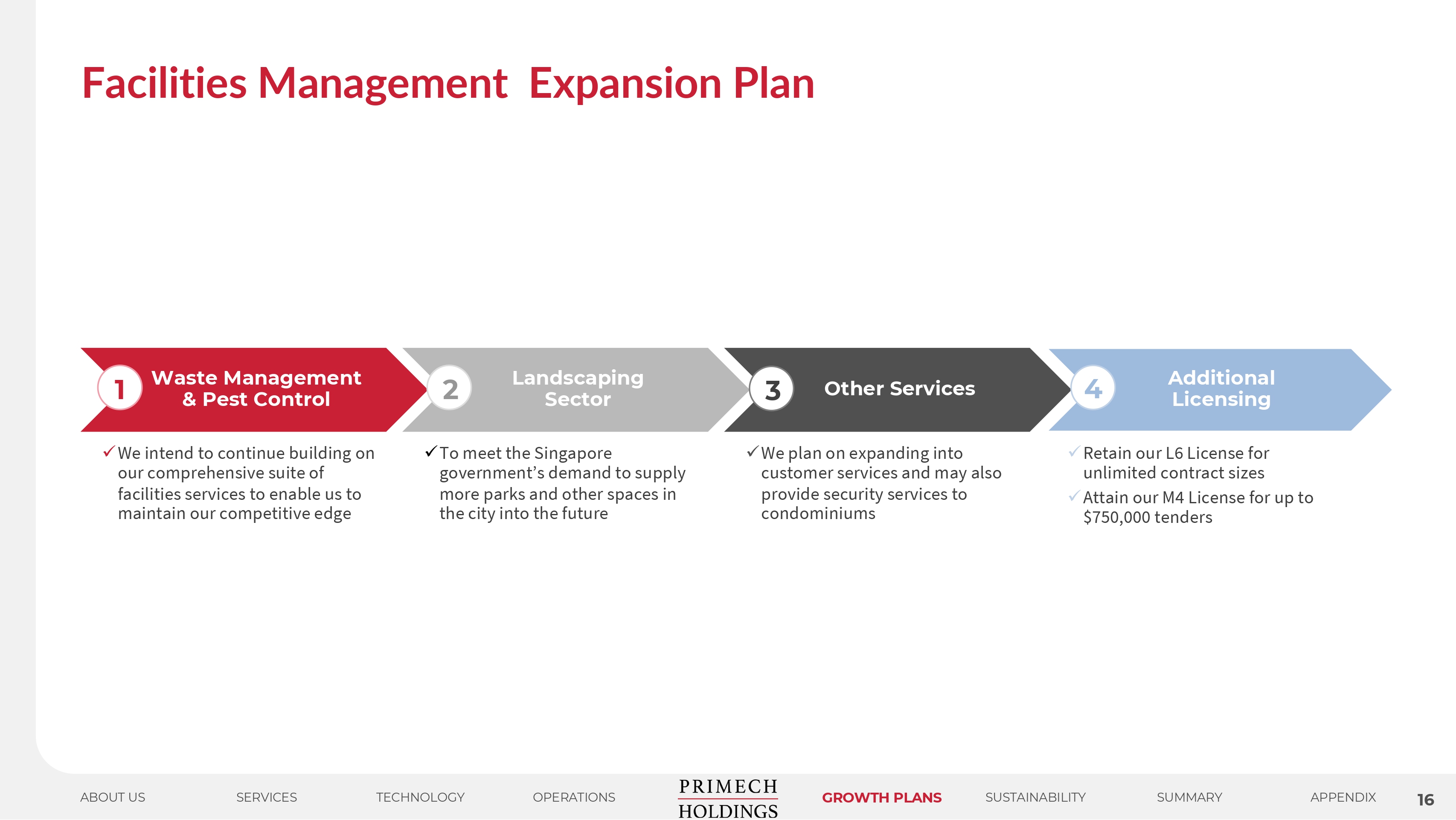 Backed by Government Support ADOPTION OF AUTOMATED TECH TO ENHANCE PRODUCTIVITY o The National Environmental Agency (“NEA”) rolled out the INCUBATE ( IN novating and CU rating B etter A utomation and T echnologies for E nvironmental Services ) Programme in December 2017 to identify and tackle challenges faced by the industry with technology o According to the NEA, the program currently has 21 partners and has carried out 46 trials in transport and community hubs, commercial properties and integrated attractions o A multi - purpose robot is developed by an INCUBATE partner , which cleans, scrubs, broadcasts safe - distancing messages, and reports unattended bags THE ENVIRONMENTAL ROBOTICS PROGRAM o The Environmental Robotics Program seeks to catalyze the local robotics industry by providing opportunities for small and medium enterprises, institutes of higher learning, and research institutes to co - create solutions with the public sector that not only build up local expertise and experience in delivering environmental robotic solutions but also enhance the competitiveness and resilience of the cleaning service - related sectors o Specifically, the Program aims to develop robotic solutions for the National Environmental Agency’s work areas including public spaces, waste management, and pest and pollution control GOVERNMENT SUPPORT IN TALENT DEVELOPMENT o The Landscape Sector Transformation Plan, launched in 2019, is a transformation plan that aims to grow Singapore’s landscape industry up to 30% over the next 10 years by enhancing productivity and digital transformation SUMMARY ABOUT US SERVICES TECHNOLOGY OPERATIONS GROWTH PLANS SUSTAINABILITY APPENDIX 15 Facilities Management Expansion Plan Waste Management & Pest Control x We intend to continue building on our comprehensive suite of facilities services to enable us to maintain our competitive edge Landscaping Sector x To meet the Singapore government’s demand to supply more parks and other spaces in the city into the future Other Services x We plan on expanding into customer services and may also provide security services to condominiums Additional Licensing x Retain our L6 License for unlimited contract sizes x Attain our M4 License for up to $750,000 tenders 1 2 3 4 SUMMARY ABOUT US SERVICES TECHNOLOGY OPERATIONS GROWTH PLANS SUSTAINABILITY APPENDIX 16