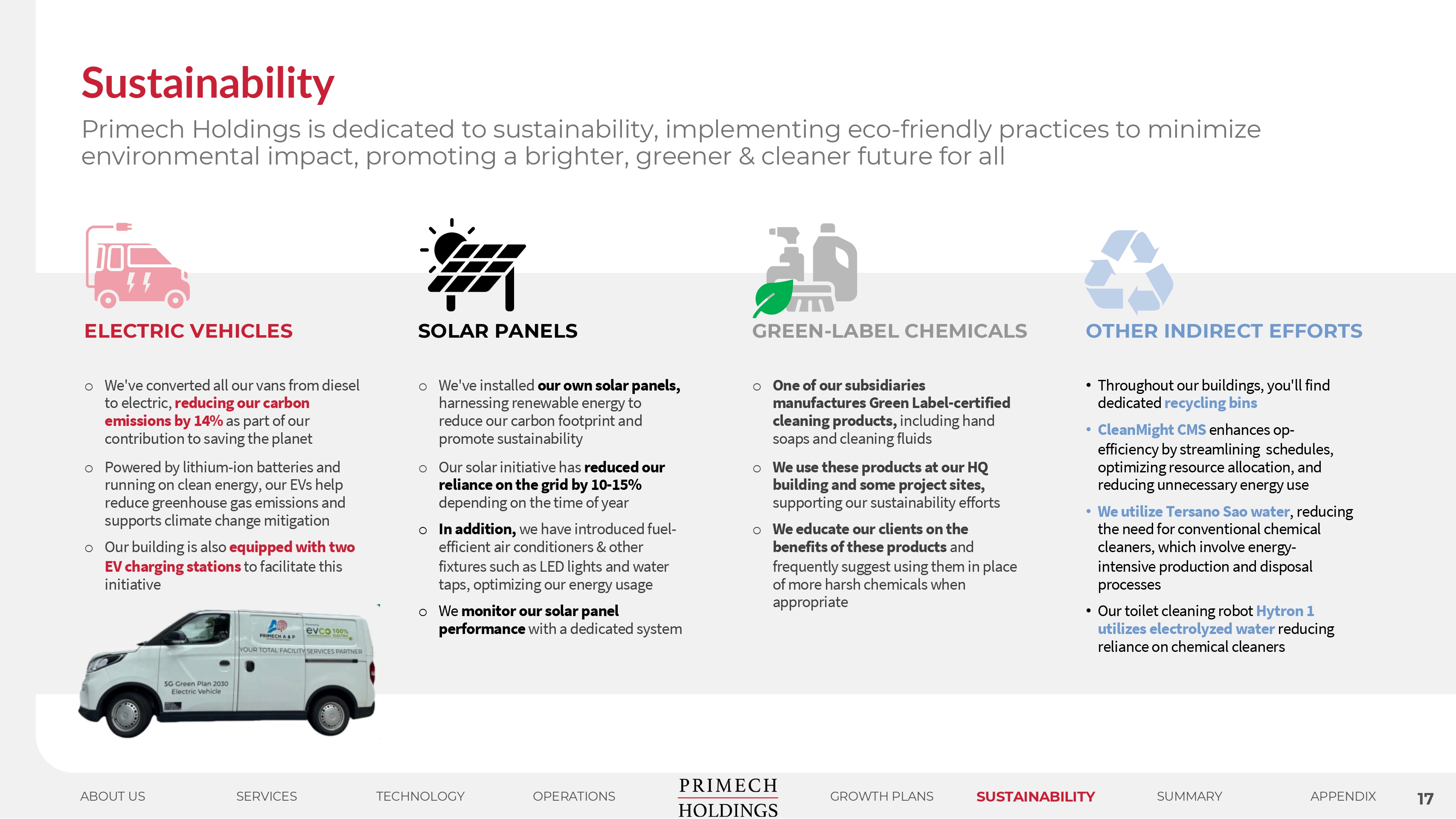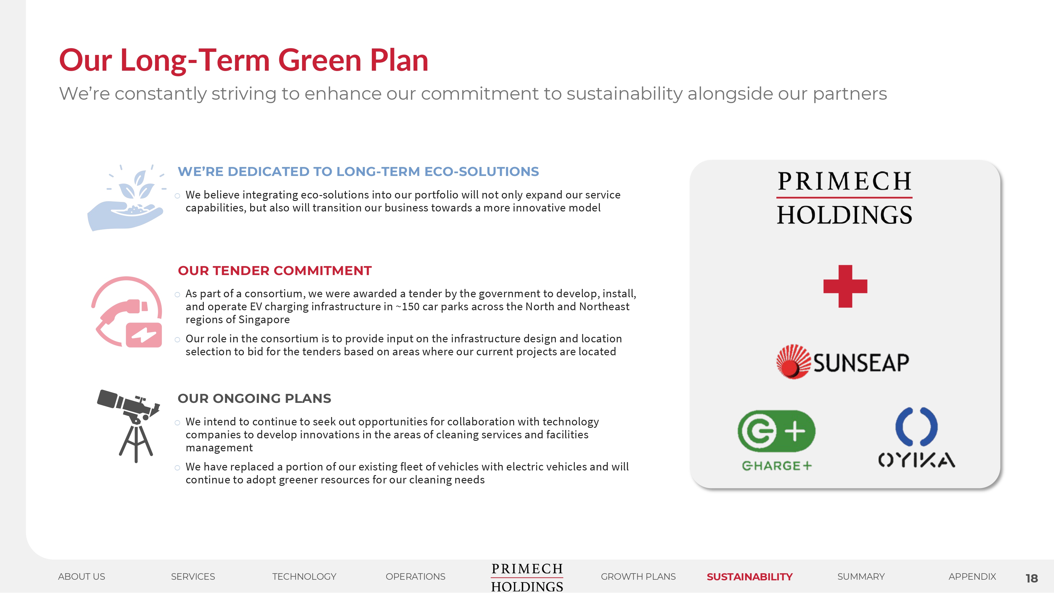 Sustainability Primech Holdings is dedicated to sustainability, implementing eco - friendly practices to minimize environmental impact, promoting a brighter, greener & cleaner future for all ELECTRIC VEHICLES o We've converted all our vans from diesel to electric, reducing our carbon emissions by 14% as part of our contribution to saving the planet o Powered by lithium - ion batteries and running on clean energy, our EVs help reduce greenhouse gas emissions and supports climate change mitigation o Our building is also equipped with two EV charging stations to facilitate this initiative SOLAR PANELS o We've installed our own solar panels, harnessing renewable energy to reduce our carbon footprint and promote sustainability o Our solar initiative has reduced our reliance on the grid by 10 - 15% depending on the time of year o In addition, we have introduced fuel - efficient air conditioners & other fixtures such as LED lights and water taps, optimizing our energy usage o We monitor our solar panel performance with a dedicated system GREEN - LABEL CHEMICALS o One of our subsidiaries manufactures Green Label - certified cleaning products, including hand soaps and cleaning fluids o We use these products at our HQ building and some project sites, supporting our sustainability efforts o We educate our clients on the benefits of these products and frequently suggest using them in place of more harsh chemicals when appropriate OTHER INDIRECT EFFORTS • Throughout our buildings, you'll find dedicated recycling bins • CleanMight CMS enhances op - efficiency by streamlining schedules, optimizing resource allocation, and reducing unnecessary energy use • We utilize Tersano Sao water , reducing the need for conventional chemical cleaners, which involve energy - intensive production and disposal processes • Our toilet cleaning robot Hytron 1 utilizes electrolyzed water reducing reliance on chemical cleaners SUMMARY ABOUT US SERVICES TECHNOLOGY OPERATIONS GROWTH PLANS SUSTAINABILITY APPENDIX 17 Our Long - Term Green Plan We’re constantly striving to enhance our commitment to sustainability alongside our partners WE’RE DEDICATED TO LONG - TERM ECO - SOLUTIONS o We believe integrating eco - solutions into our portfolio will not only expand our service capabilities, but also will transition our business towards a more innovative model OUR TENDER COMMITMENT o As part of a consortium, we were awarded a tender by the government to develop, install, and operate EV charging infrastructure in ~150 car parks across the North and Northeast regions of Singapore o Our role in the consortium is to provide input on the infrastructure design and location selection to bid for the tenders based on areas where our current projects are located OUR ONGOING PLANS o We intend to continue to seek out opportunities for collaboration with technology companies to develop innovations in the areas of cleaning services and facilities management o We have replaced a portion of our existing fleet of vehicles with electric vehicles and will continue to adopt greener resources for our cleaning needs SUMMARY ABOUT US SERVICES TECHNOLOGY OPERATIONS GROWTH PLANS SUSTAINABILITY APPENDIX 18