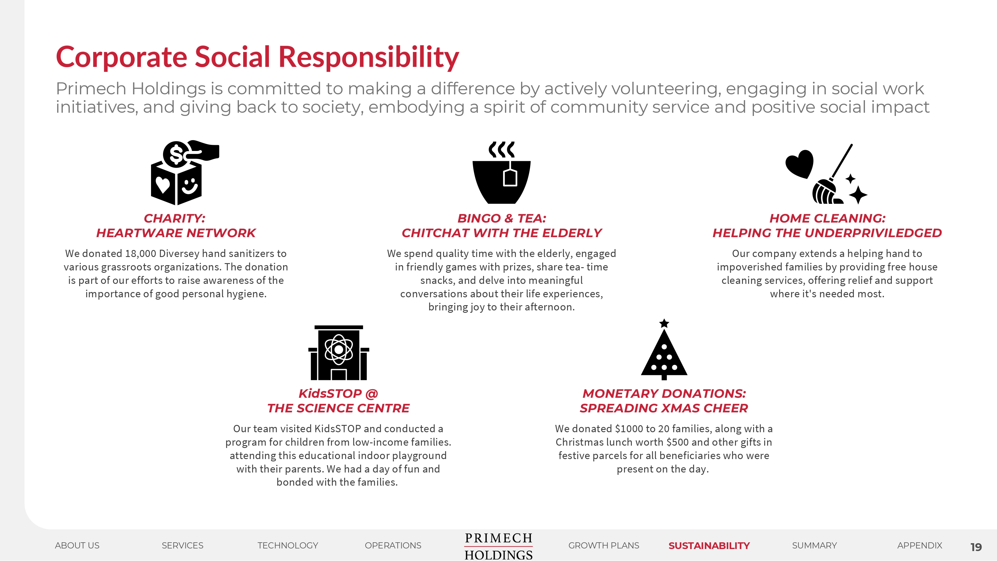 Corporate Social Responsibility Primech Holdings is committed to making a difference by actively volunteering, engaging in social work initiatives, and giving back to society, embodying a spirit of community service and positive social impact CHARITY: HEARTWARE NETWORK We donated 18,000 Diversey hand sanitizers to various grassroots organizations. The donation is part of our efforts to raise awareness of the importance of good personal hygiene. KidsSTOP @ THE SCIENCE CENTRE Our team visited KidsSTOP and conducted a program for children from low - income families. attending this educational indoor playground with their parents. We had a day of fun and bonded with the families. BINGO & TEA: CHITCHAT WITH THE ELDERLY We spend quality time with the elderly, engaged in friendly games with prizes, share tea - time snacks, and delve into meaningful conversations about their life experiences, bringing joy to their afternoon. MONETARY DONATIONS: SPREADING XMAS CHEER We donated $1000 to 20 families, along with a Christmas lunch worth $500 and other gifts in festive parcels for all beneficiaries who were present on the day. HOME CLEANING: HELPING THE UNDERPRIVILEDGED Our company extends a helping hand to impoverished families by providing free house cleaning services, offering relief and support where it's needed most.