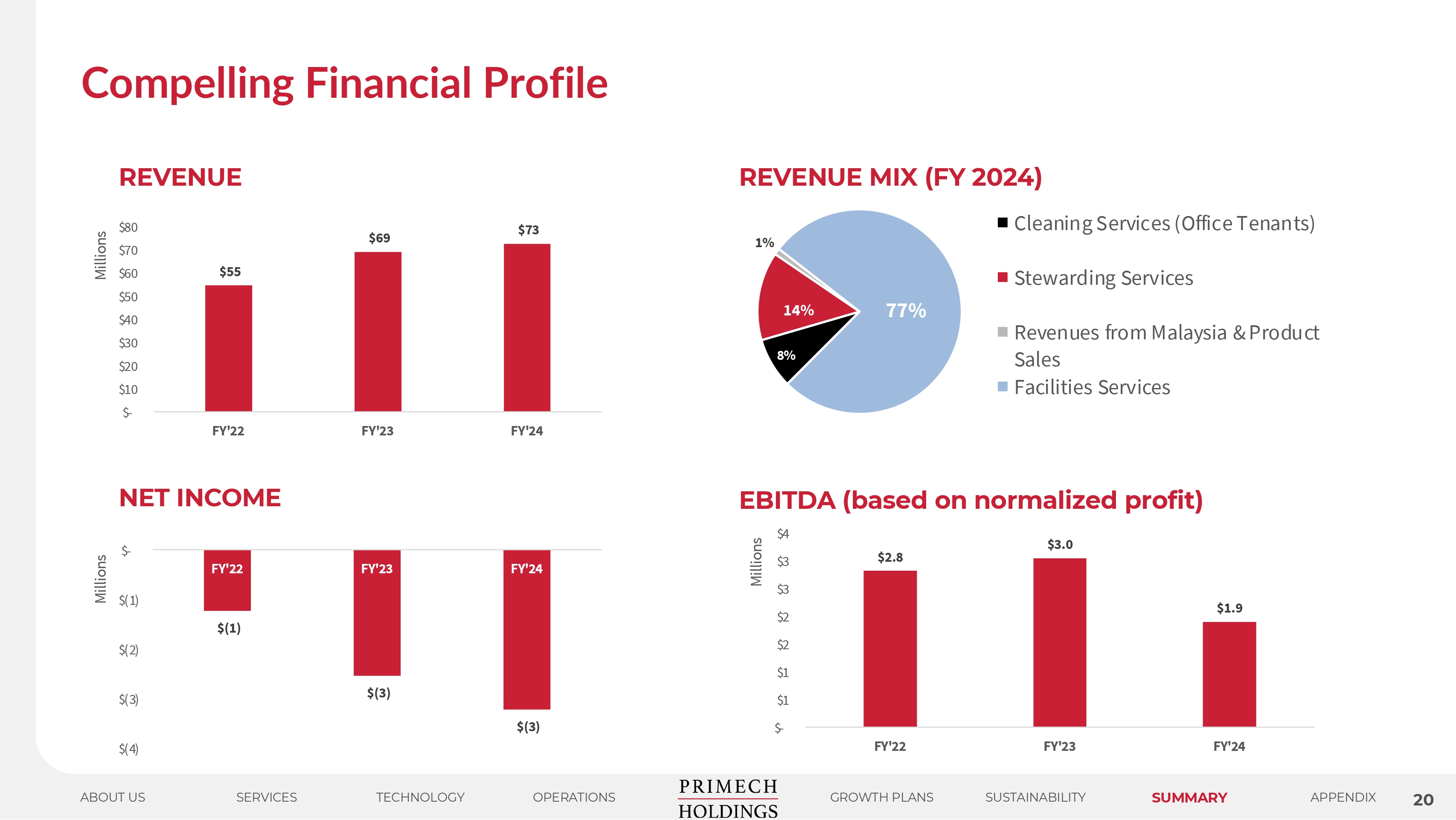 SUMMARY ABOUT US SERVICES TECHNOLOGY OPERATIONS GROWTH PLANS SUSTAINABILITY APPENDIX 19 Compelling Financial Profile REVENUE NET INCOME REVENUE MIX (FY 2024) EBITDA (based on normalized profit) $55 $69 $73 $80 $70 $60 $50 $40 $30 $20 $10 $ - FY'22 FY'23 FY'24 Millions 8% 14% 1% 77% Cleaning Services (Office Tenants) Stewarding Services Revenues from Malaysia & Product Sales Facilities Services $(1) $(3) $(3) $(4) $(3) $(2) $(1) $ - FY'22 FY'23 FY'24 Millions $2.8 SUMMARY ABOUT US SERVICES TECHNOLOGY OPERATIONS GROWTH PLANS SUSTAINABILITY APPENDIX 20 $3.0 $1.9 $3 $3 $2 $2 $1 $1 $ - $4 FY'22 FY'23 FY'24 Millions Key Takeaways Established facilities mgmt.