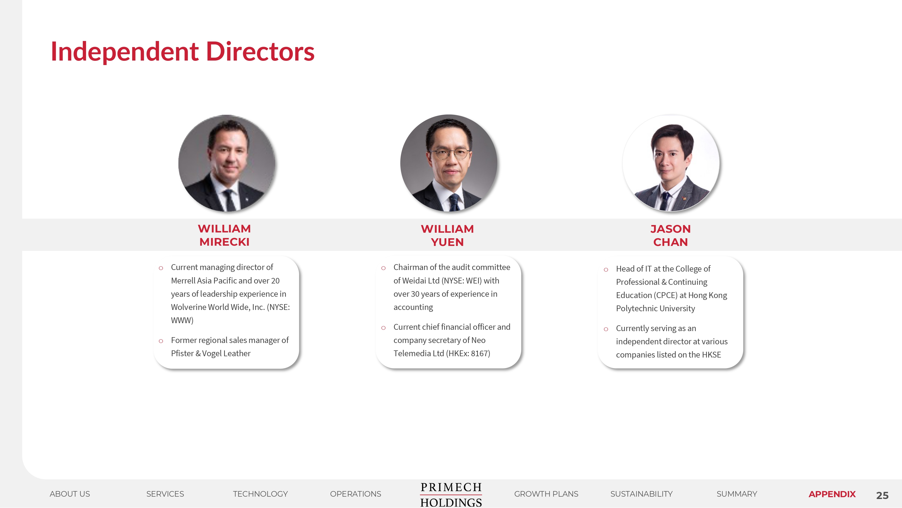 Management Team o Former Chairman of the board of directors and chief executive officer of Jimu Group (HKEx: 8187) o Former independent director of Lapco Holdings Limited (HKEx: 8472) APPENDIX ABOUT US SERVICES TECHNOLOGY OPERATIONS GROWTH PLANS SUSTAINABILITY SUMMARY 24 KIN WAI HO CEO & Director HANSEL LOO Senior Vice President KHAZID OMAR Senior Vice President KIT YU LEE Chief Financial Officer YEW JIN SNG Senior Vice President o Joined Primech Services & Engrg Pte Ltd as the chief operating officer and was promoted to senior vice president of Primech Holdings o Former director of housekeeping of Fairmont Hotel Singapore o Joined Maint - Kleen (now a subsidiary of Primech Holdings) in 2002 as a senior vice president and was appointed to executive director o Former chief financial officer of Fit Boxx Holdings Ltd o Former deputy chief financial officer and financial controller of Jimu Group (HKEx: 8187) o Former audit manager at Deloitte Touche Tohmatsu o Served as the chief executive officer of Primech Services & Engrg Pte Ltd o Founded Megapact Agencies/Systems Services o Former general manager of Datacom Services o Former systems manager of NCR Corporation (NYSE: NCR)