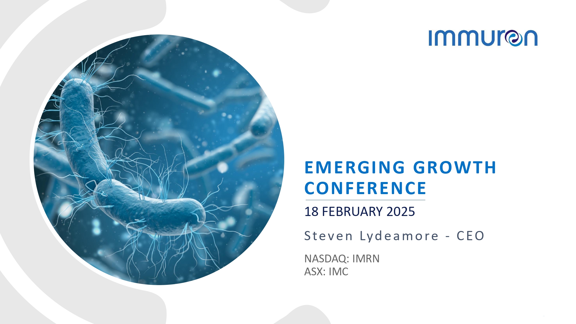 Melbourne, Australia, February 19, 2025: Immuron Limited (ASX: IMC; NASDAQ: IMRN) is pleased to advise our Chief Executive Officer, Steven Lydeamore presented virtually at the Emerging Growth Conference on Tuesday 18th February 2025 (10.50am U.S. Eastern time).