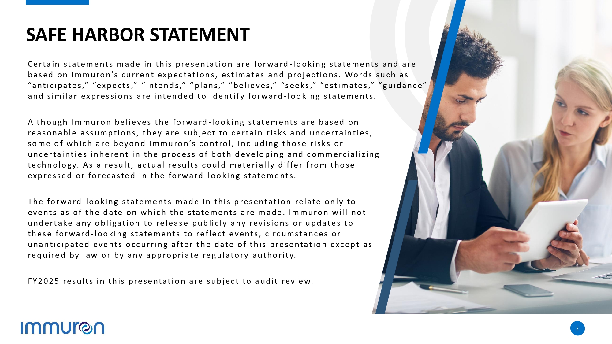 Words such as “anticipates,” “expects,” “ intends,” “ plans,” “ believes,” “ seeks,” “estimates,” “guidance” and s imilar expressions are intended to identify forward - looking statements. Although Immuron believes the forward - looking statements are based on reasonable assumptions, they are subject to certain r i sks and uncertainties, some of which are beyond Immuron’s control, including those r i sks or uncertainties inherent in the process of both developing and commercializing technology. As a result, actual results could materially differ f rom those expressed or forecasted in the forward - looking statements. The forward - looking statements made in this presentation relate only to events as of the date on which the statements are made. Immuron will not undertake any obligation to release publicly any revisions or updates to these forward - looking statements to reflect events, c i rcumstances or unanticipated events occurring after the date of this presentation except as required by law or by any appropriate regulatory authority. FY 2025 results in this presentation are subject to audit review.