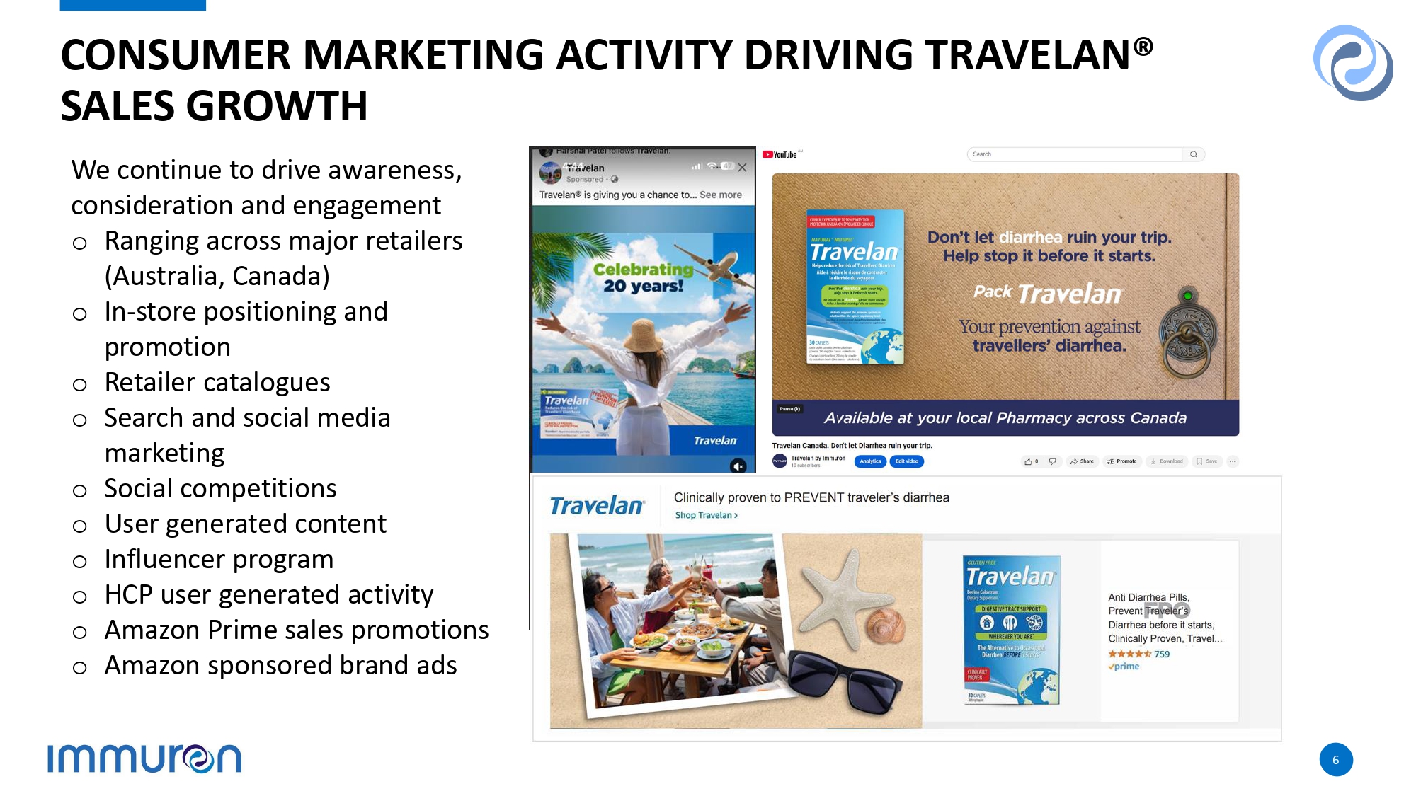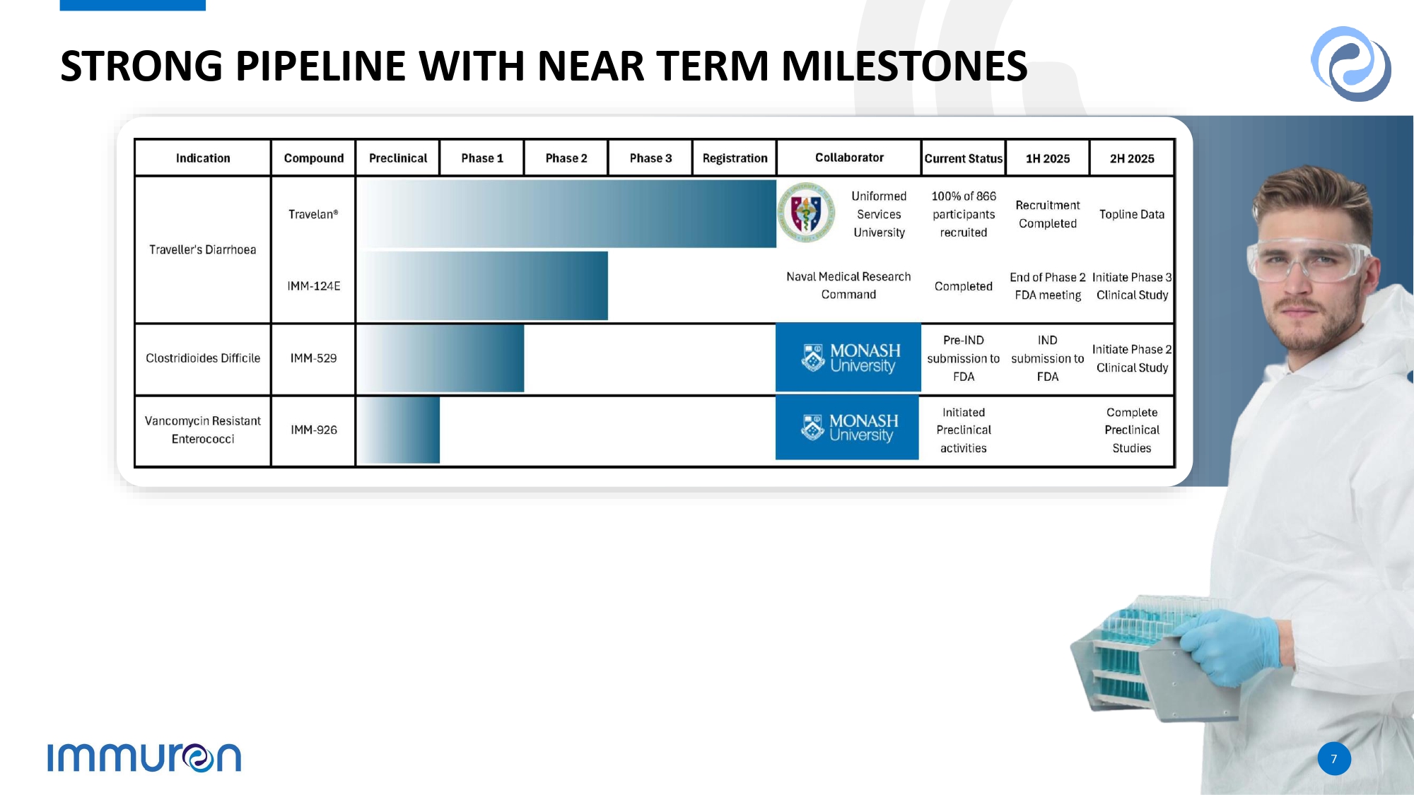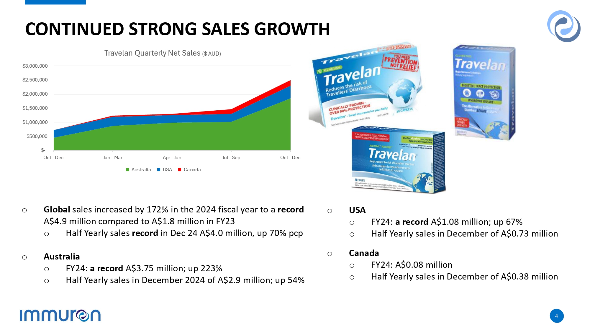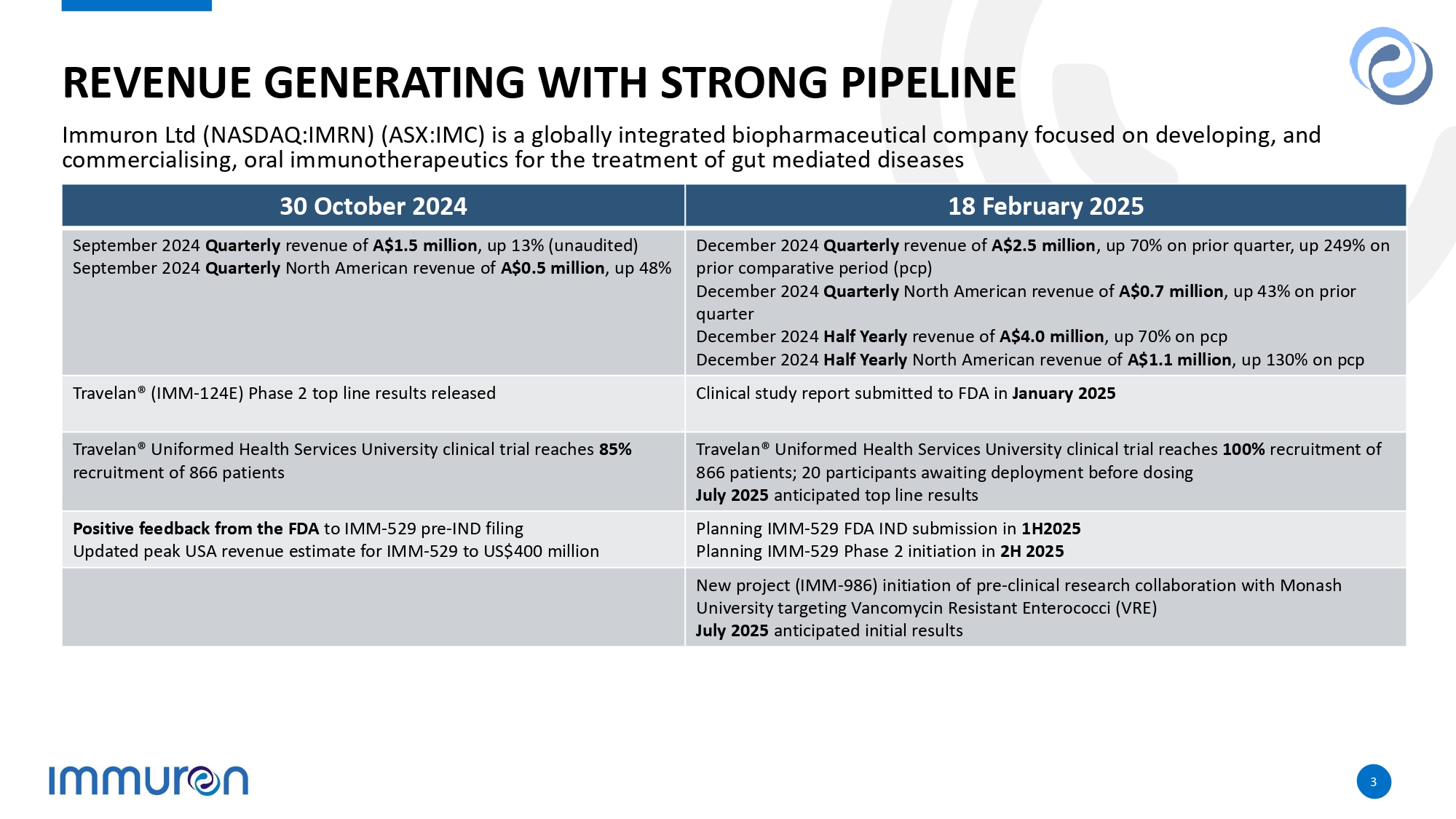 2 SAFE HARBOR STATEMENT REVENUE GENERATING WITH STRONG PIPELINE 3 Immuron Ltd (NASDAQ:IMRN) (ASX:IMC) is a globally integrated biopharmaceutical company focused on developing, and commercialising, oral immunotherapeutics for the treatment of gut mediated diseases 18 February 2025 30 October 2024 December 2024 Quarterly revenue of A$2.5 million , up 70% on prior quarter, up 249% on prior comparative period (pcp) December 2024 Quarterly North American revenue of A$0.7 million , up 43% on prior quarter December 2024 Half Yearly revenue of A$4.0 million , up 70% on pcp December 2024 Half Yearly North American revenue of A$1.1 million , up 130% on pcp September 2024 Quarterly revenue of A$1.5 million , up 13% (unaudited) September 2024 Quarterly North American revenue of A$0.5 million , up 48% Clinical study report submitted to FDA in January 2025 Travelan® (IMM - 124E) Phase 2 top line results released Travelan® Uniformed Health Services University clinical trial reaches 100% recruitment of 866 patients; 20 participants awaiting deployment before dosing July 2025 anticipated top line results Travelan® Uniformed Health Services University clinical trial reaches 85% recruitment of 866 patients Planning IMM - 529 FDA IND submission in 1H2025 Planning IMM - 529 Phase 2 initiation in 2H 2025 Positive feedback from the FDA to IMM - 529 pre - IND filing Updated peak USA revenue estimate for IMM - 529 to US$400 million New project (IMM - 986) initiation of pre - clinical research collaboration with Monash University targeting Vancomycin Resistant Enterococci (VRE) July 2025 anticipated initial results CONTINUED STRONG SALES GROWTH o Global sales increased by 172% in the 2024 fiscal year to a record A$4.9 million compared to A$1.8 million in FY23 o Half Yearly sales record in Dec 24 A$4.0 million, up 70% pcp o Australia o FY24: a record A$3.75 million; up 223% o Half Yearly sales in December 2024 of A$2.9 million; up 54% o USA o FY24: a record A$1.08 million; up 67% o Half Yearly sales in December of A$0.73 million o Canada o FY24: A$0.08 million o Half Yearly sales in December of A$0.38 million 4