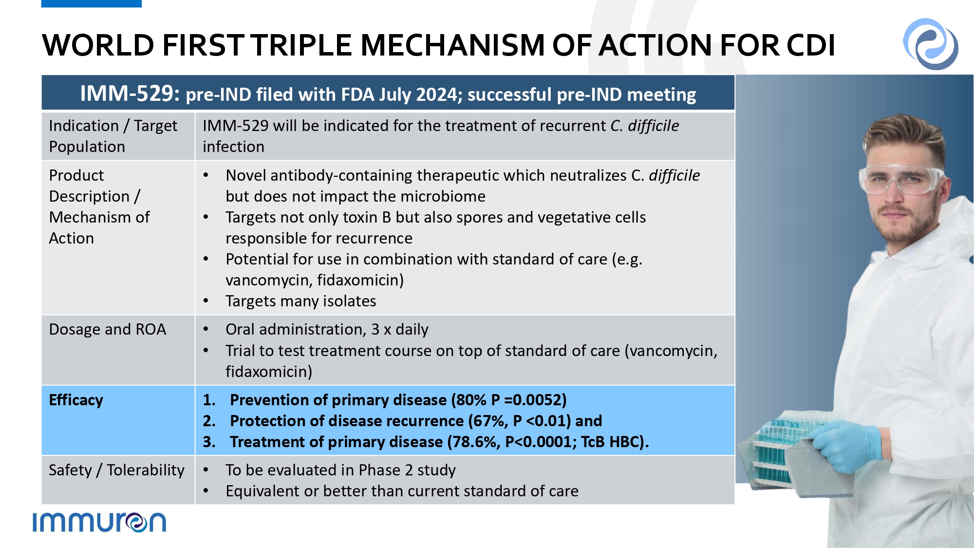 WORLD FIRST TRIPLE MECHANISM OF ACTION FOR CDI IMM - 529: pre - IND filed with FDA July 2024; successful pre - IND meeting IMM - 529 will be indicated for the treatment of recurrent C. difficile infection Indication / Target Population • Novel antibody - containing therapeutic which neutralizes C. difficile but does not impact the microbiome • Targets not only toxin B but also spores and vegetative cells responsible for recurrence • Potential for use in combination with standard of care (e.g. vancomycin, fidaxomicin) • Targets many isolates Product Description / Mechanism of Action • Oral administration, 3 x daily • Trial to test treatment course on top of standard of care (vancomycin, fidaxomicin) Dosage and ROA 1. Prevention of primary disease (80% P =0.0052) 2. Protection of disease recurrence (67%, P <0.01) and 3. Treatment of primary disease (78.6%, P<0.0001; TcB HBC).