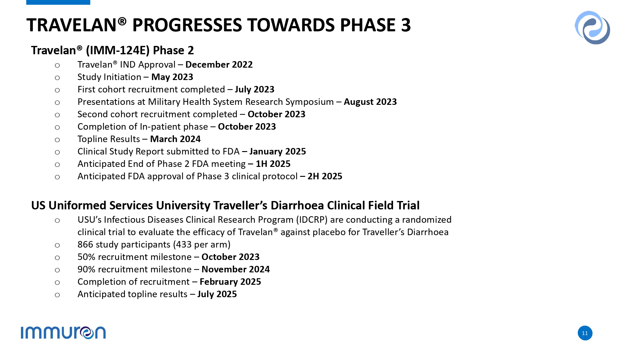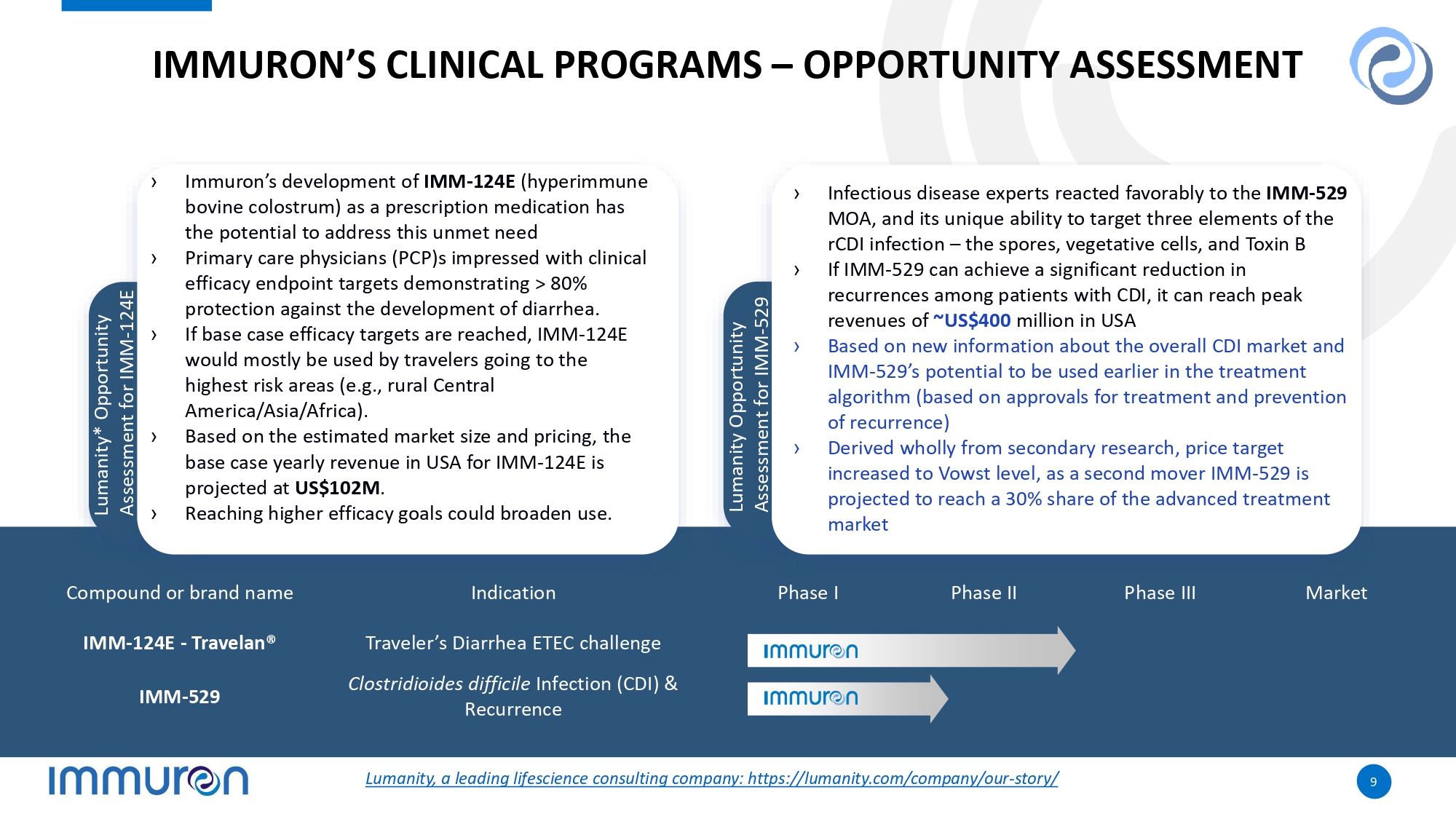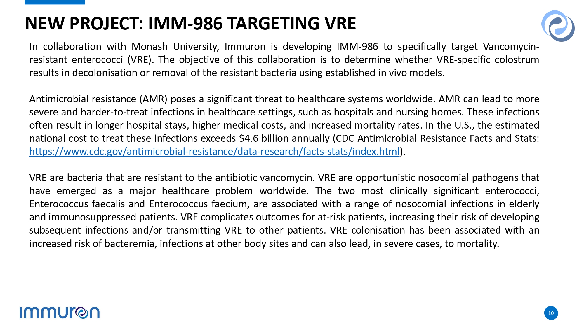 Lu m C a o n r i t p y o * r a O t e p p ortuni t y Assessment for IMM - 124E › Infectious disease experts reacted favorably to the IMM - 529 MOA, and its unique ability to target three elements of the rCDI infection – the spores, vegetative cells, and Toxin B › If IMM - 529 can achieve a significant reduction in recurrences among patients with CDI, it can reach peak revenues of ~US$400 million in USA › Based on new information about the overall CDI market and IMM - 529’s potential to be used earlier in the treatment algorithm (based on approvals for treatment and prevention of recurrence) › Derived wholly from secondary research, price target increased to Vowst level, as a second mover IMM - 529 is projected to reach a 30% share of the advanced treatment market Lu m C a o n r i p t y o r O a p t e por t uni t y Assessment for IMM - 529 Market Phase III Phase II Phase I Indication Compound or brand name Traveler’s Diarrhea ETEC challenge IMM - 124E - Travelan® Clostridioides difficile Infection (CDI) & Recurrence IMM - 529 Lumanity, a leading lifescience consulting company: https://lumanity.com/company/our - story/ NEW PROJECT: IMM - 986 TARGETING VRE 10 In collaboration with Monash University, Immuron is developing IMM - 986 to specifically target Vancomycin - resistant enterococci (VRE) . The objective of this collaboration is to determine whether VRE - specific colostrum results in decolonisation or removal of the resistant bacteria using established in vivo models . Antimicrobial resistance (AMR) poses a significant threat to healthcare systems worldwide . AMR can lead to more severe and harder - to - treat infections in healthcare settings, such as hospitals and nursing homes . These infections often result in longer hospital stays, higher medical costs, and increased mortality rates . In the U . S . , the estimated national cost to treat these infections exceeds $ 4 . 6 billion annually (CDC Antimicrobial Resistance Facts and Stats : https : //www . cdc . gov/antimicrobial - resistance/data - research/facts - stats/index . html ) . VRE are bacteria that are resistant to the antibiotic vancomycin . VRE are opportunistic nosocomial pathogens that have emerged as a major healthcare problem worldwide . The two most clinically significant enterococci, Enterococcus faecalis and Enterococcus faecium, are associated with a range of nosocomial infections in elderly and immunosuppressed patients . VRE complicates outcomes for at - risk patients, increasing their risk of developing subsequent infections and/or transmitting VRE to other patients . VRE colonisation has been associated with an increased risk of bacteremia, infections at other body sites and can also lead, in severe cases, to mortality .