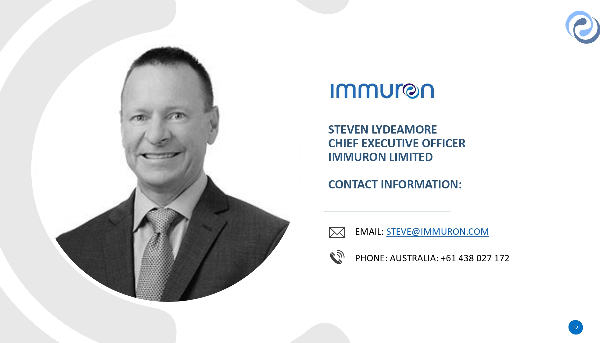TRAVELAN® PROGRESSES TOWARDS PHASE 3 11 Travelan® (IMM - 124E) Phase 2 o Travelan® IND Approval – December 2022 o Study Initiation – May 2023 o First cohort recruitment completed – July 2023 o Presentations at Military Health System Research Symposium – August 2023 o Second cohort recruitment completed – October 2023 o Completion of In - patient phase – October 2023 o Topline Results – March 2024 o Clinical Study Report submitted to FDA – January 2025 o Anticipated End of Phase 2 FDA meeting – 1H 2025 o Anticipated FDA approval of Phase 3 clinical protocol – 2H 2025 US Uniformed Services University Traveller’s Diarrhoea Clinical Field Trial o USU’s Infectious Diseases Clinical Research Program (IDCRP) are conducting a randomized clinical trial to evaluate the efficacy of Travelan® against placebo for Traveller’s Diarrhoea o 866 study participants (433 per arm) o 50% recruitment milestone – October 2023 o 90% recruitment milestone – November 2024 o Completion of recruitment – February 2025 o Anticipated topline results – July 2025 EMAIL: STEVE@IMMURON.COM PHONE: AUSTRALIA: +61 438 027 172 12 STEVEN LYDEAMORE CHIEF EXECUTIVE OFFICER IMMURON LIMITED CONTACT INFORMATION: